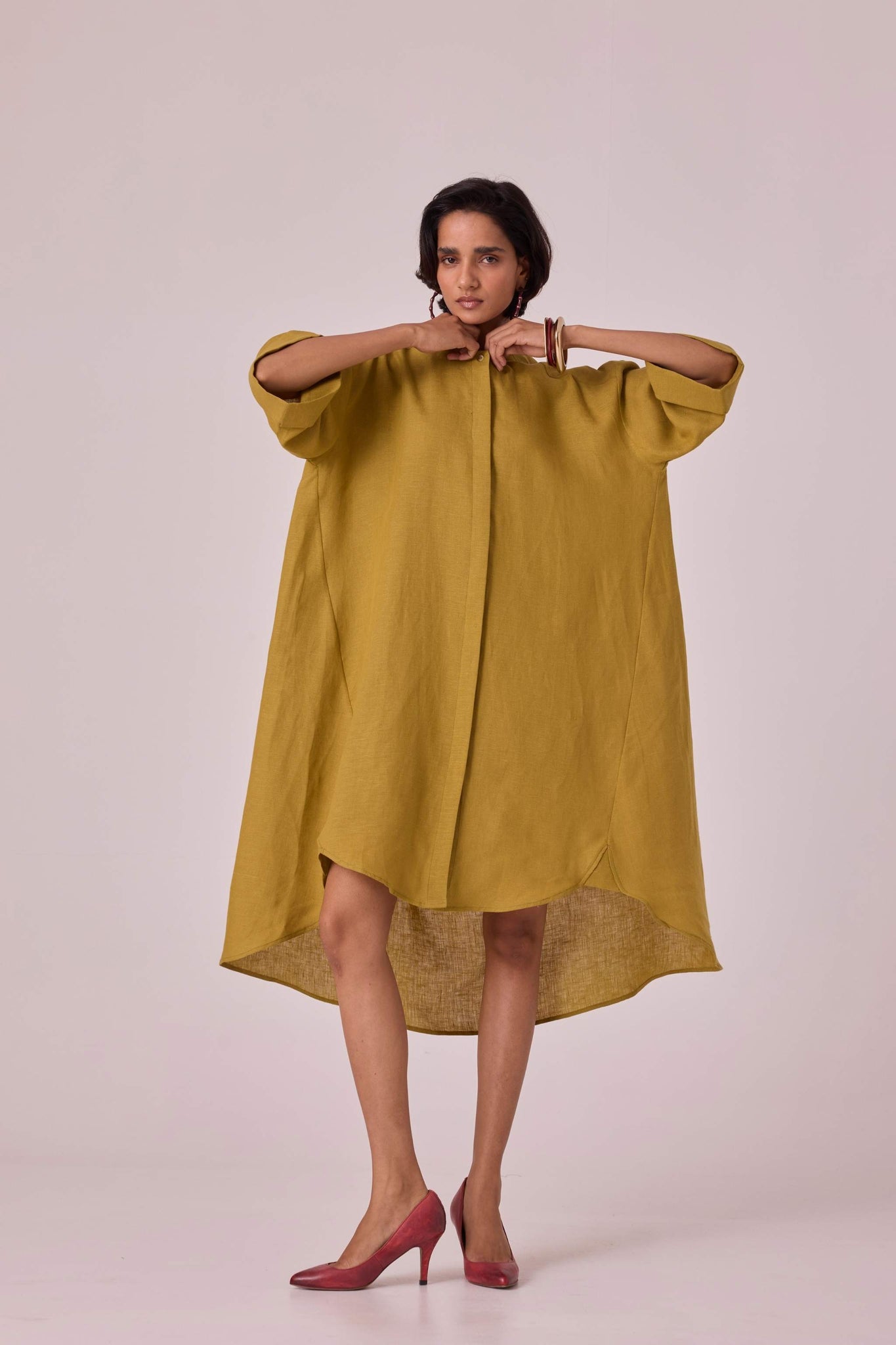 Pure linen tunic in a breezy silhouette. Boxy sleeves and a modish round neck. Curved hemline with a unique gusset detail. Neatly concealed placket with button-through front. The back yoke includes a single inverted pleat for added style. Oversized fit.
