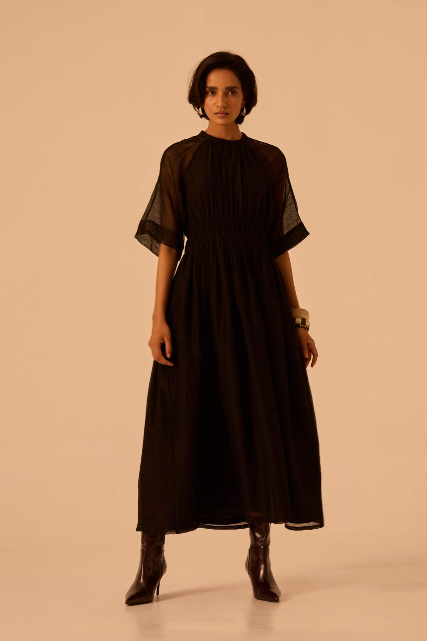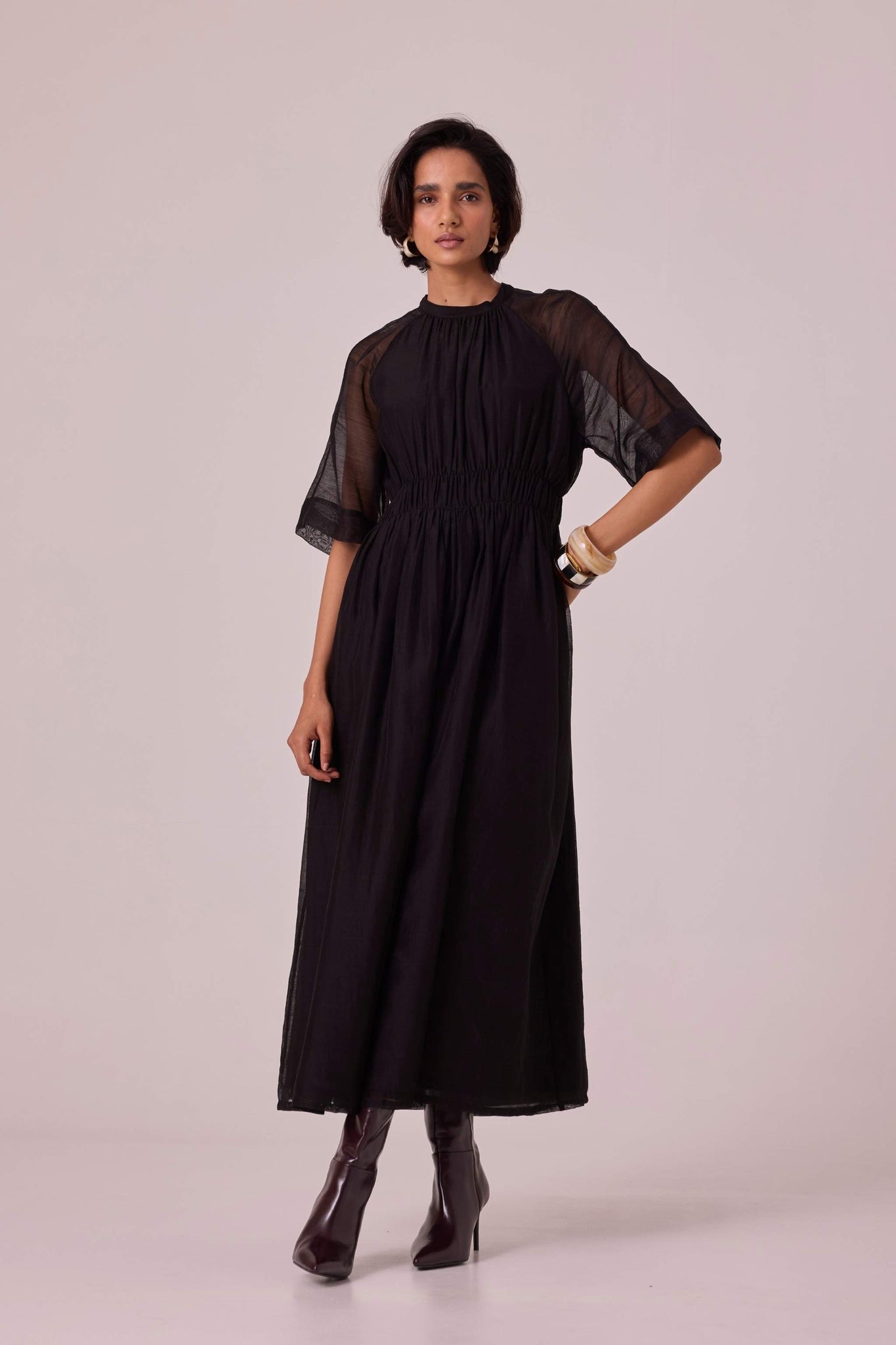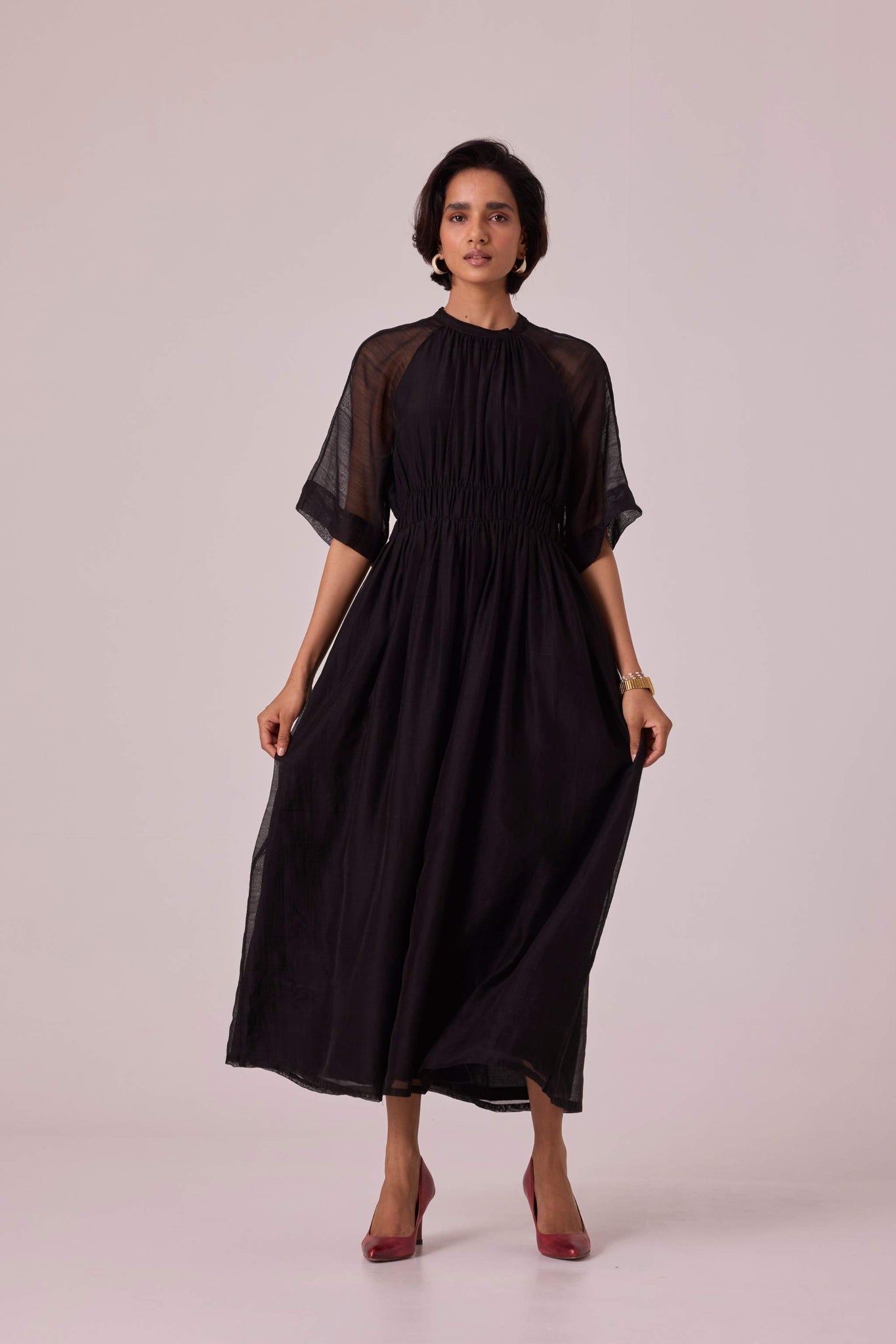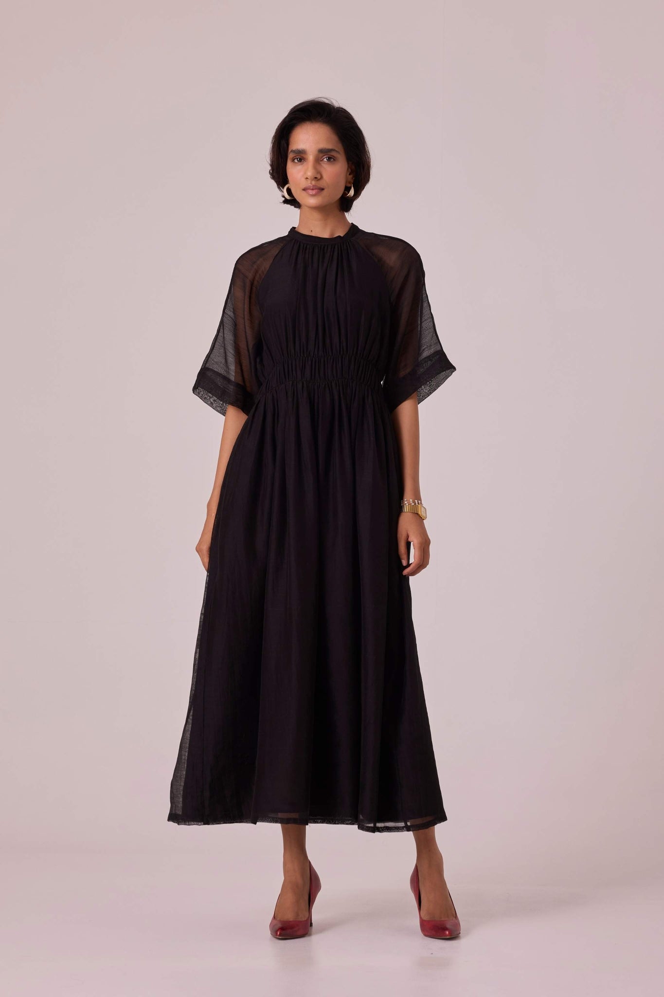 Subliminally crafted from handwoven Chanderi, this is a timeless silhouette. Delicate ruching detail in the front and back to give shape at the waist. This dress draws the waist in subtle folds while keeping the silhouette fluid.