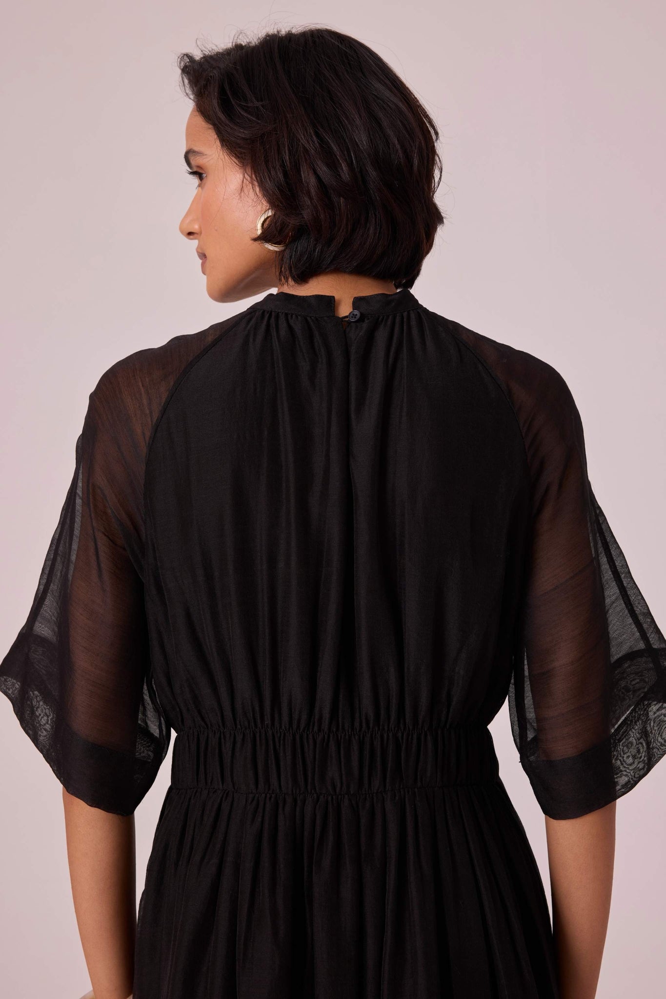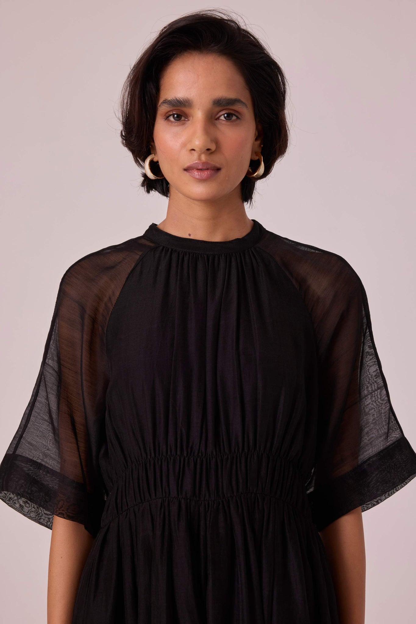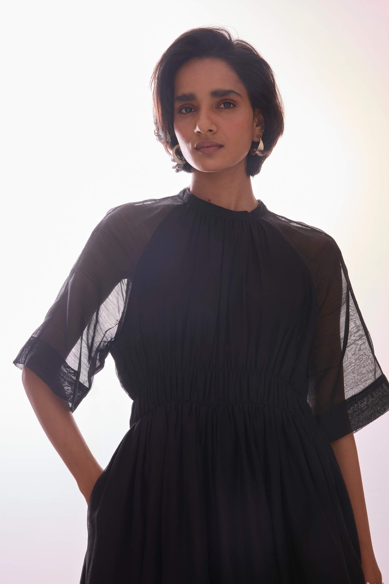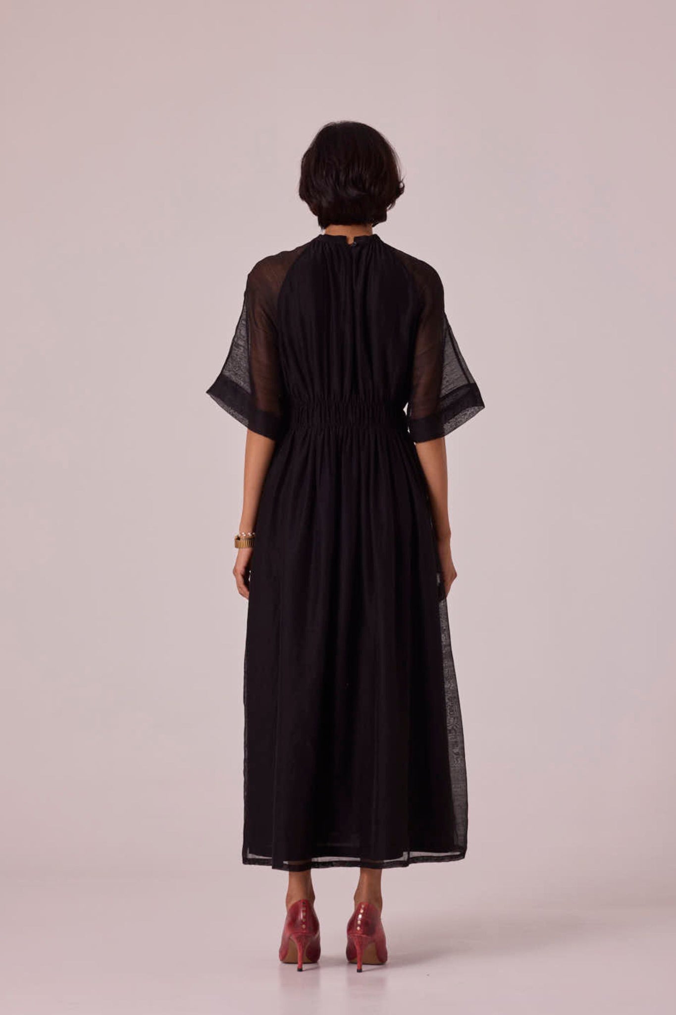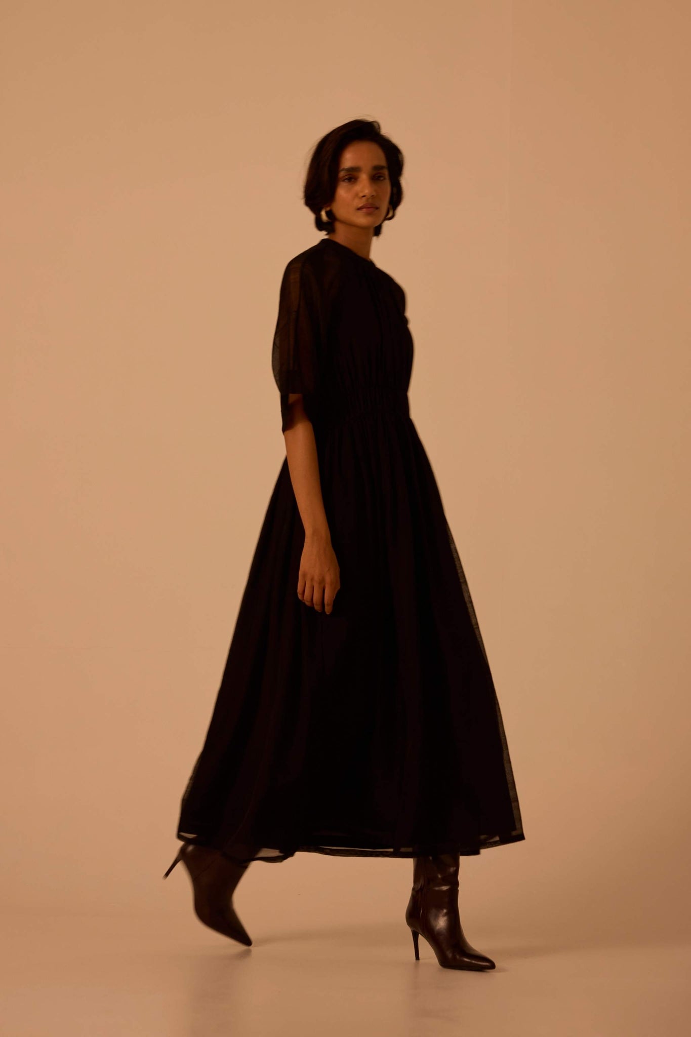 Subliminally crafted from handwoven Chanderi, this is a timeless silhouette. Delicate ruching detail in the front and back to give shape at the waist. This dress draws the waist in subtle folds while keeping the silhouette fluid.