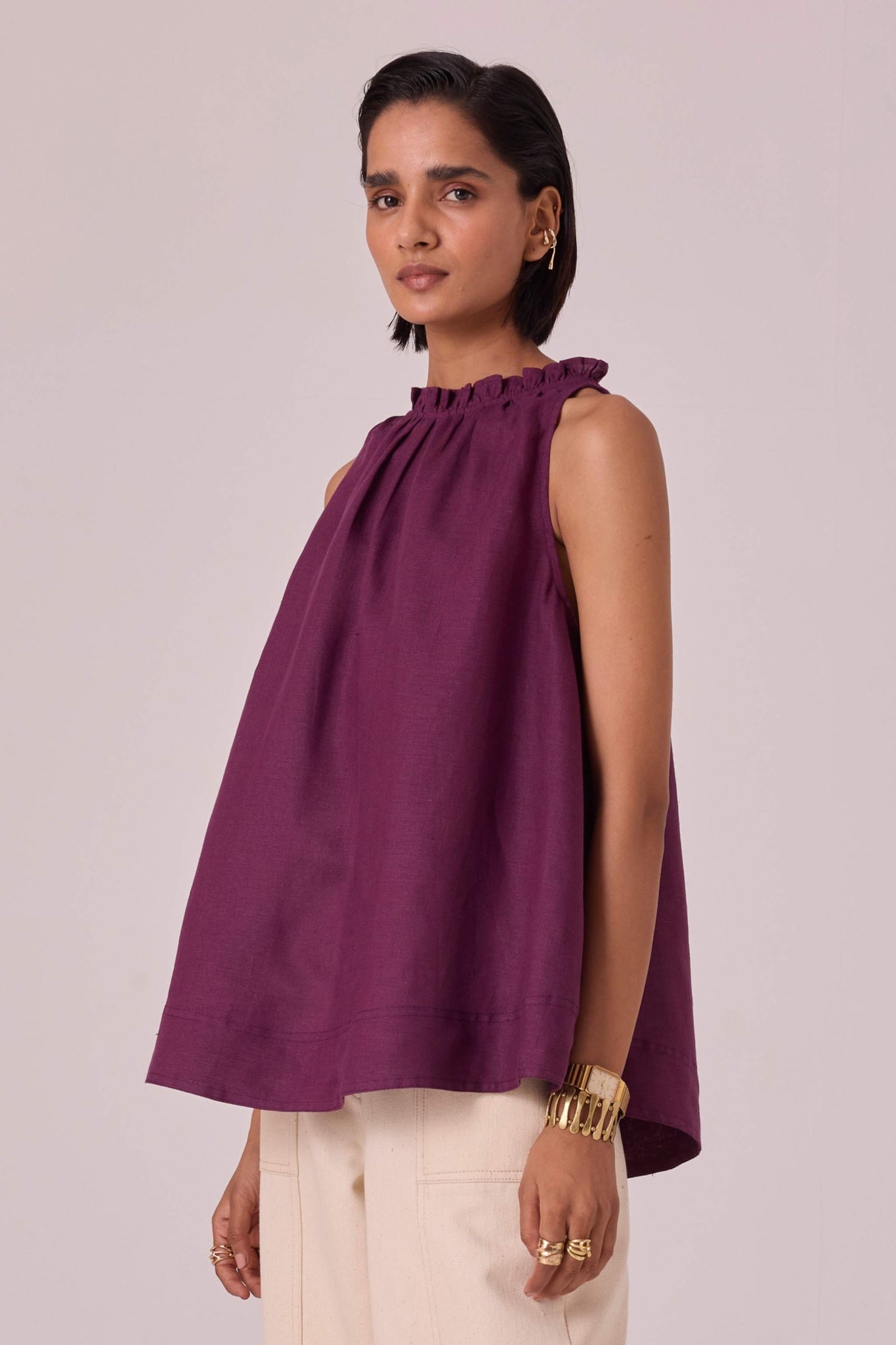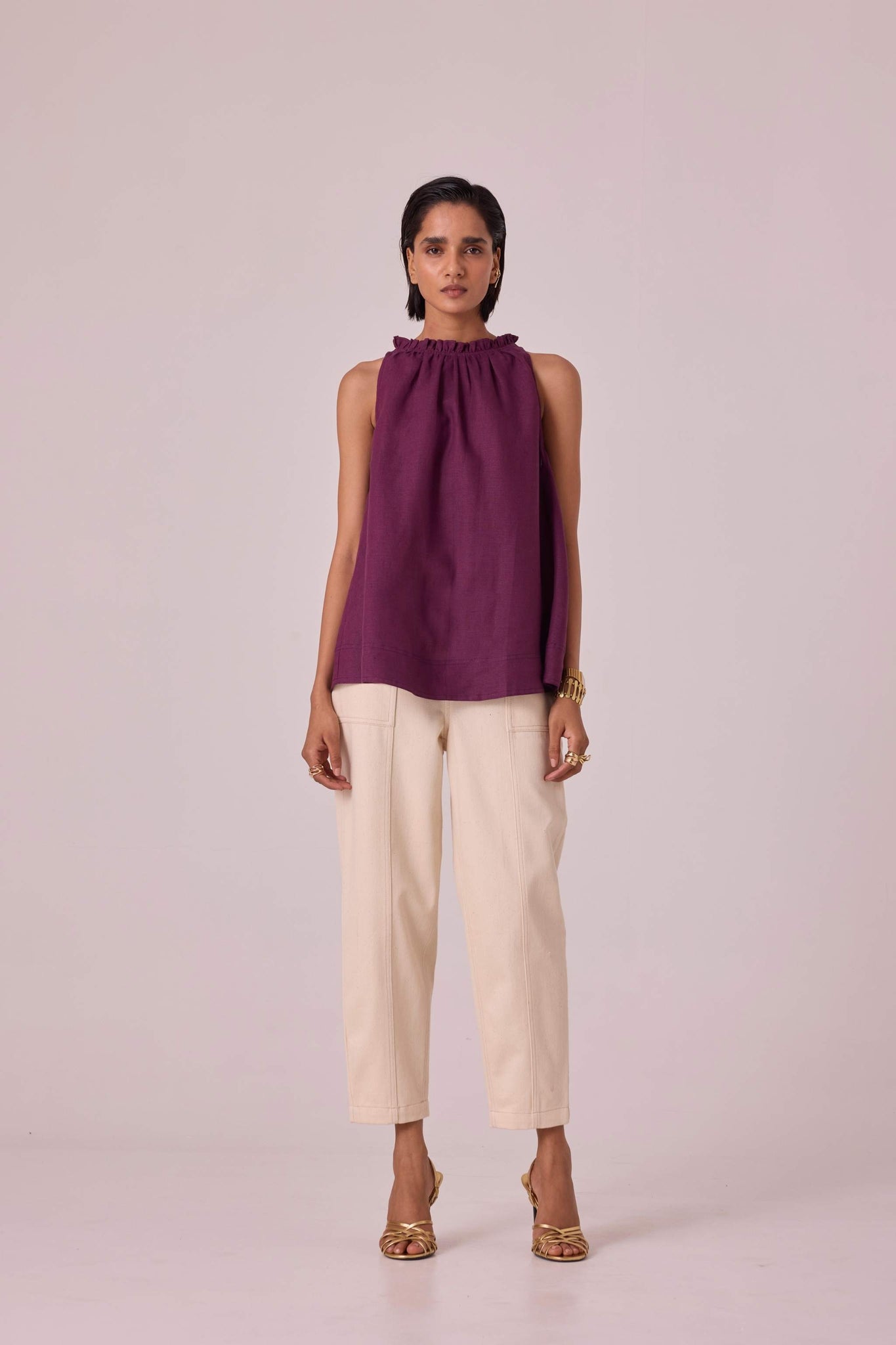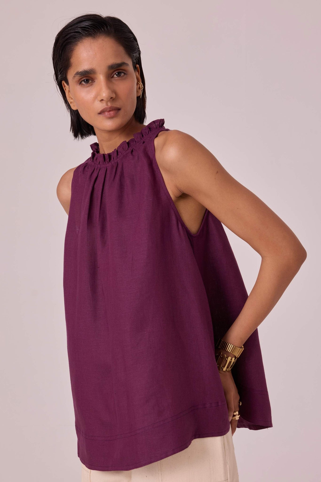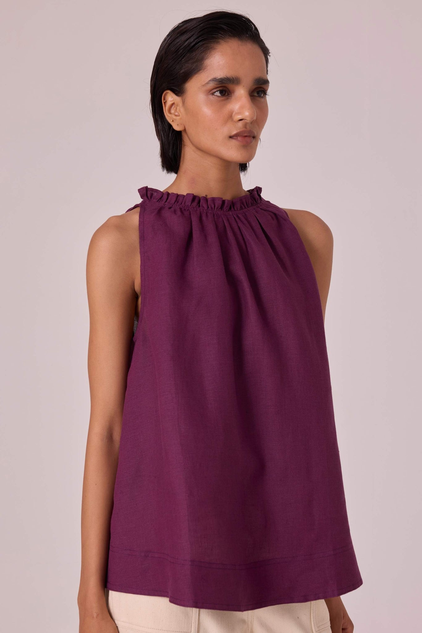 A chic sleeveless halter neck top crafted from linen featuring delightful ruffle details adorning the neckline and a convenient loop button fastening on the back.