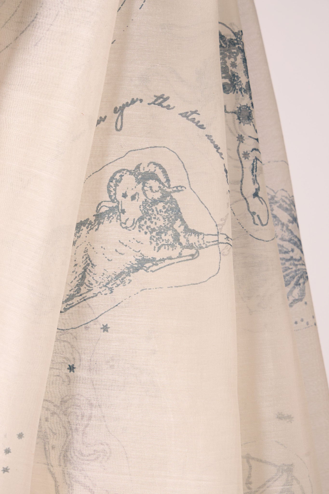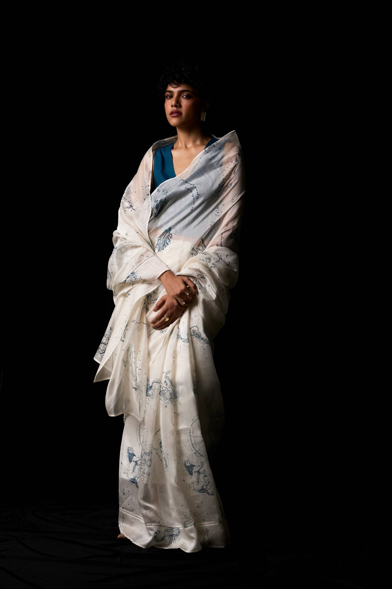 A sari that wears like starlight. Handwoven Chanderi forms a sheer canvas for constellation print, while fagotting detail along the border lends quiet intricacy. Light, fluid, and radiant — it carries six yards of poetry.