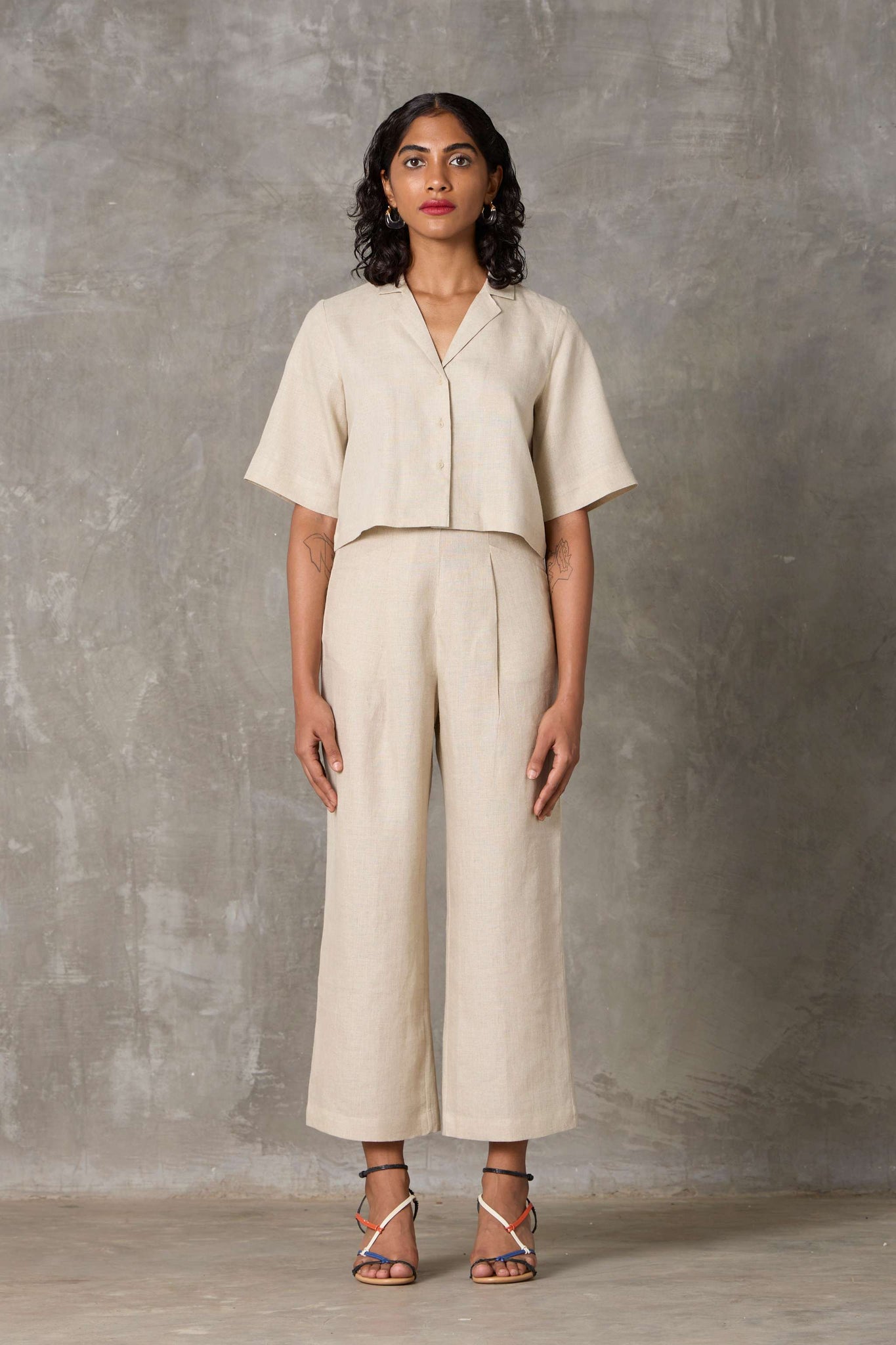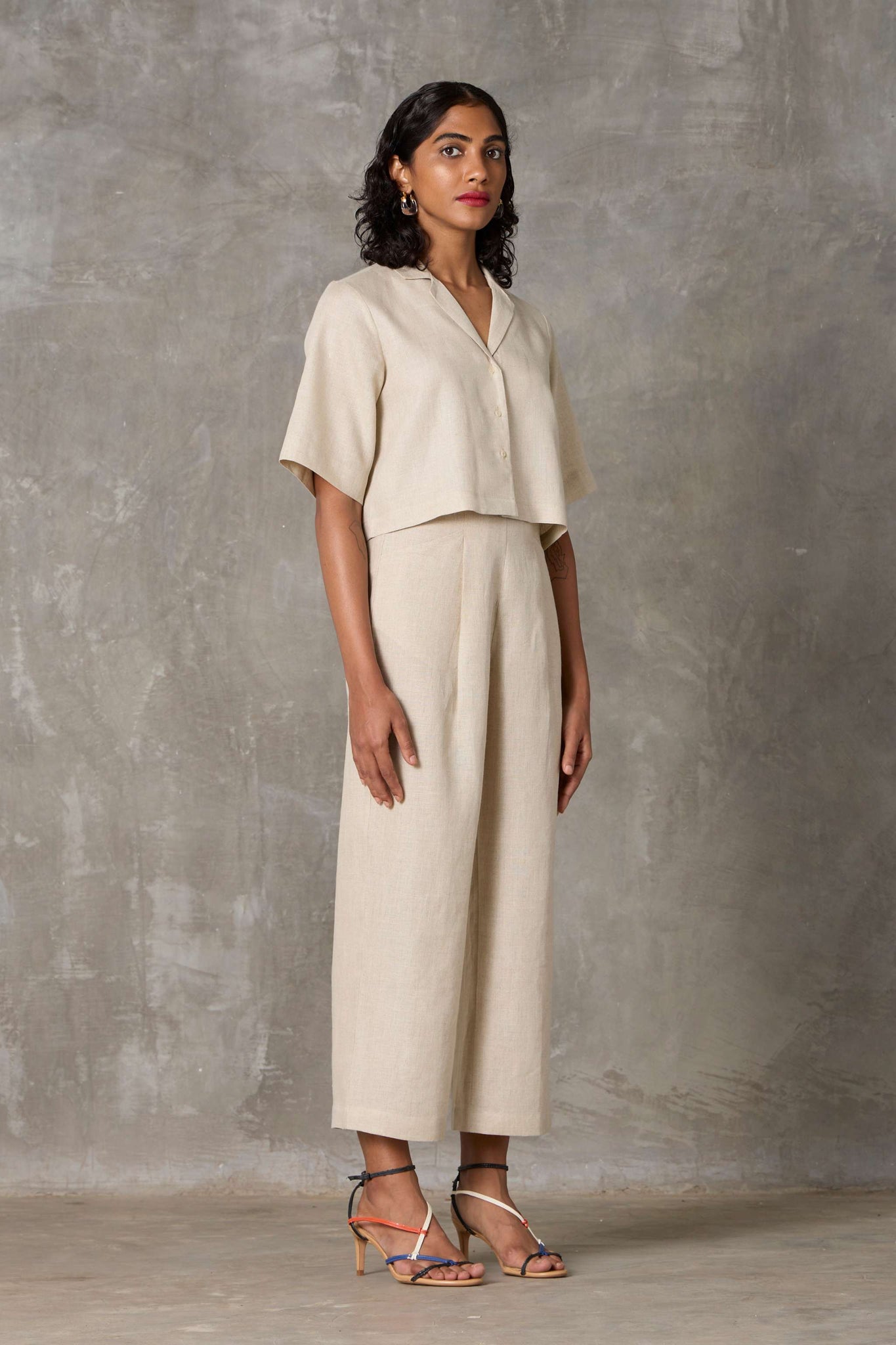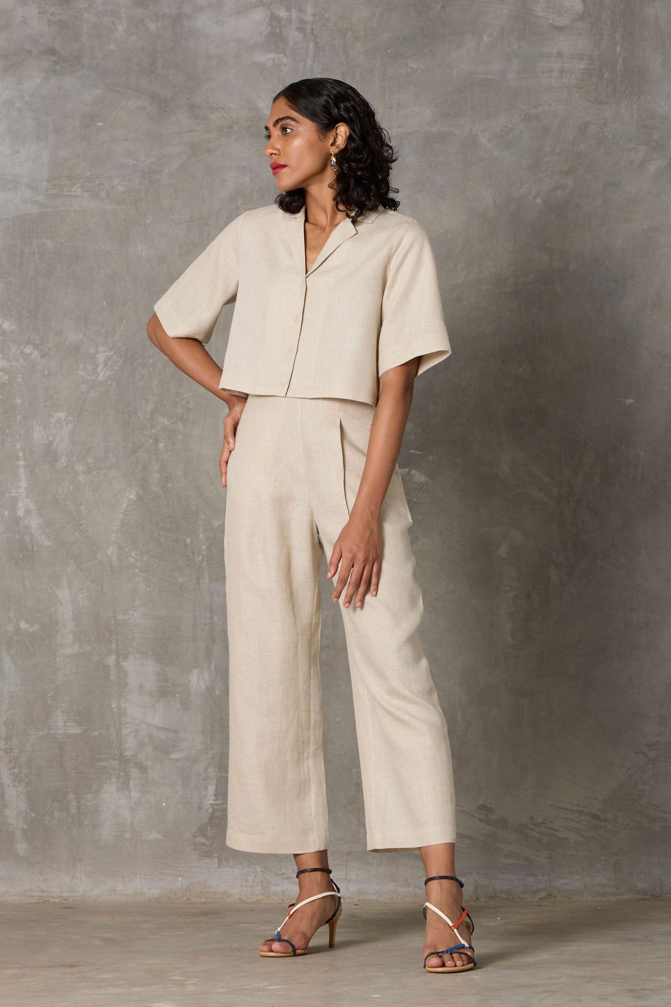 A smart co-ord in lush organic linen. Cropped shirt with set-in sleeves and a notch collar paired elegantly with high-rise straight-leg trousers.
