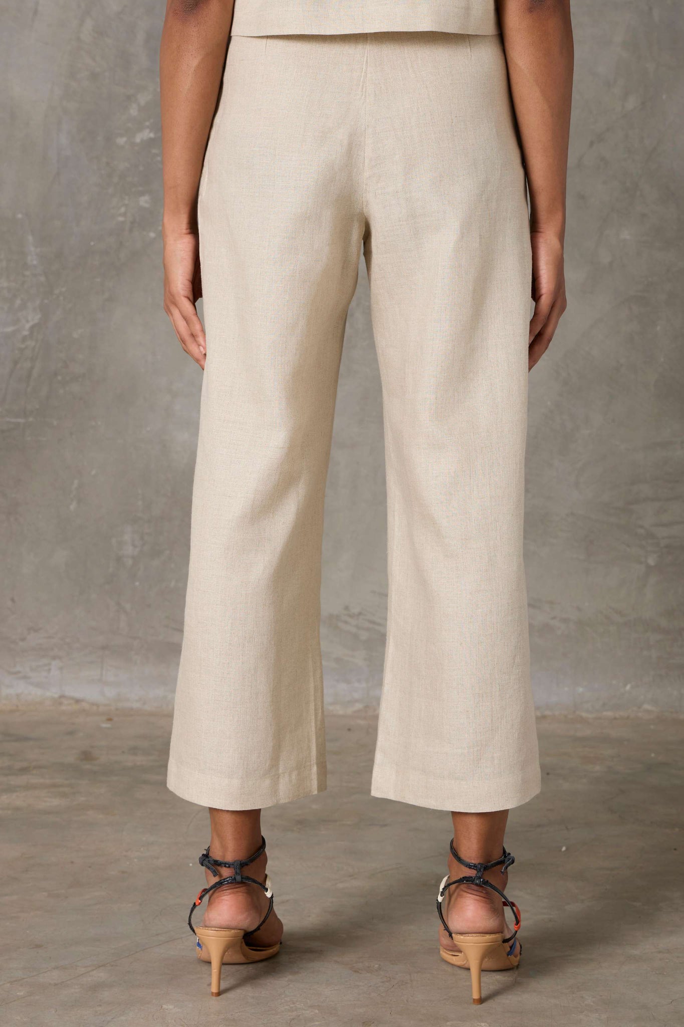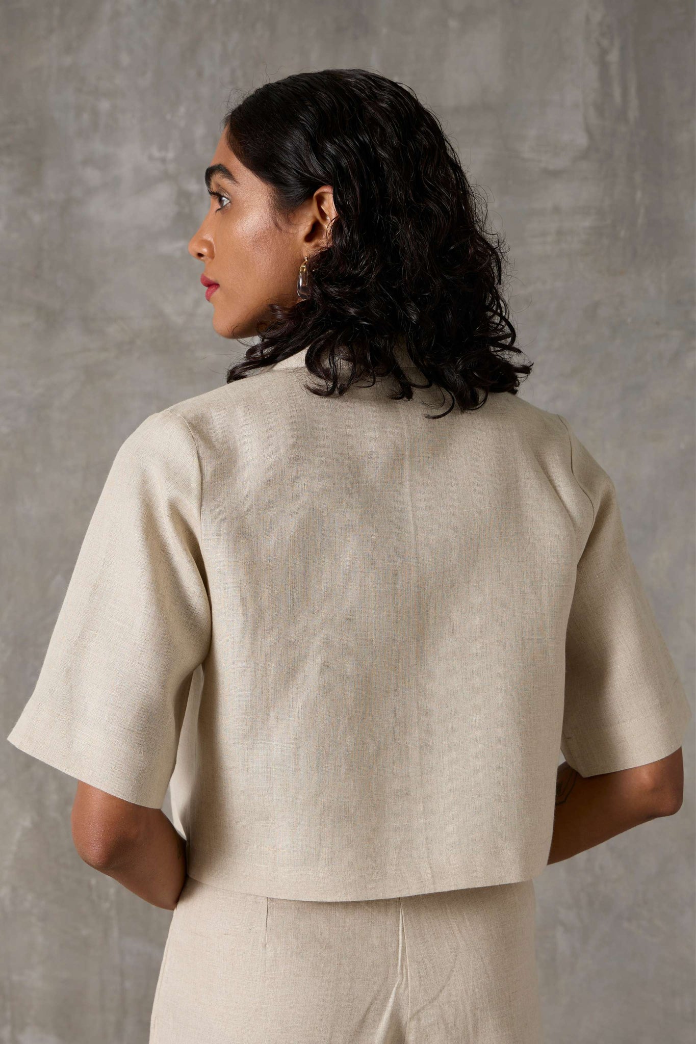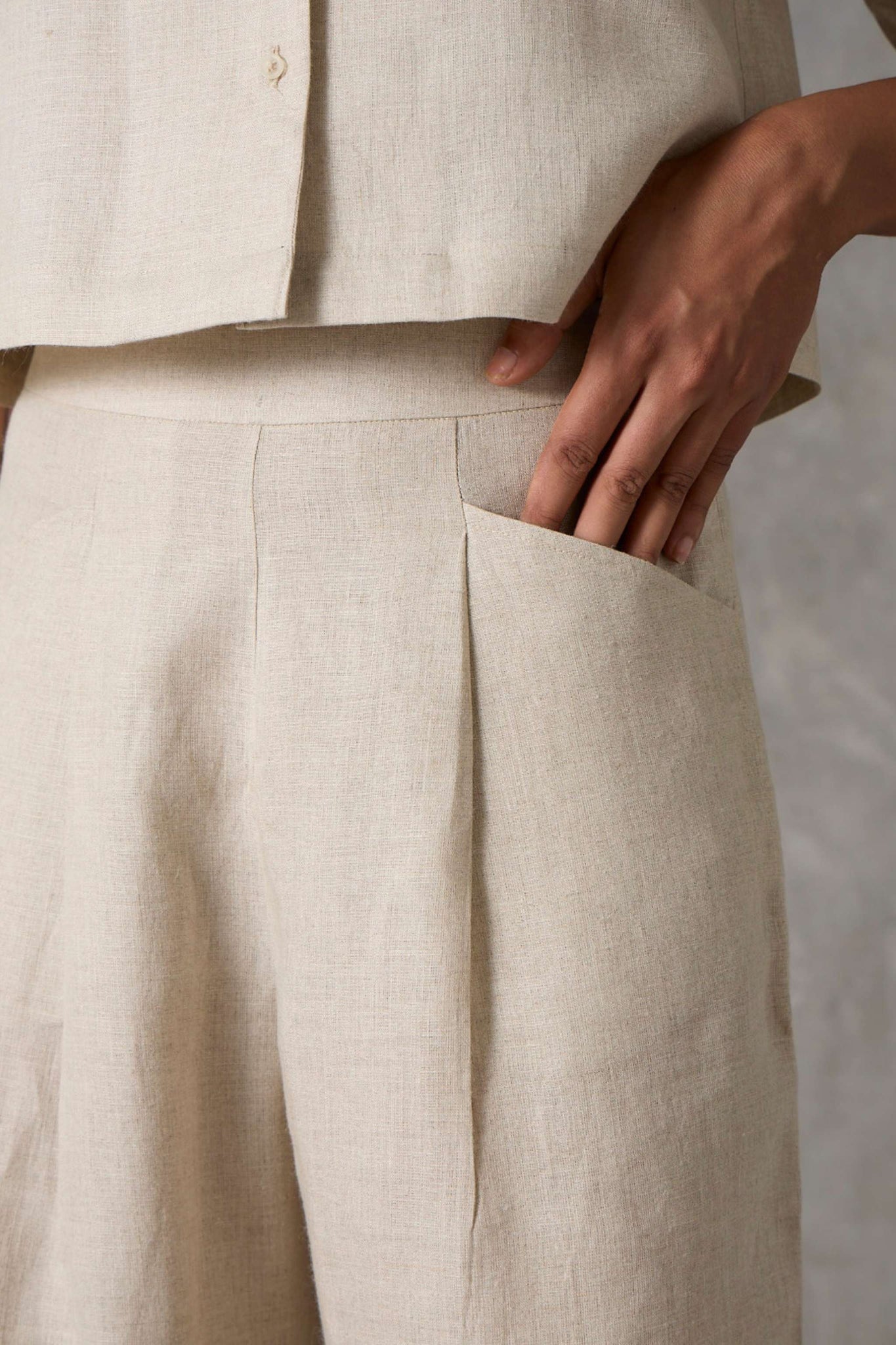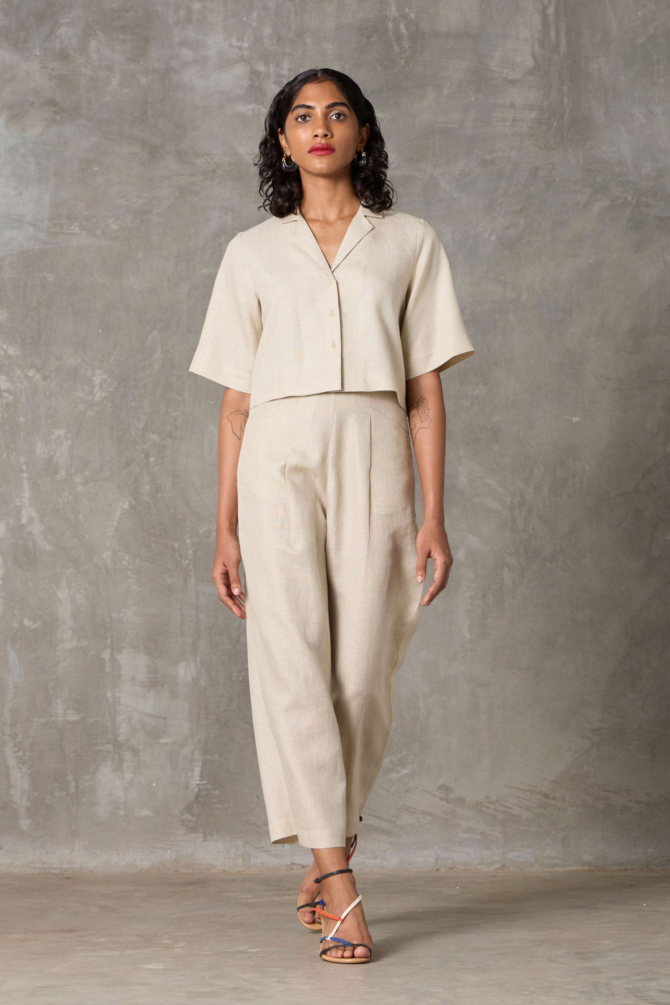 A smart co-ord in lush organic linen. Cropped shirt with set-in sleeves and a notch collar paired elegantly with high-rise straight-leg trousers.