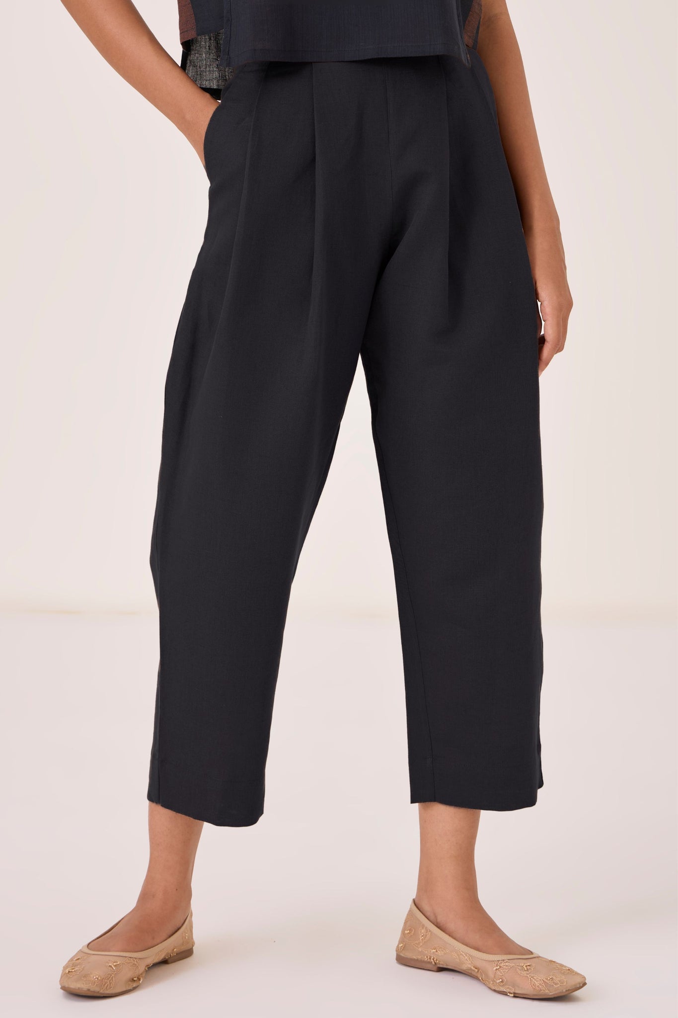 An in-house favourite. Sharply tailored pants. High-rise, crop-length pants. Four crisp front pleats contoured to a slimming waistline. Concealed hook and side zip fastening. Super comfort fit. In-seam pockets.
