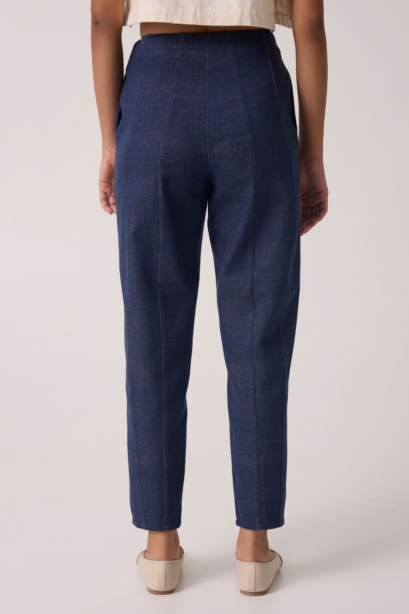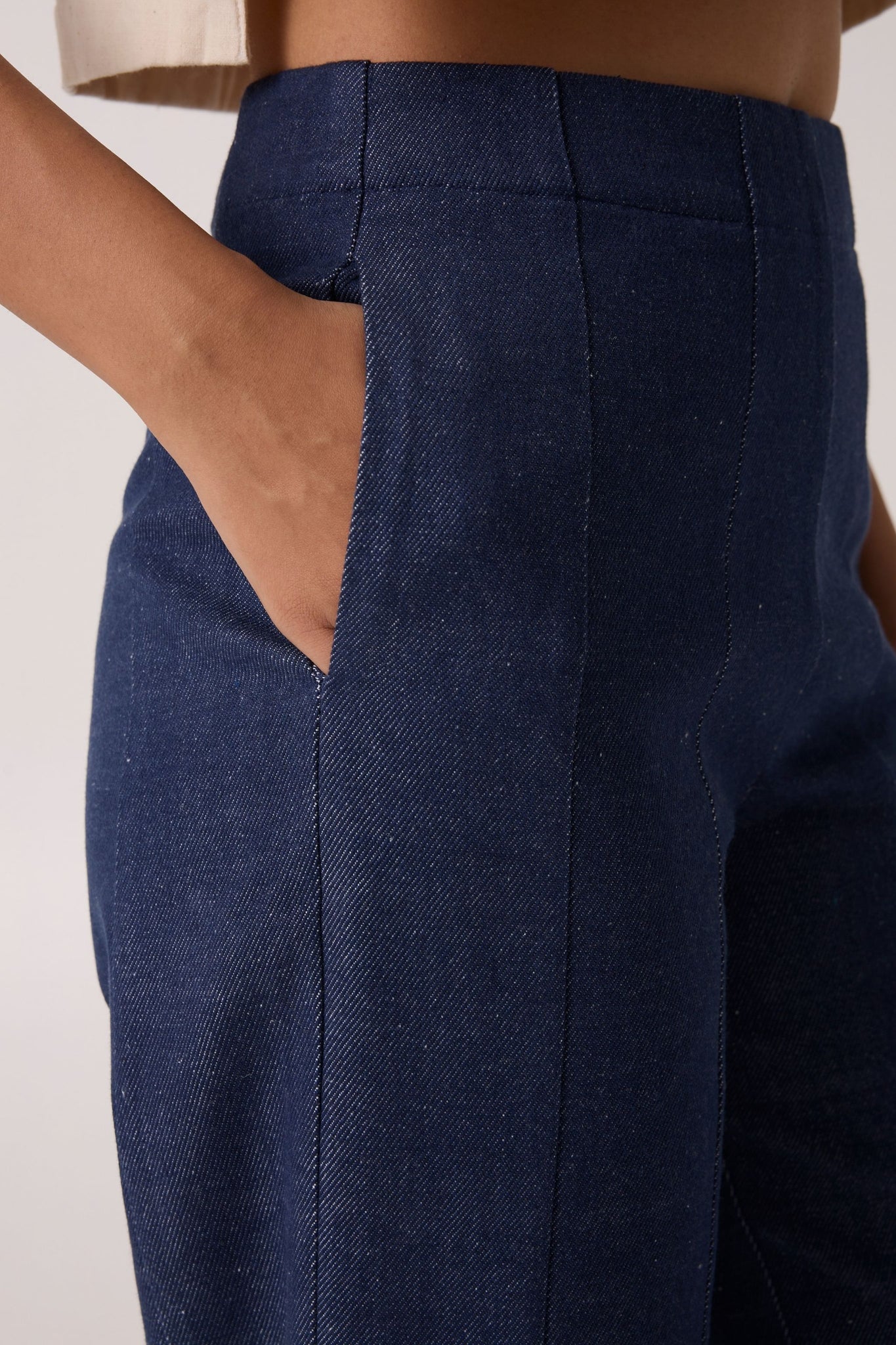 High-rise denim pants with paneling. Inseam pockets and a side zipper fastening.
