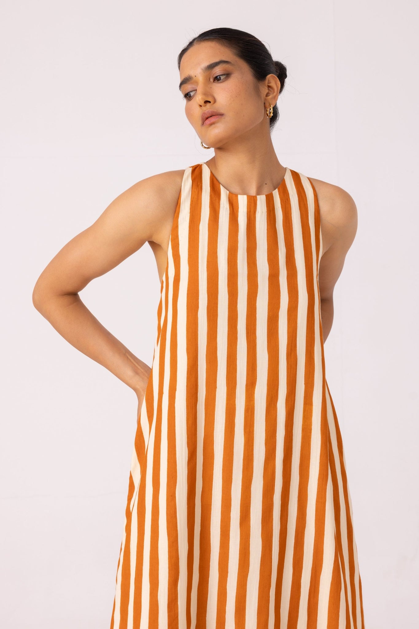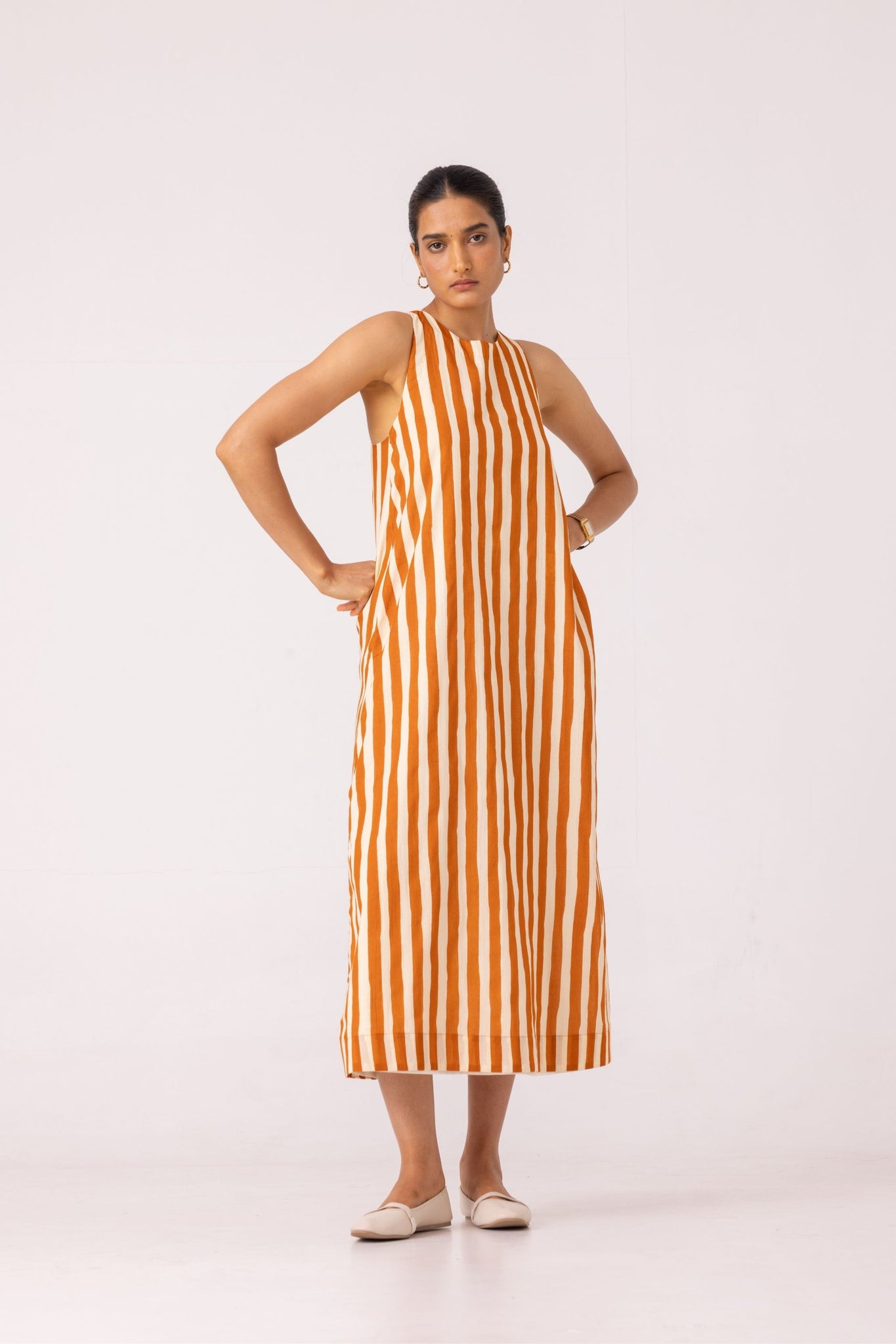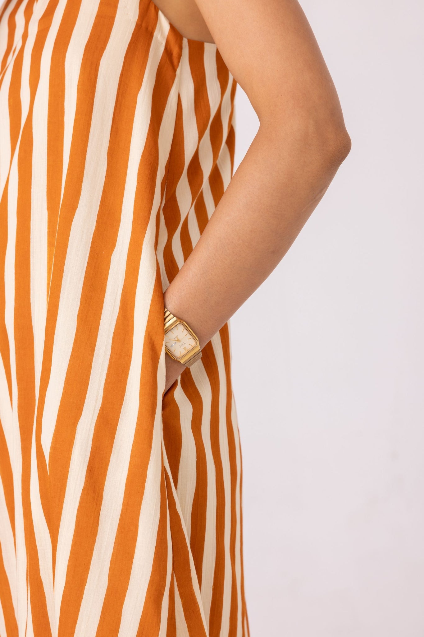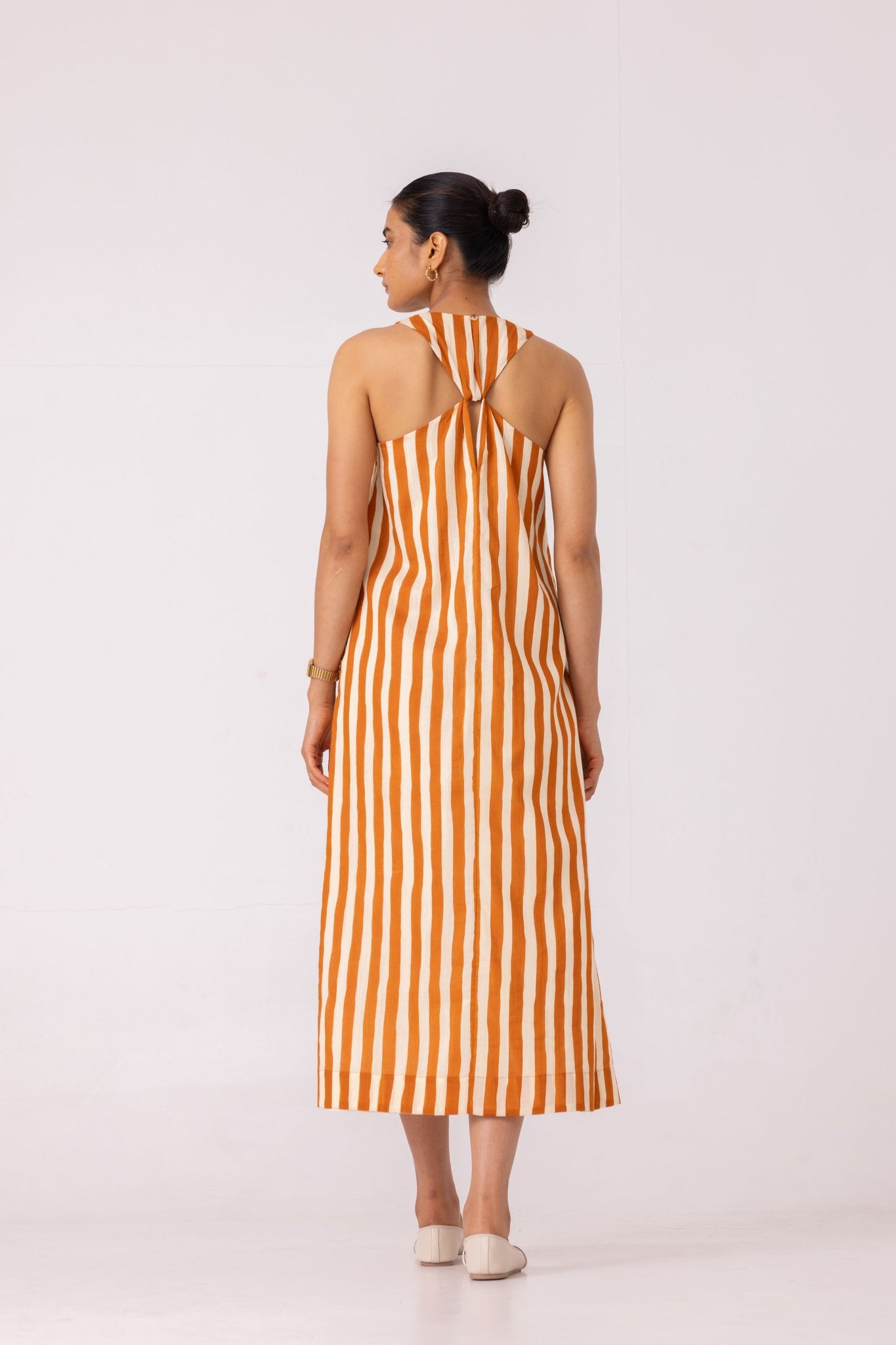 The racerback twists - a single torsion that changes the back of the dress entirely. Maxi length, fully lined, in a spirited caramel and cream stripe.