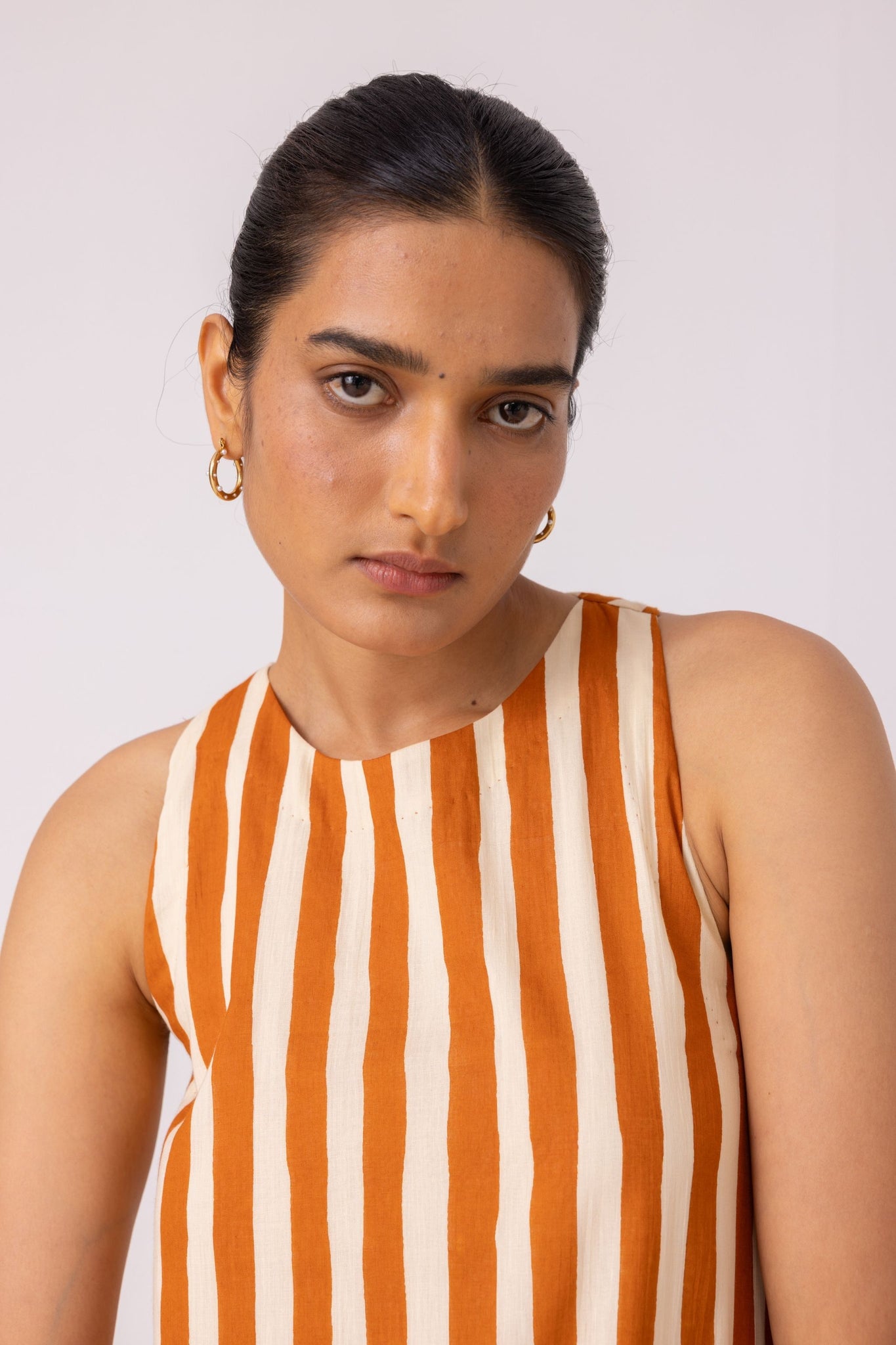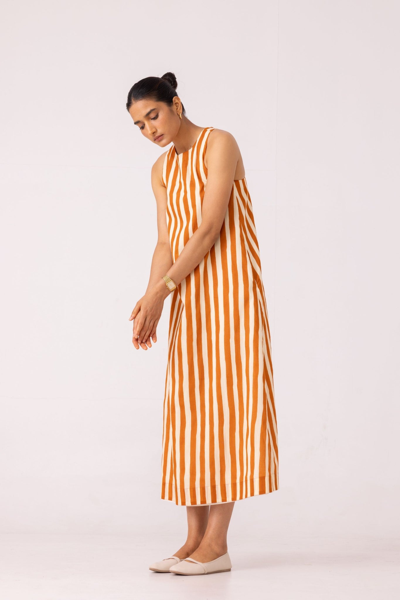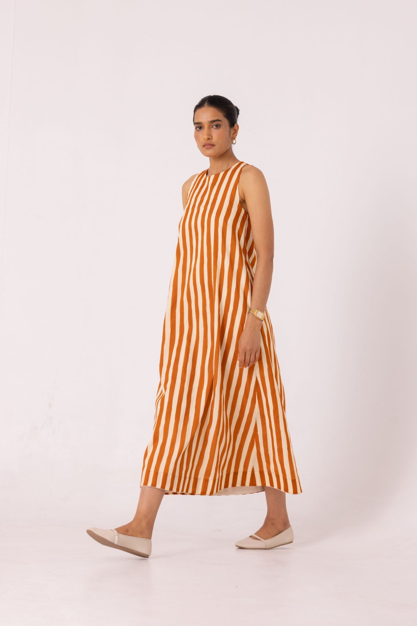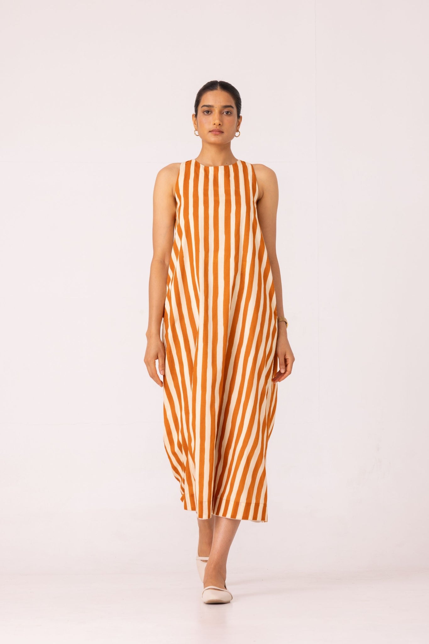The racerback twists - a single torsion that changes the back of the dress entirely. Maxi length, fully lined, in a spirited caramel and cream stripe.