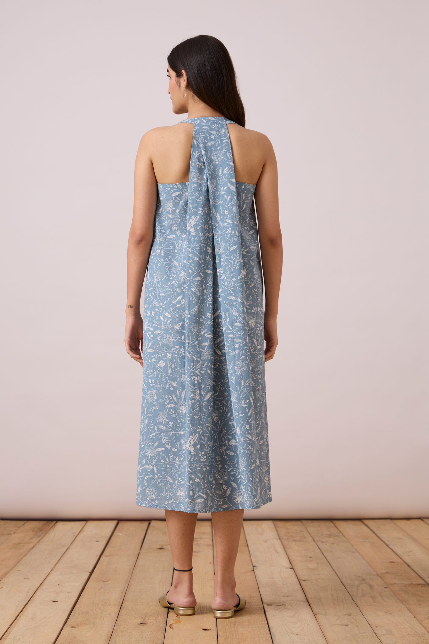 A statement pleated back adds finesse. In-cut shoulder. In-seam pockets. Lower mid-calf length.