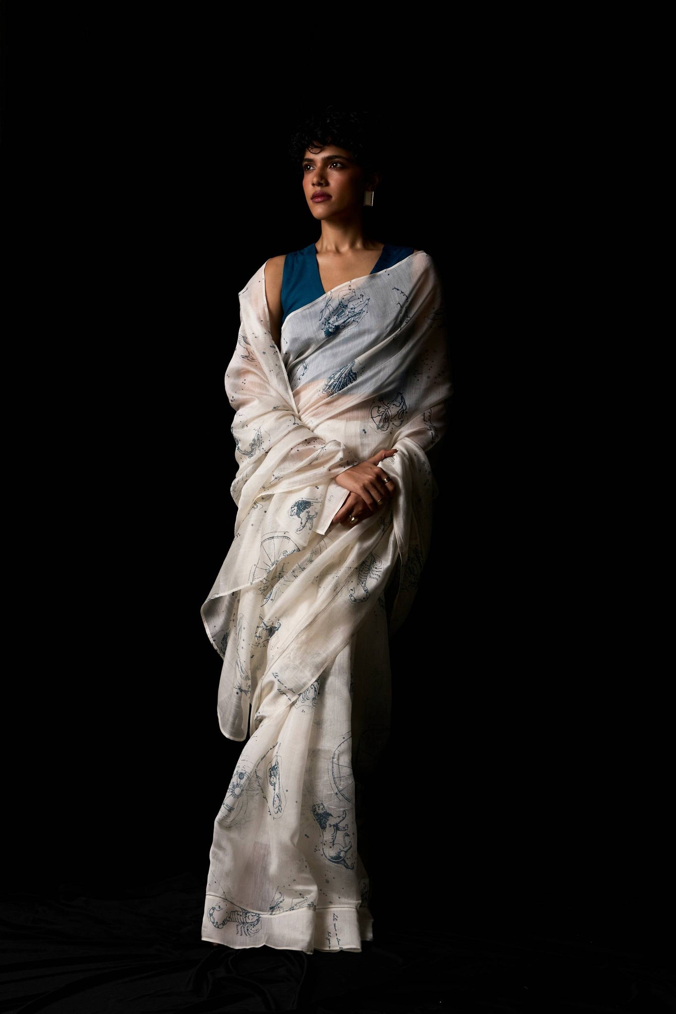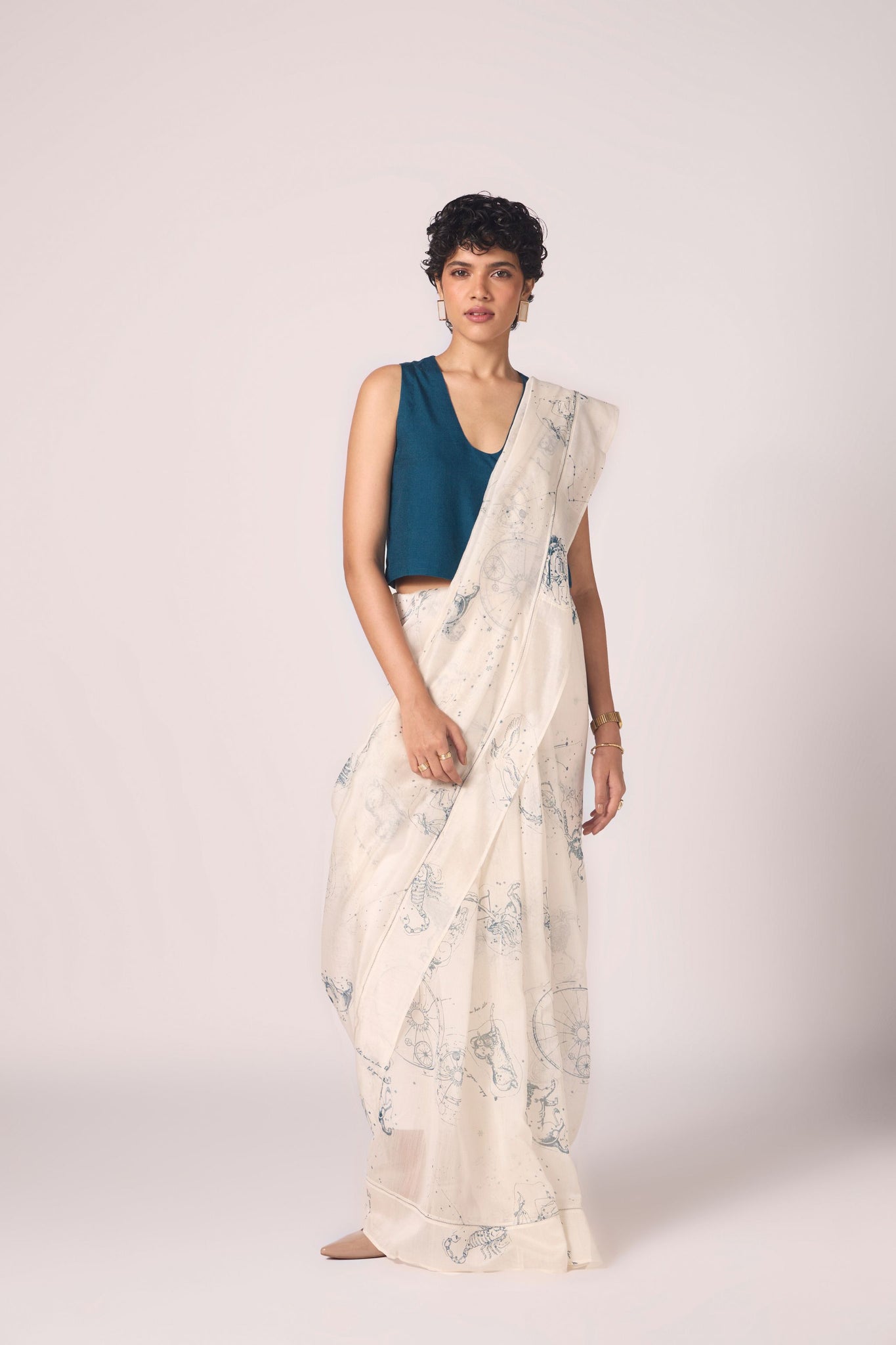 Pair with the Saiph saree for a modern festive mood — Altair’s deep blue silk anchors the saree’s celestial print with sculpted simplicity.