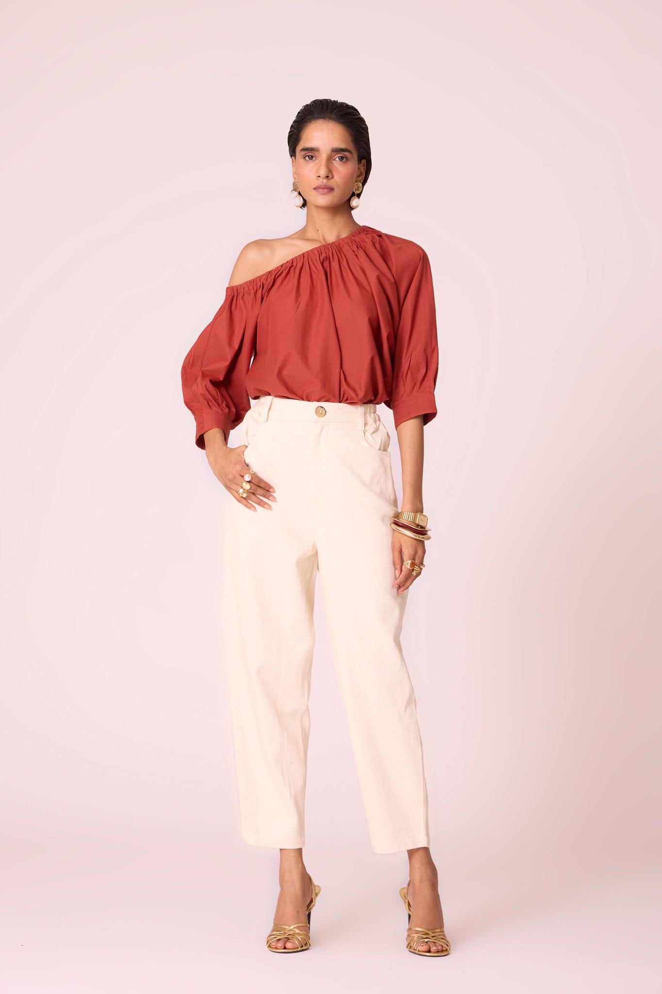 A light, gathered off-shoulder silhouette that frames the neckline with quiet ease. The Dina top brings softness and structure together, its pleated cuffs lending measured volume to an otherwise fluid form.