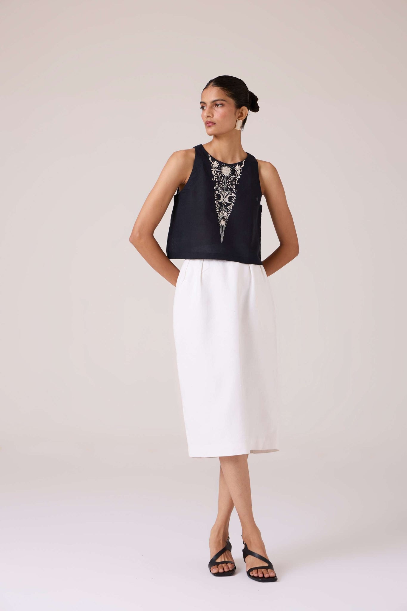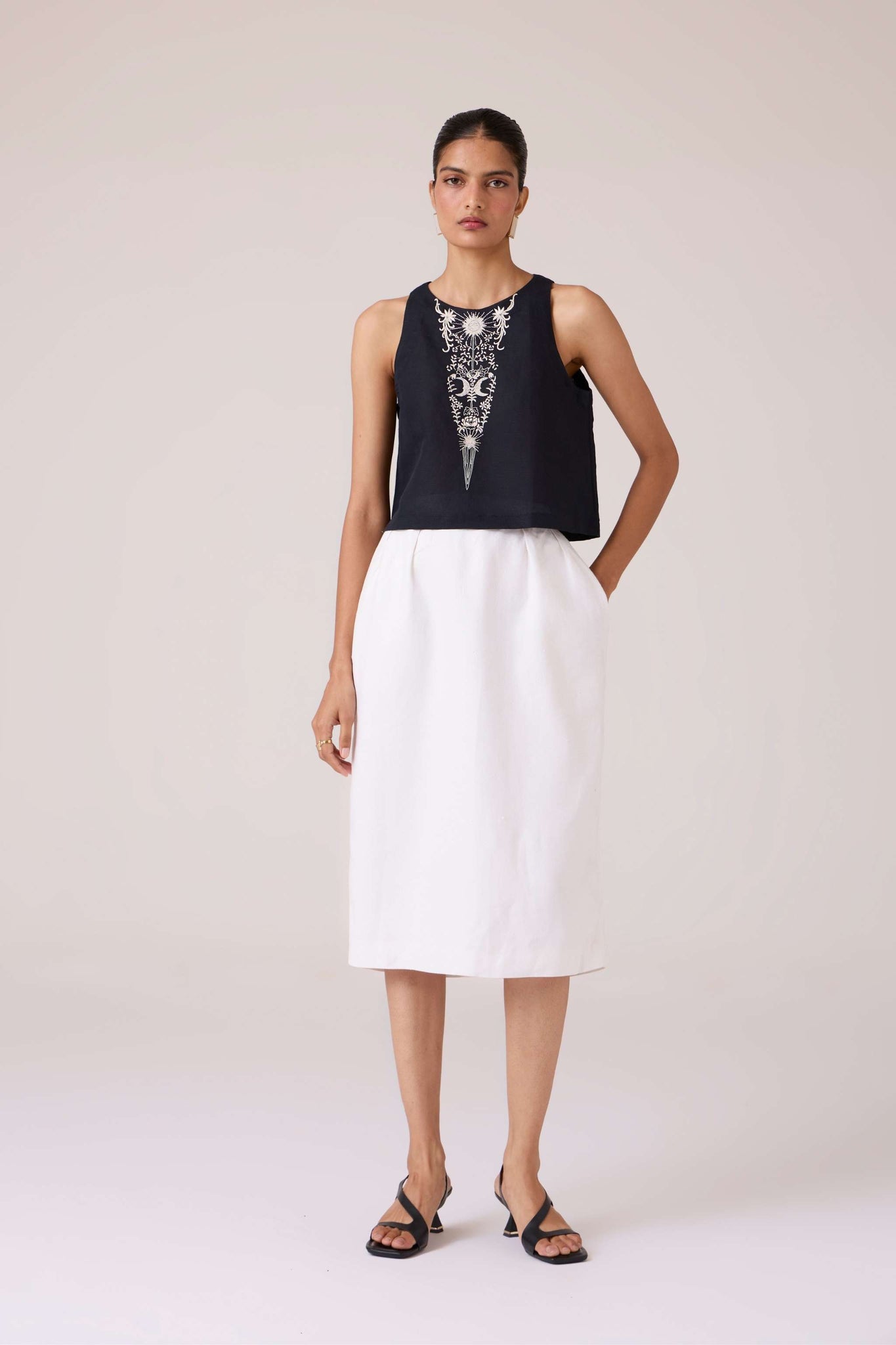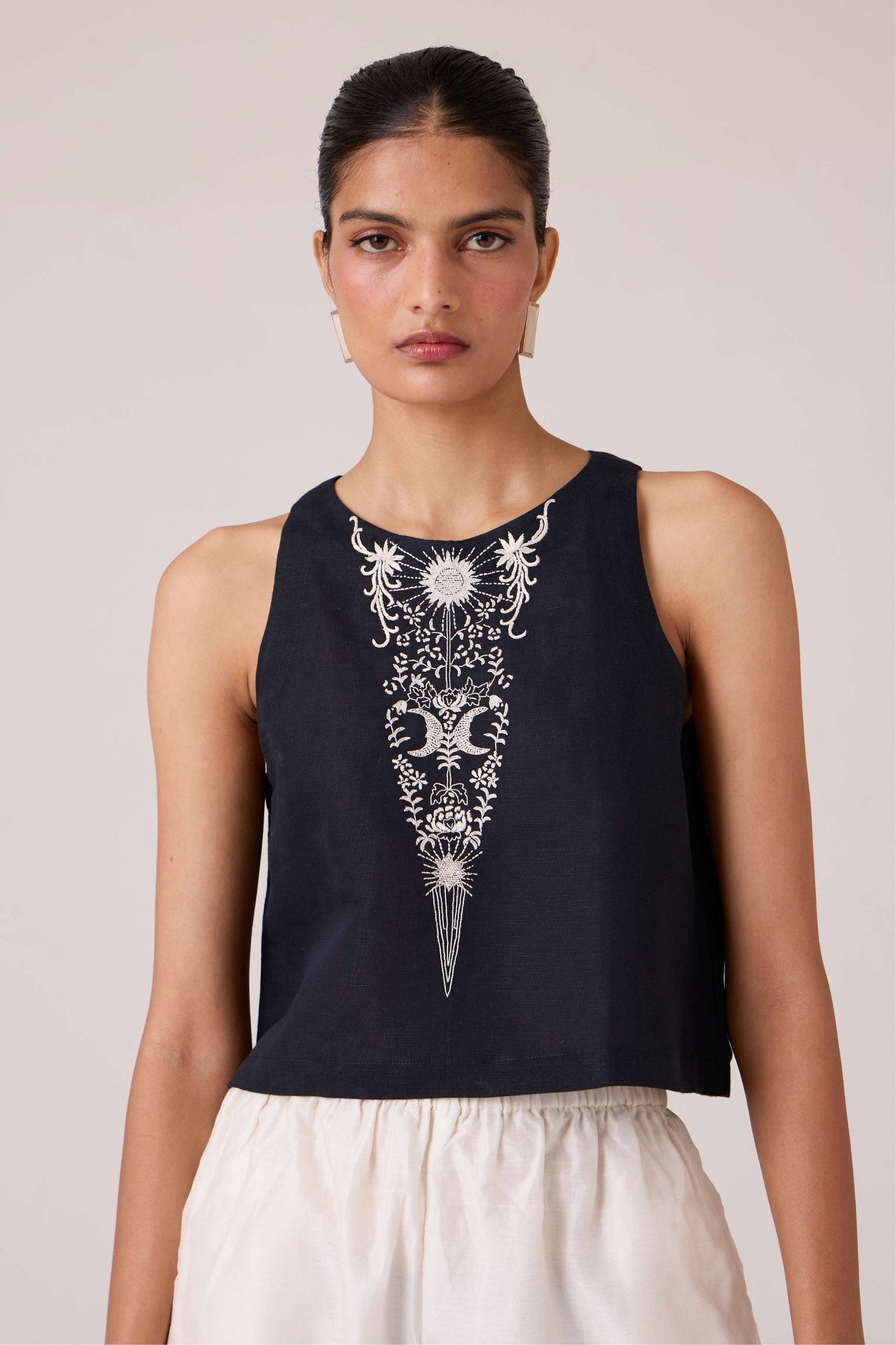 The line is simple. The detail, intricate. Embroidery brings texture to this sleeveless top, designed to pair seamlessly with both tailored and fluid separates.