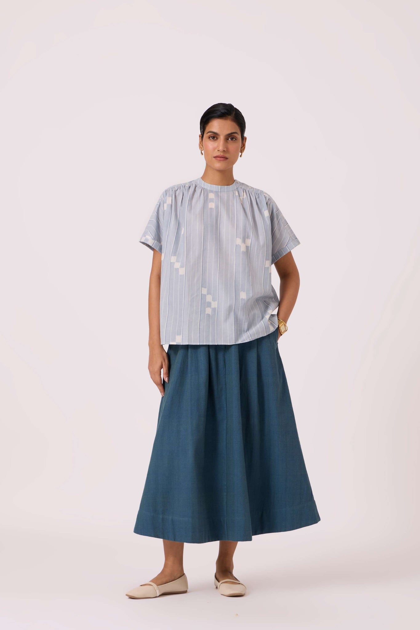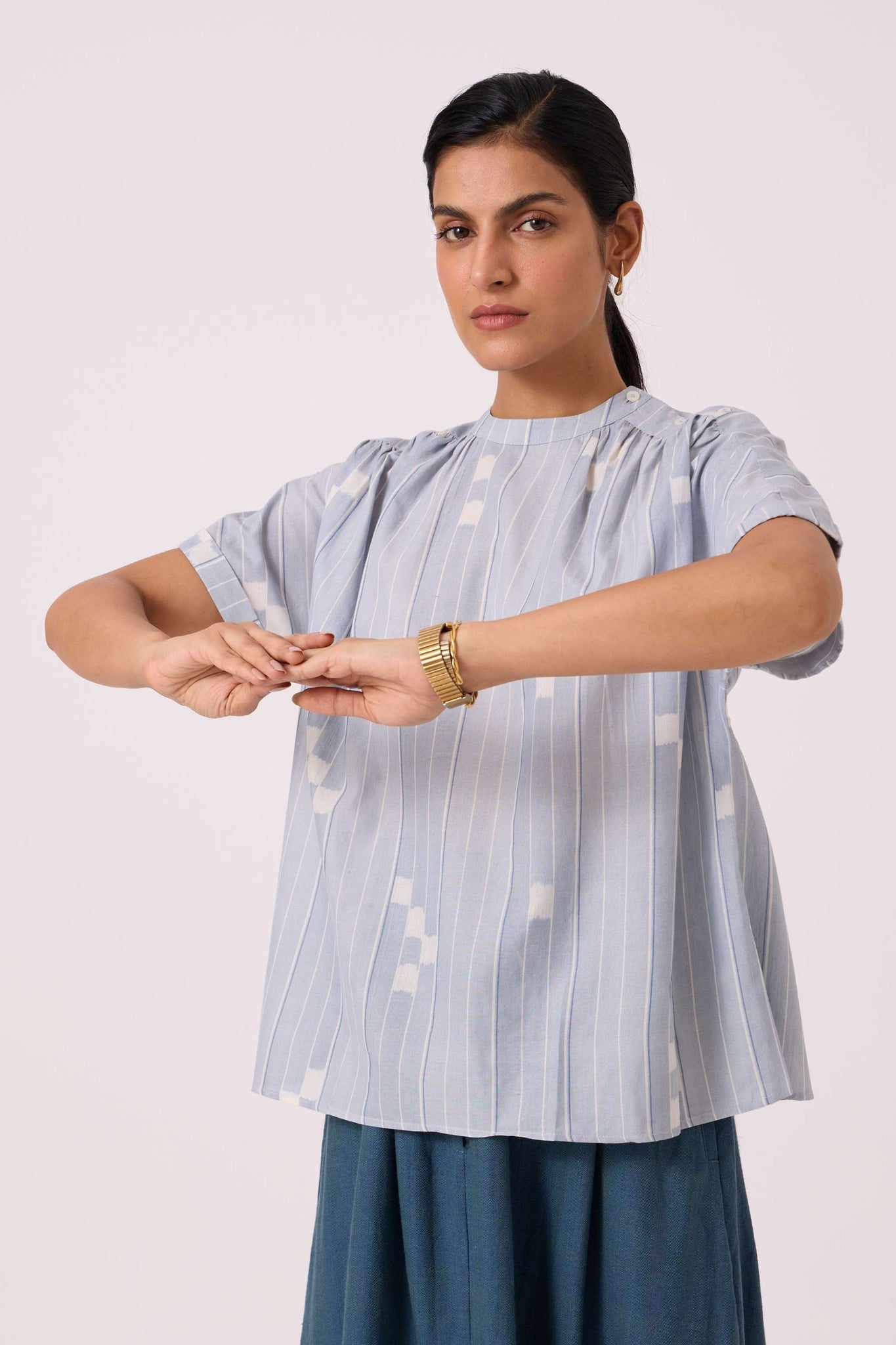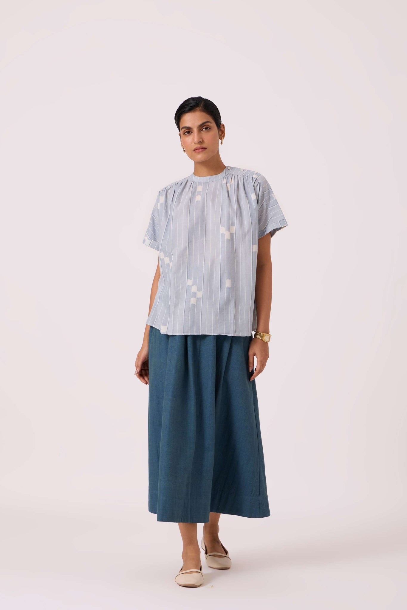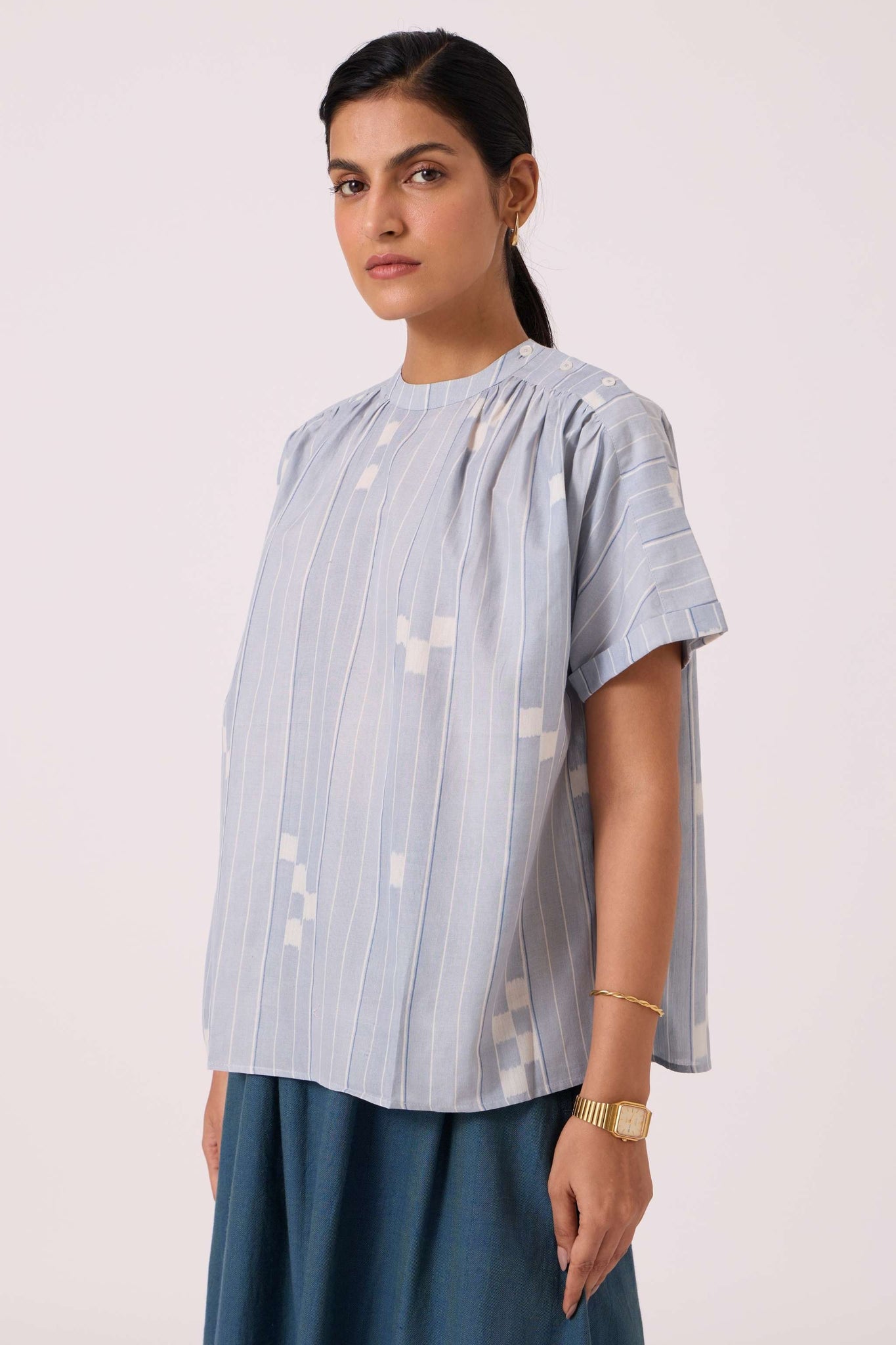 - Slim band collar, with gentle gathers at the neck & shoulder