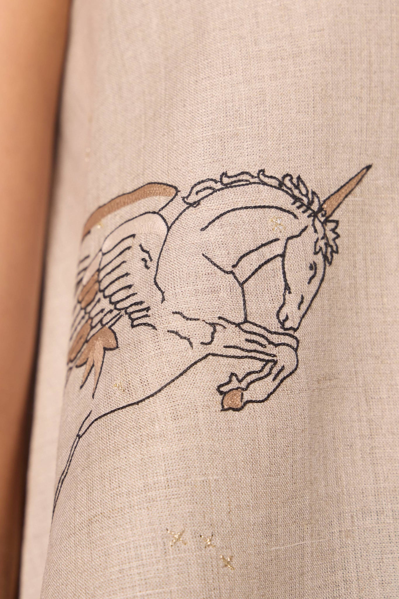 - Contrast hand embroidery, subtle texture