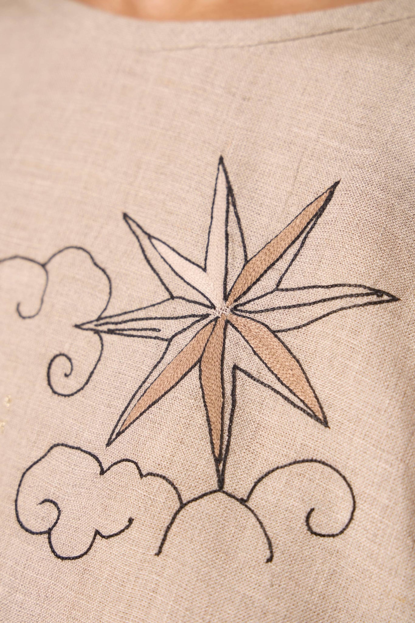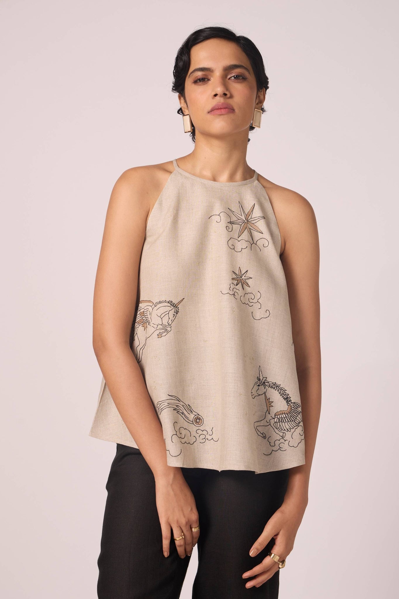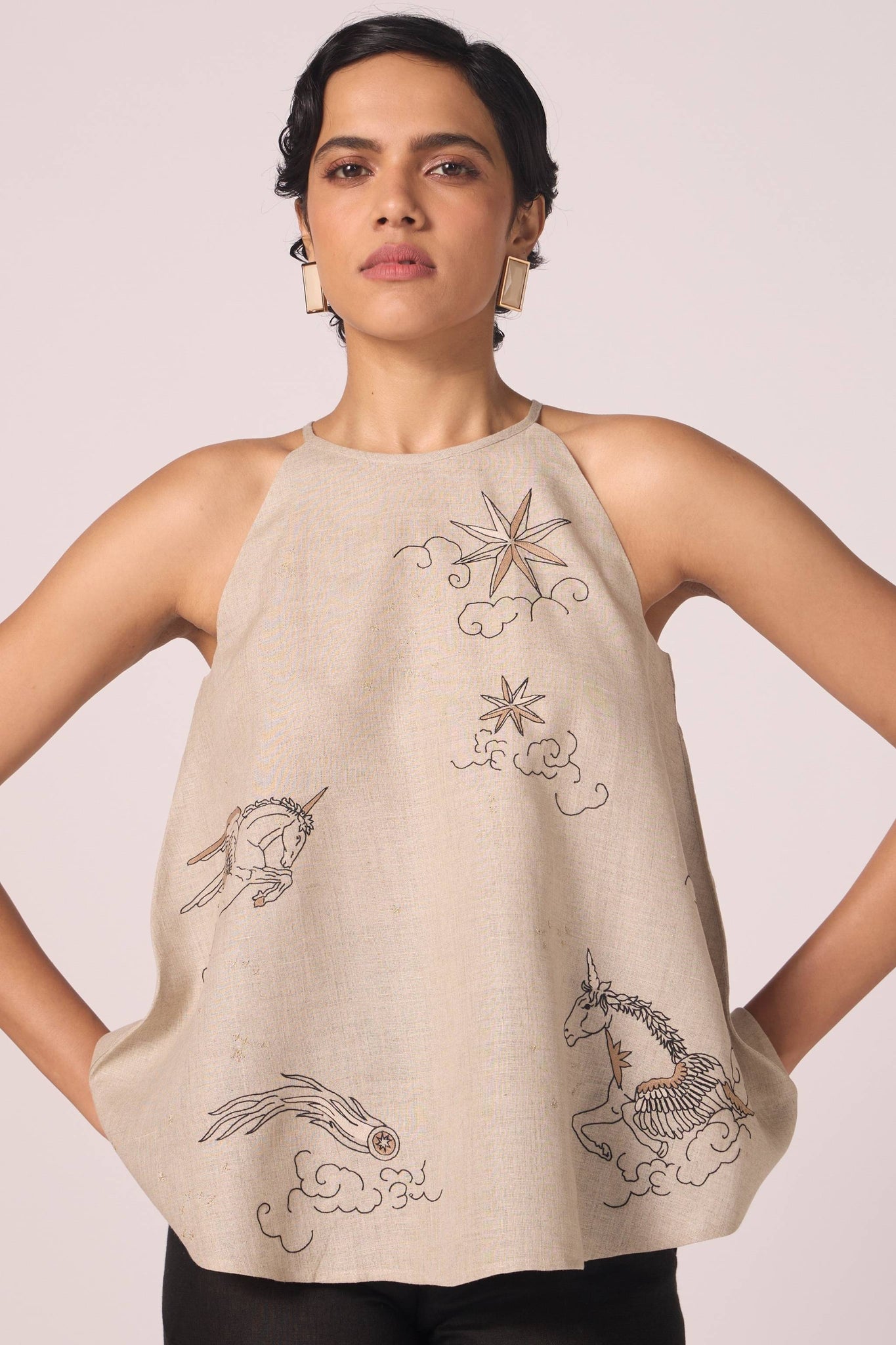 Bare shoulders framed by a precise halter cut. Contrast hand embroidery lends subtle ornament, making this linen top equal parts minimal and detailed.
