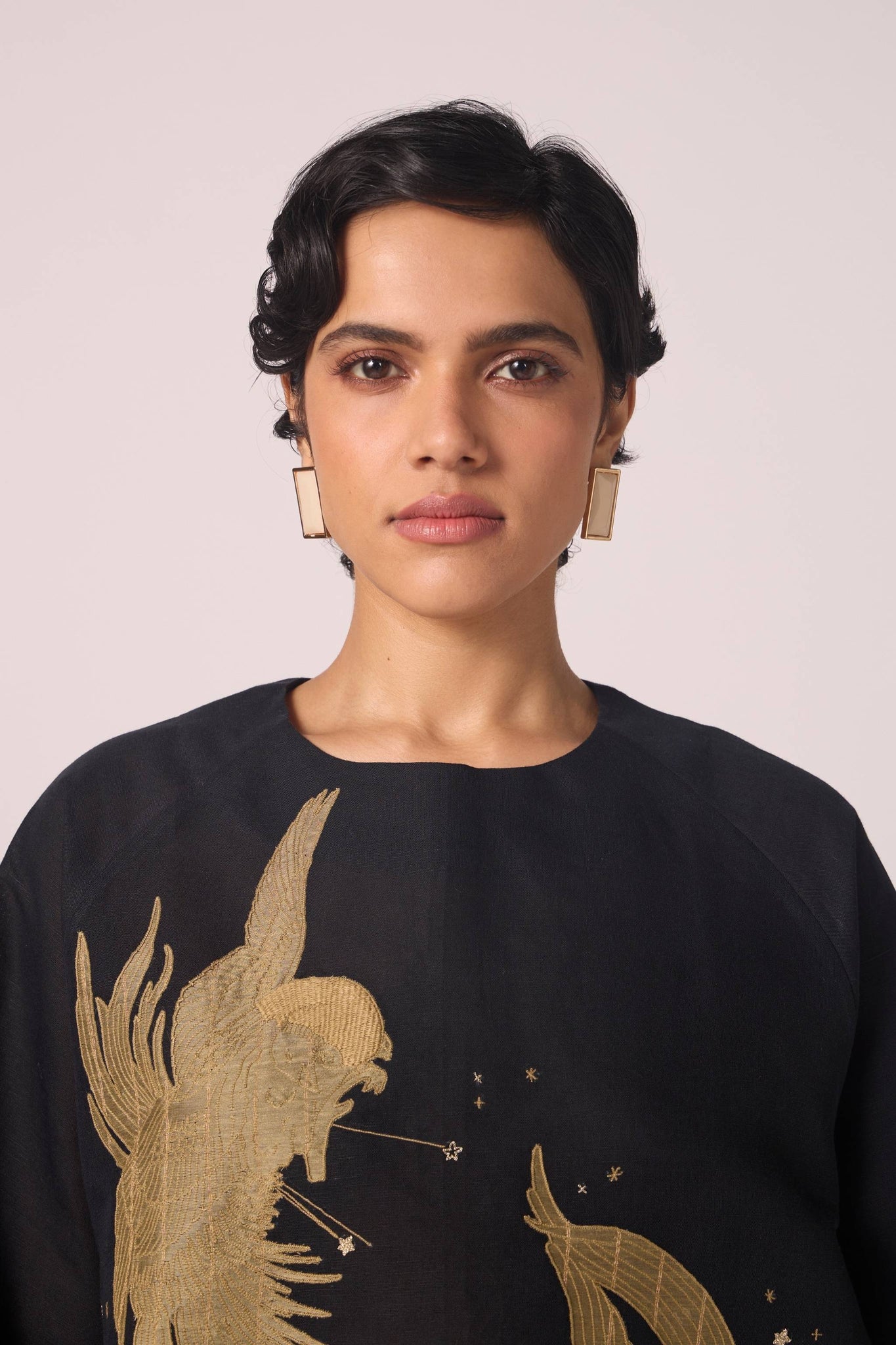 Craft and clarity in one form. Embroidered applique sits across breezy silhouette.