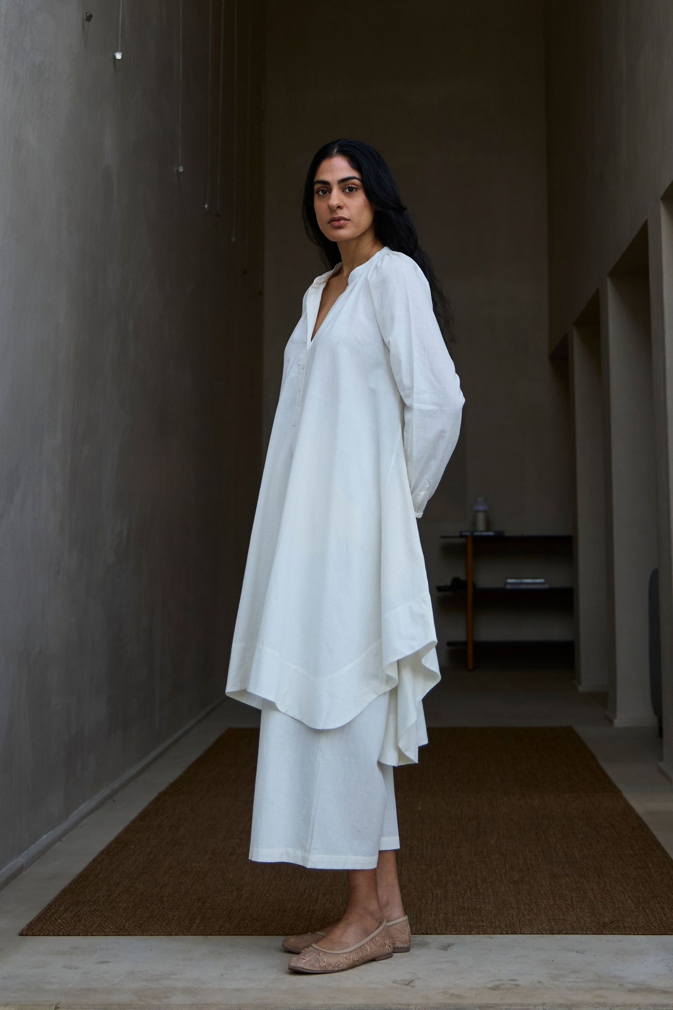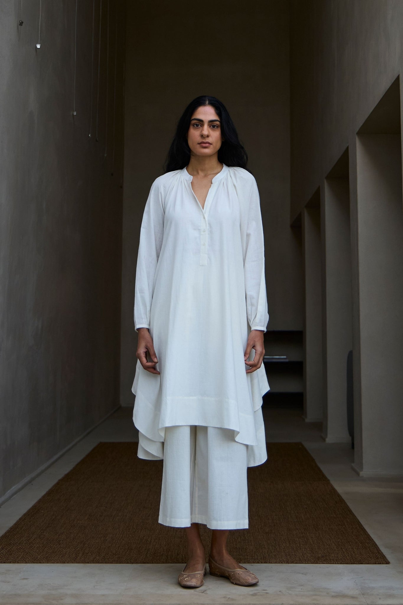 A-line dress in artisanal Khadi. Bounteous flare. Flat-band collar with three button placket. Delicate gathers around the collar and cuff. Bold tail hem. In-seam pockets.