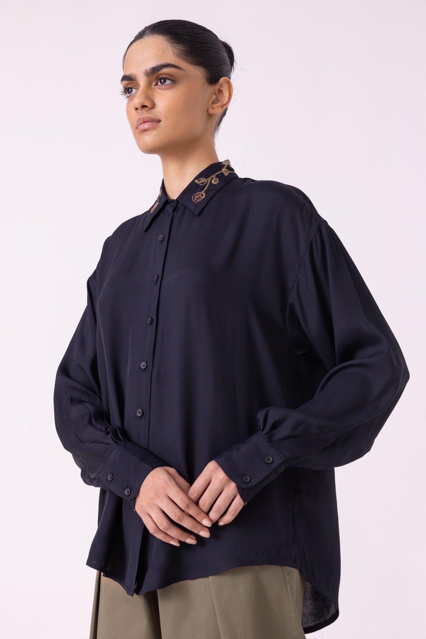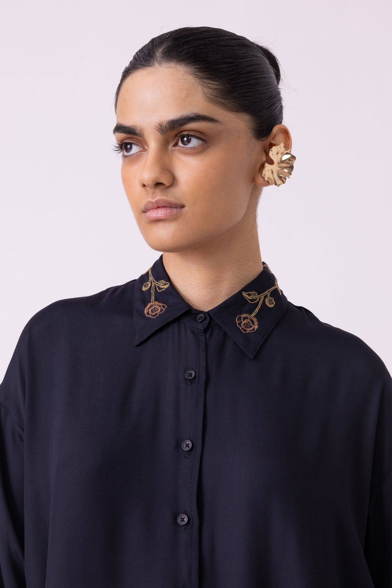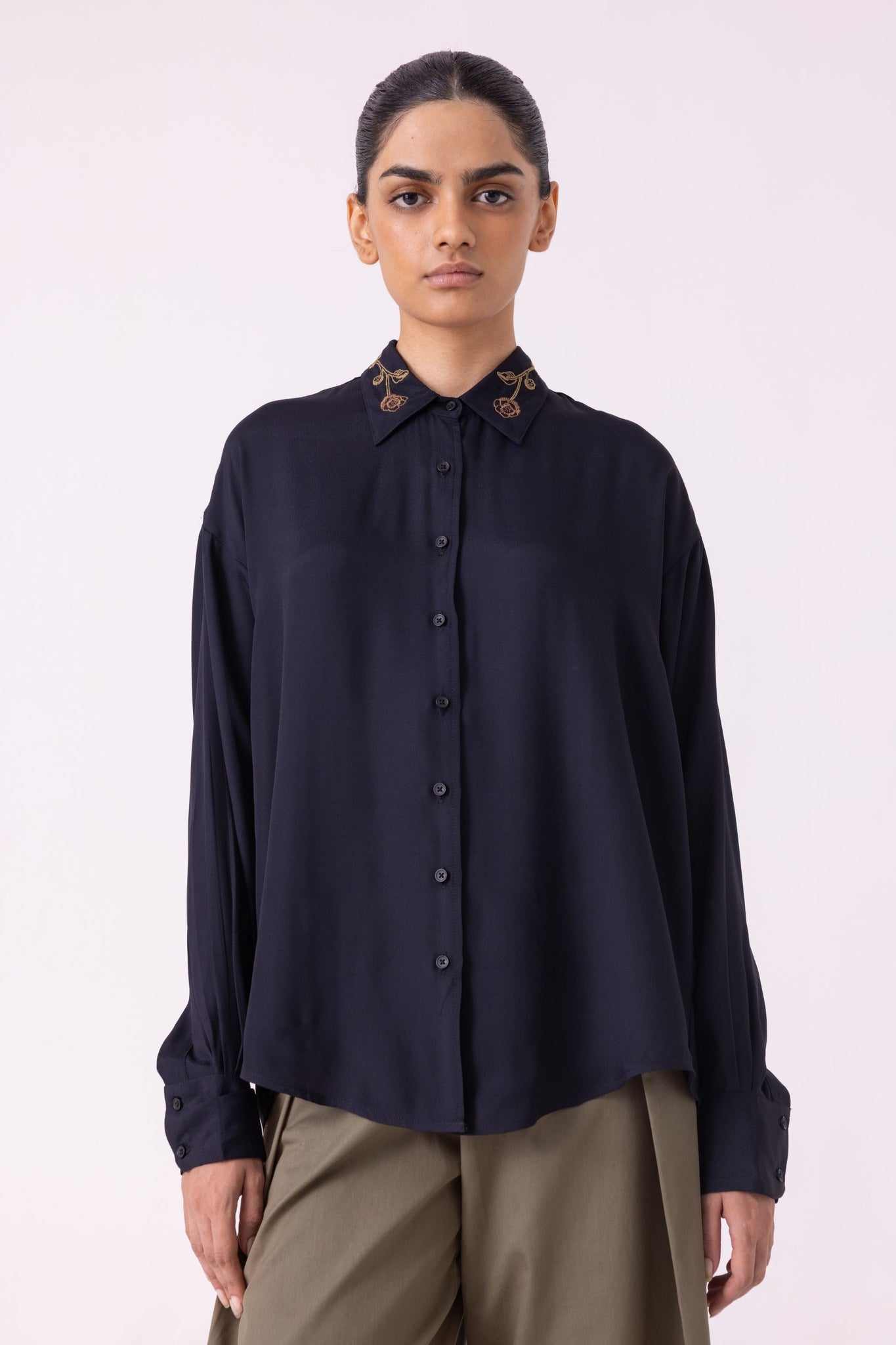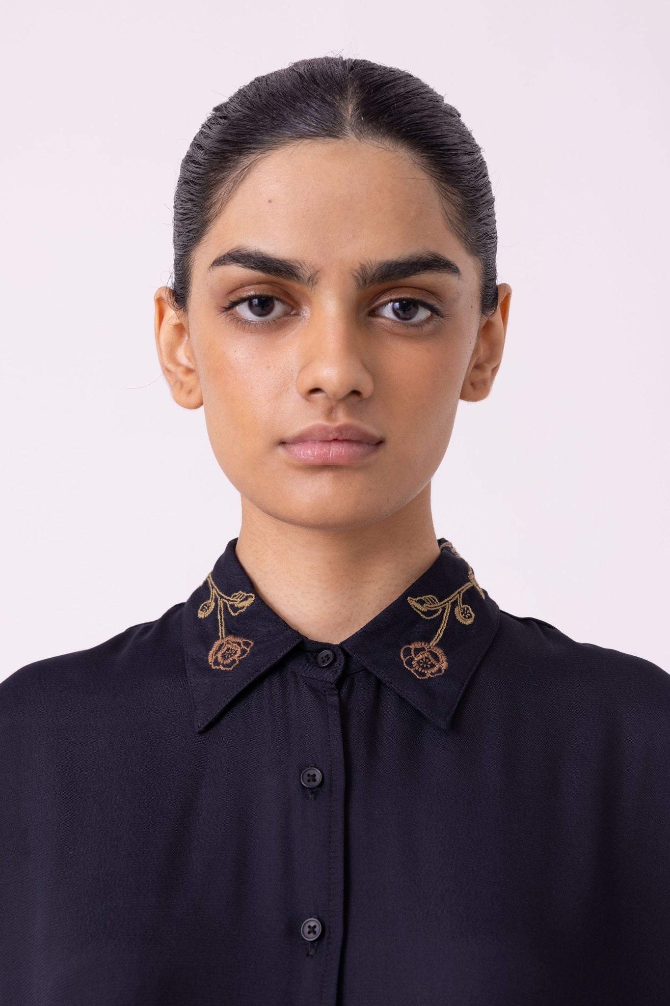 The embroidery lives at the collar - close enough to the face to matter, understated enough not to shout. A box pleat at the back gives it room without losing shape. The shirt you reach for when you want to look like you thought about it, without looking like you tried.