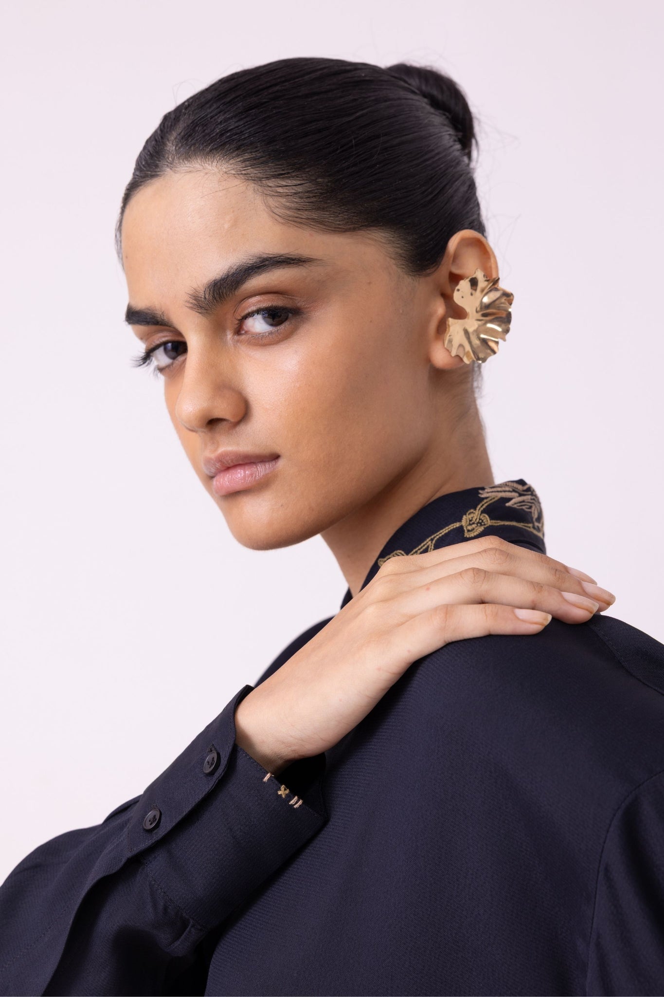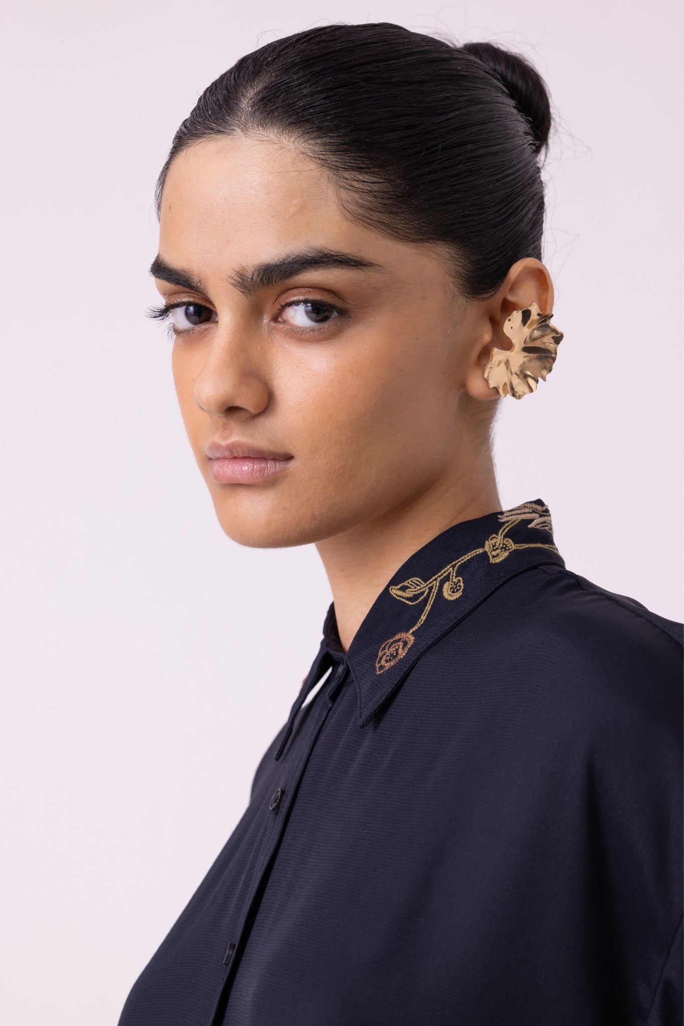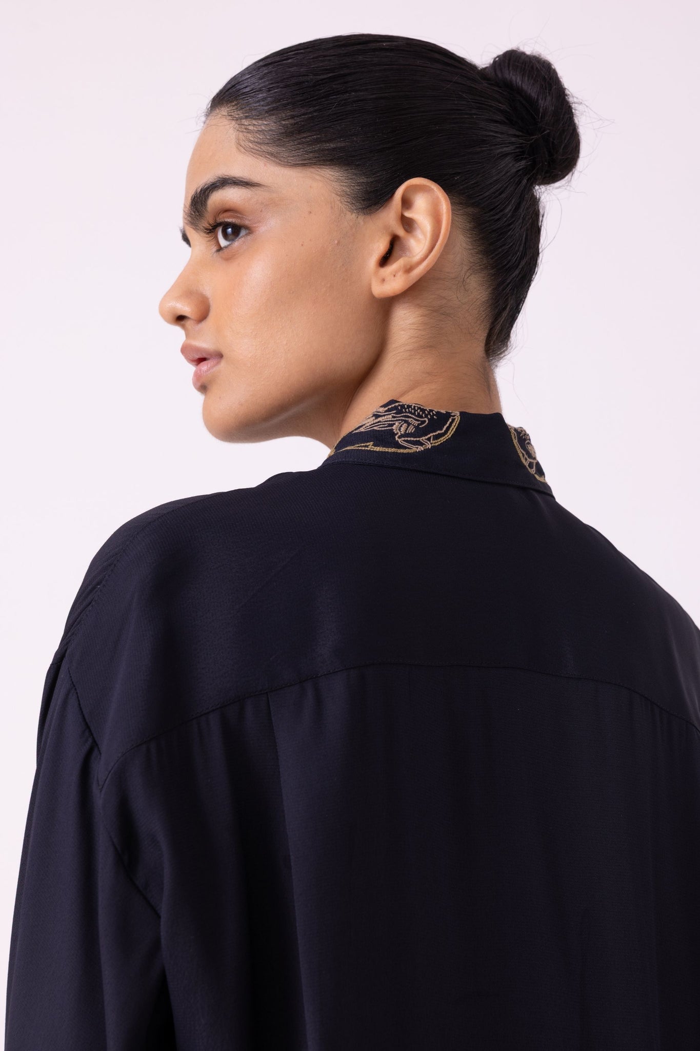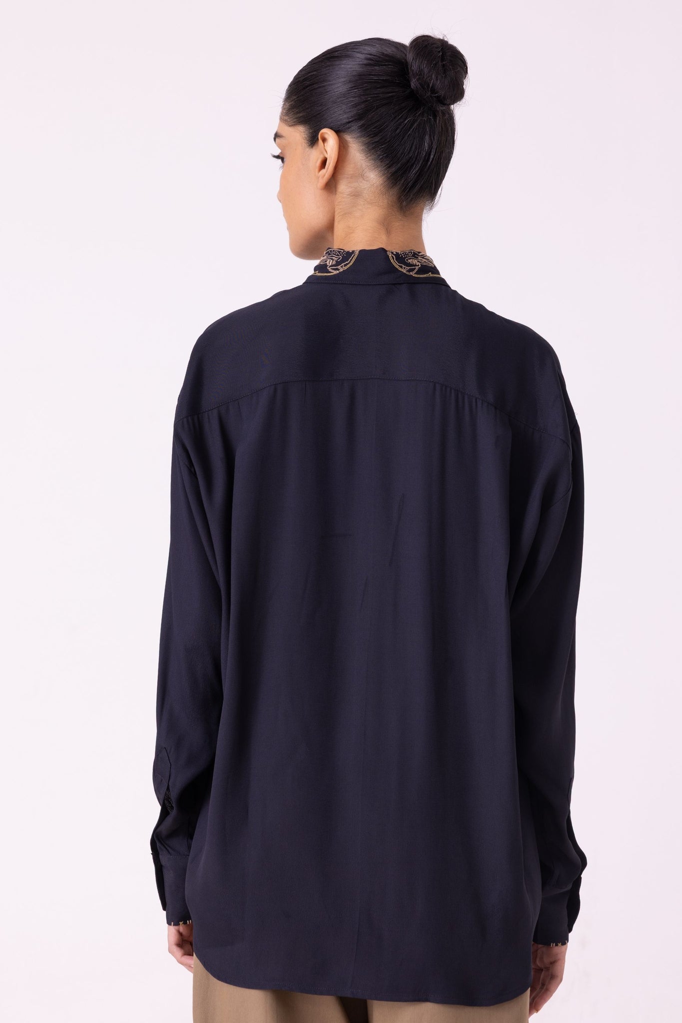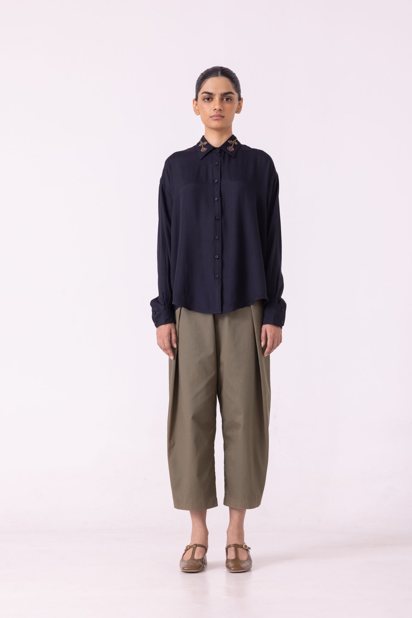 The embroidery lives at the collar - close enough to the face to matter, understated enough not to shout. A box pleat at the back gives it room without losing shape. The shirt you reach for when you want to look like you thought about it, without looking like you tried.