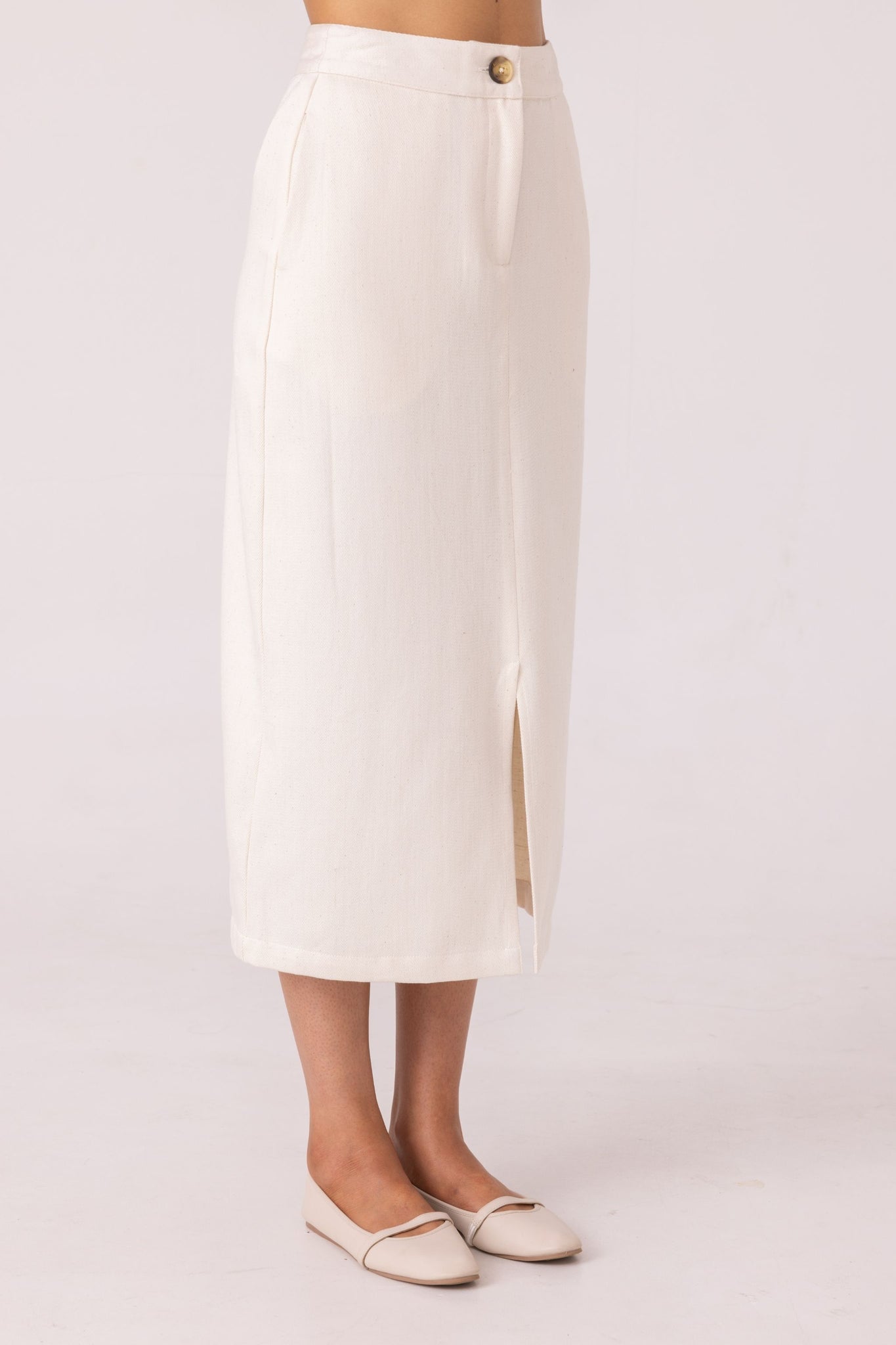 A wardrobe staple. High waist pencil skirt. Front button and fly closure for ease to slip on. Front center seam slit for ease of movement. In-seam pockets.