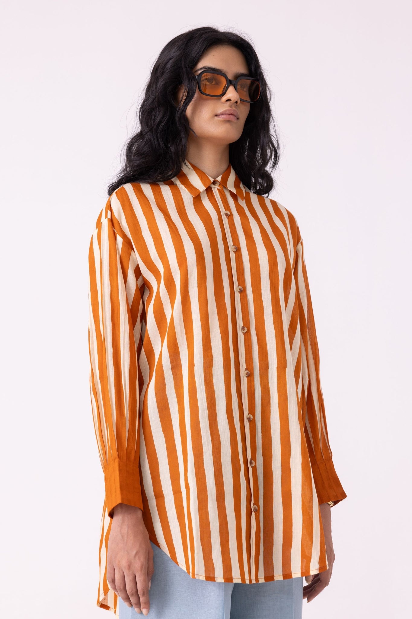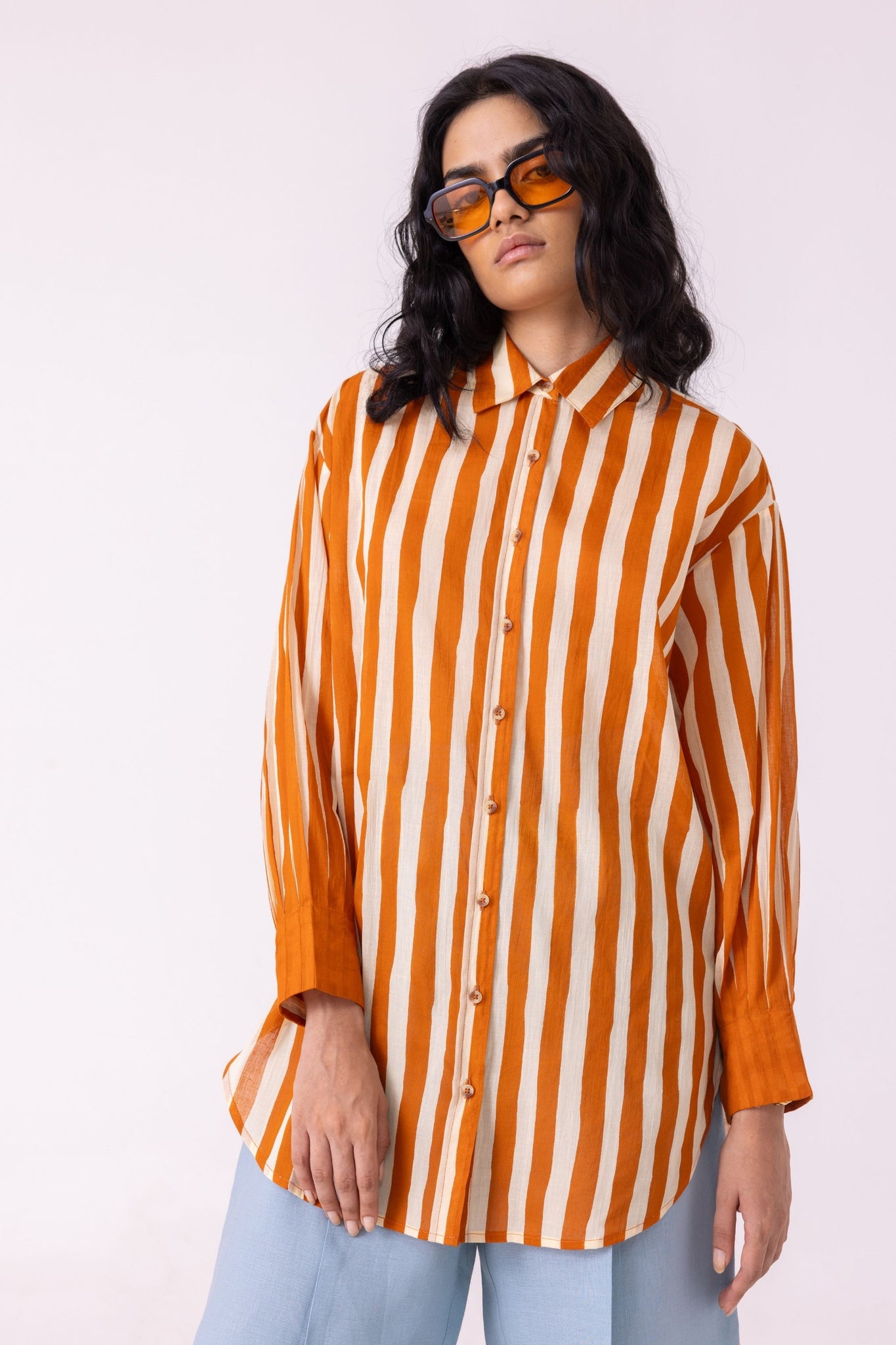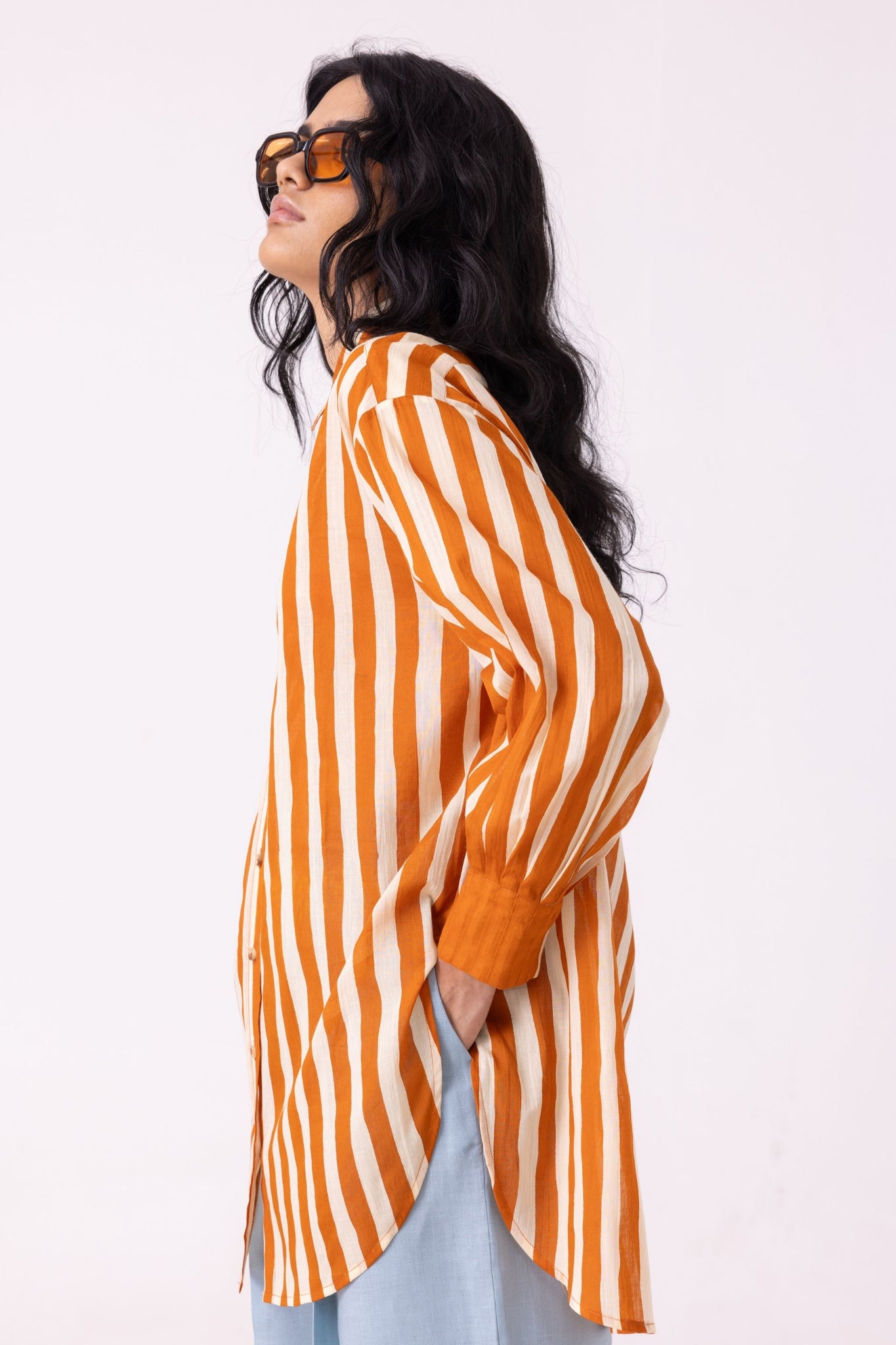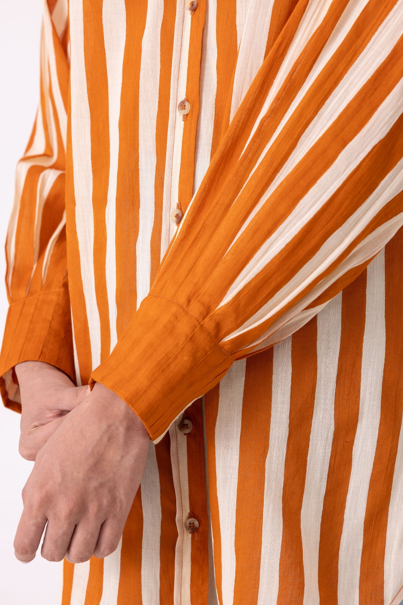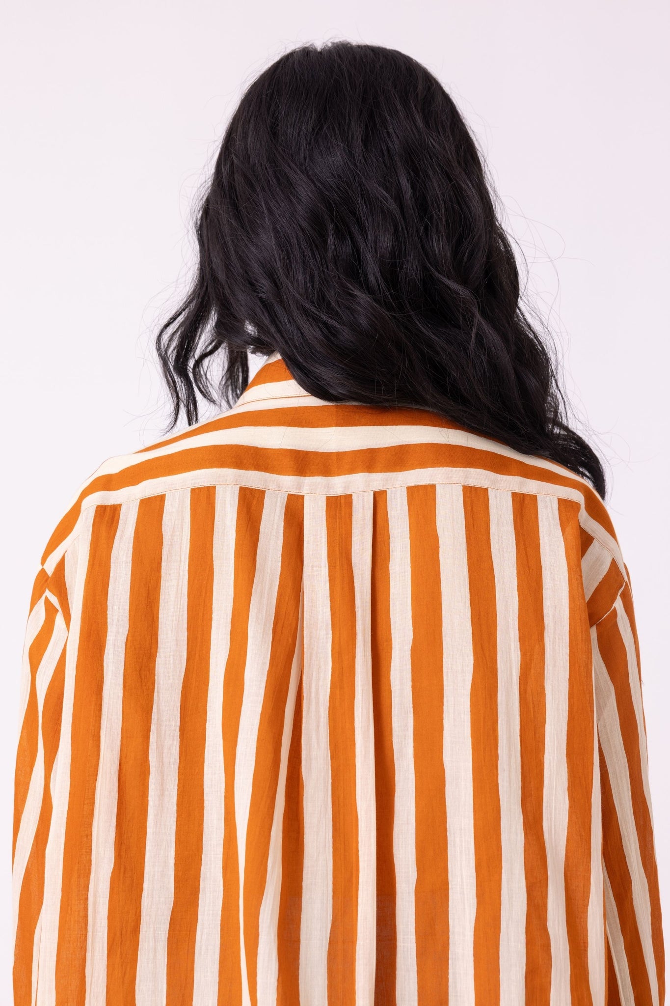 The bishop sleeve pleats into a cuff - that transition from volume to precision is where the shirt earns its interest. Relaxed through the body, a drop shoulder, a hem that curves just enough. The stripe in caramel and cream does the rest quietly.