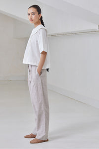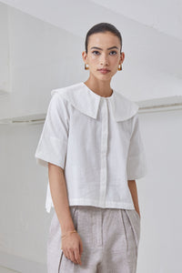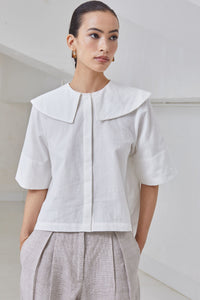 Short top with statement puritan collar. Concealed placket. Slight high-low hemline with side slits. Elbow length sleeves.