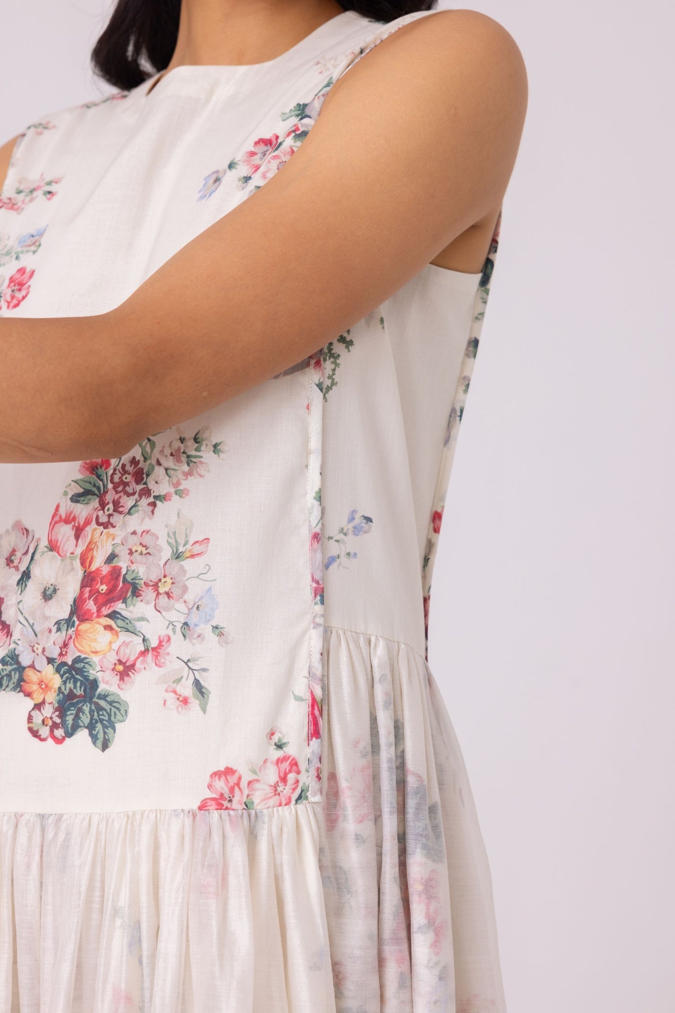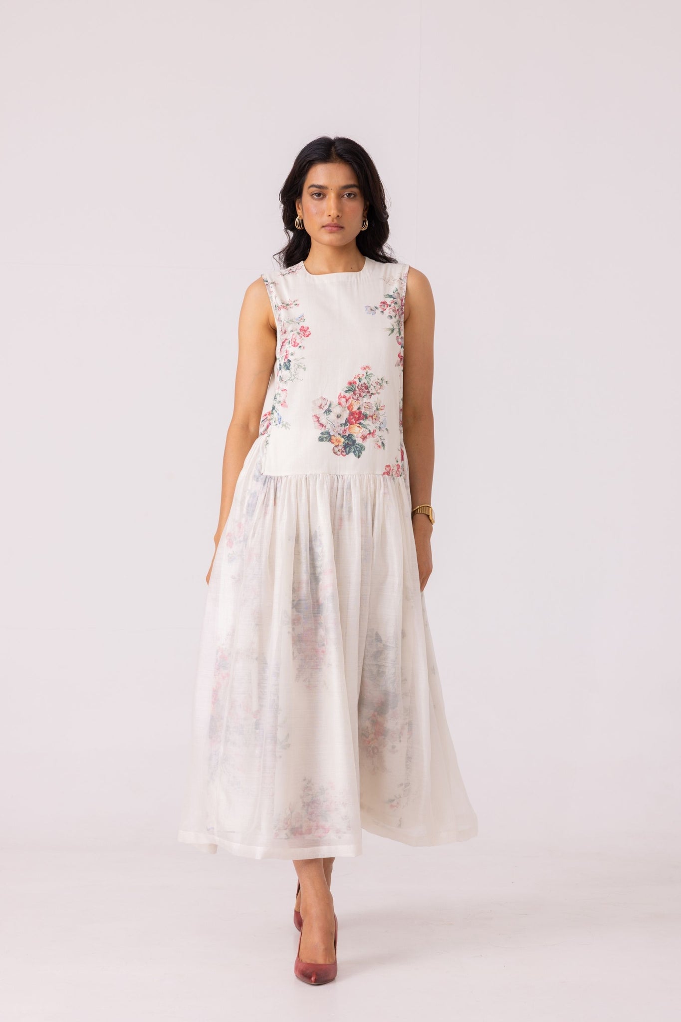 Organic cotton voile meets handwoven Chanderi - the interplay of opacity between the two fabrics creates a statement garment. Sleeveless, maxi length, charming. A subtle shift in height at the waistline brings movement and intention to this maxi-length design.