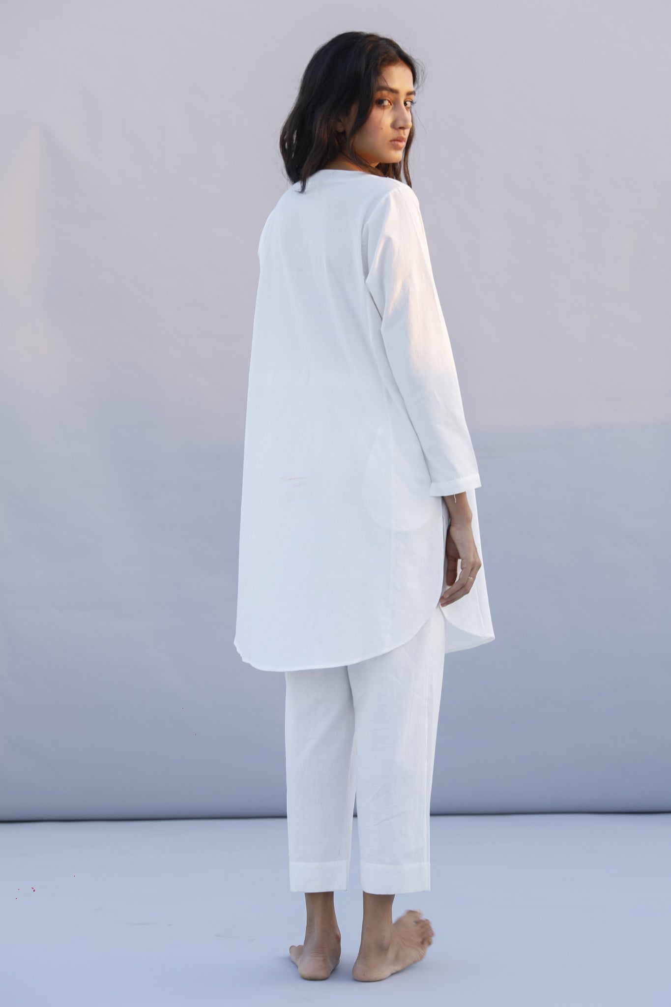 Tunic style top with drop shoulder. Full length sleeves. Partial concealed placket. Curved hem with side slits. In seam pockets.