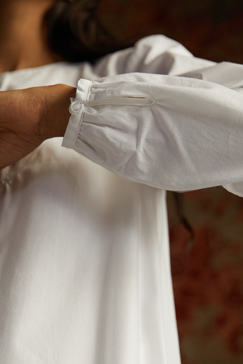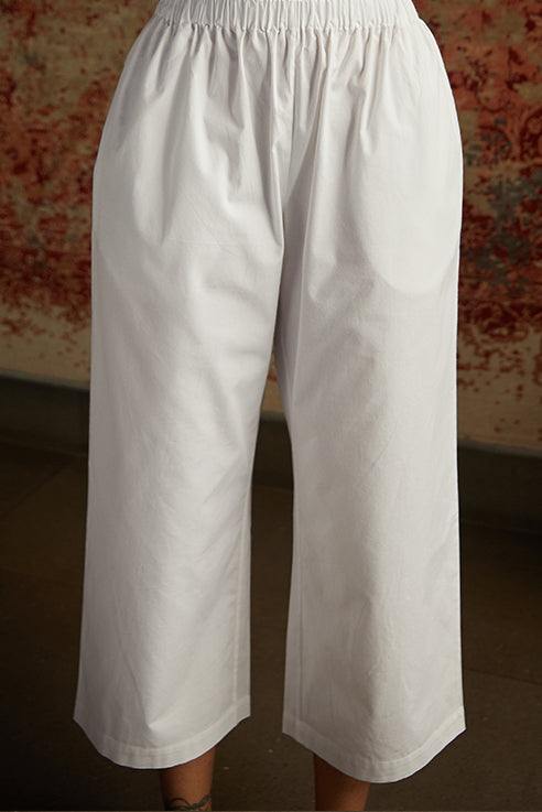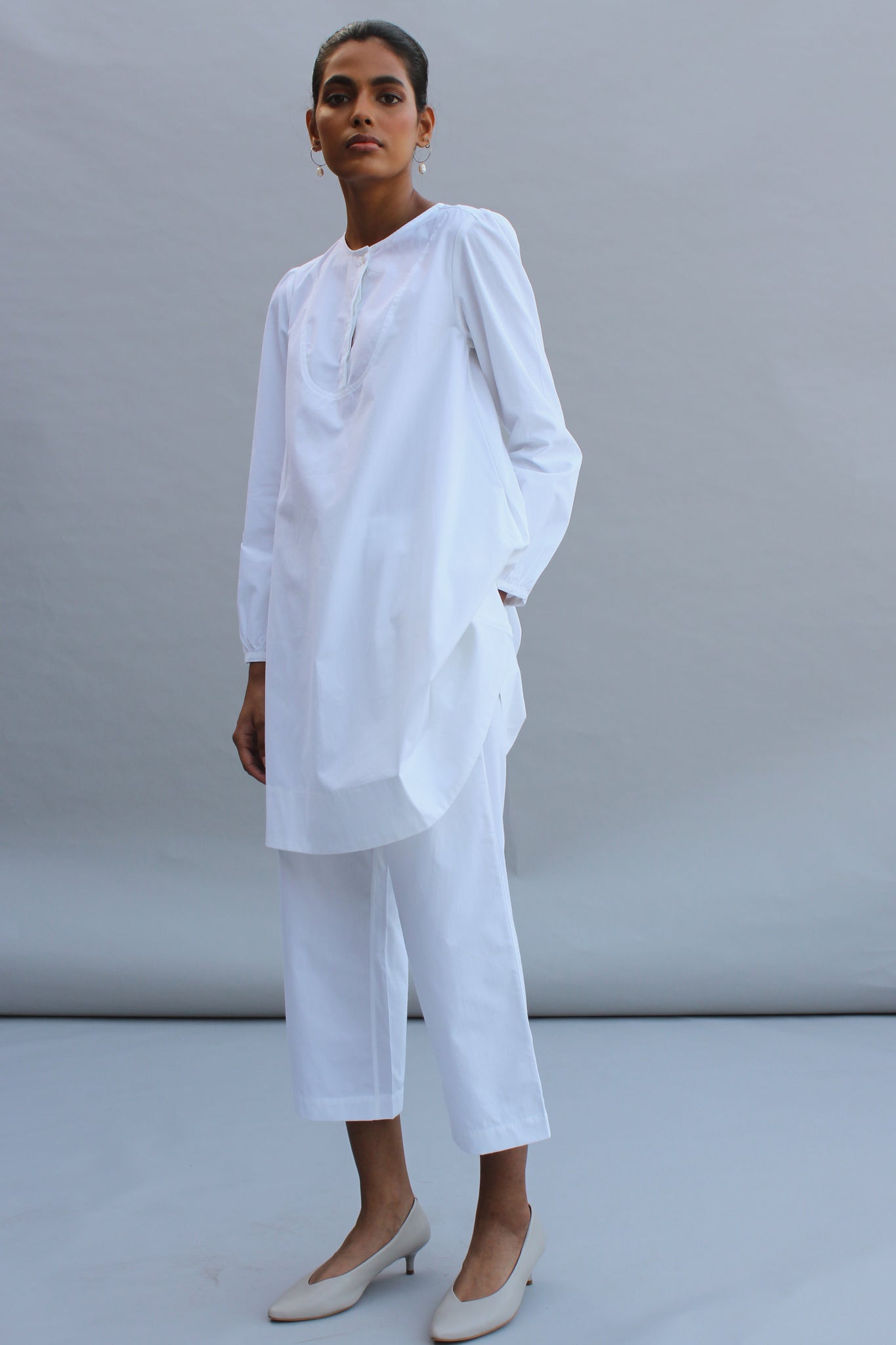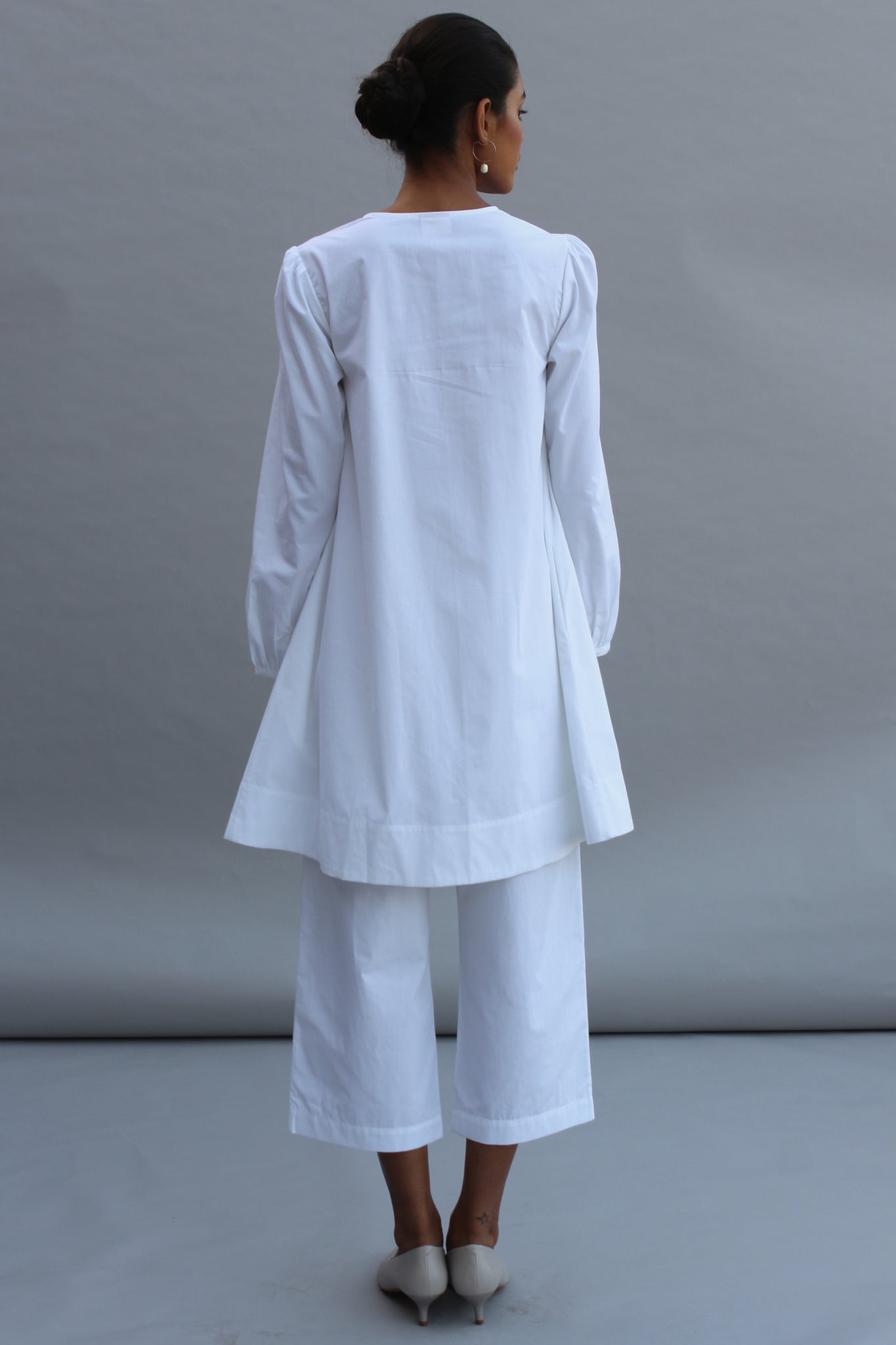 Fuss free dressing for laid back days. Swing dress silhouette in smooth 40s poplin. Played down yoke. Hidden placket with single visible button. Bracelet length sleeve gently gathered at the cuff. Paired with wide leg cropped pants with an elasticated waistband. In-seam pockets.