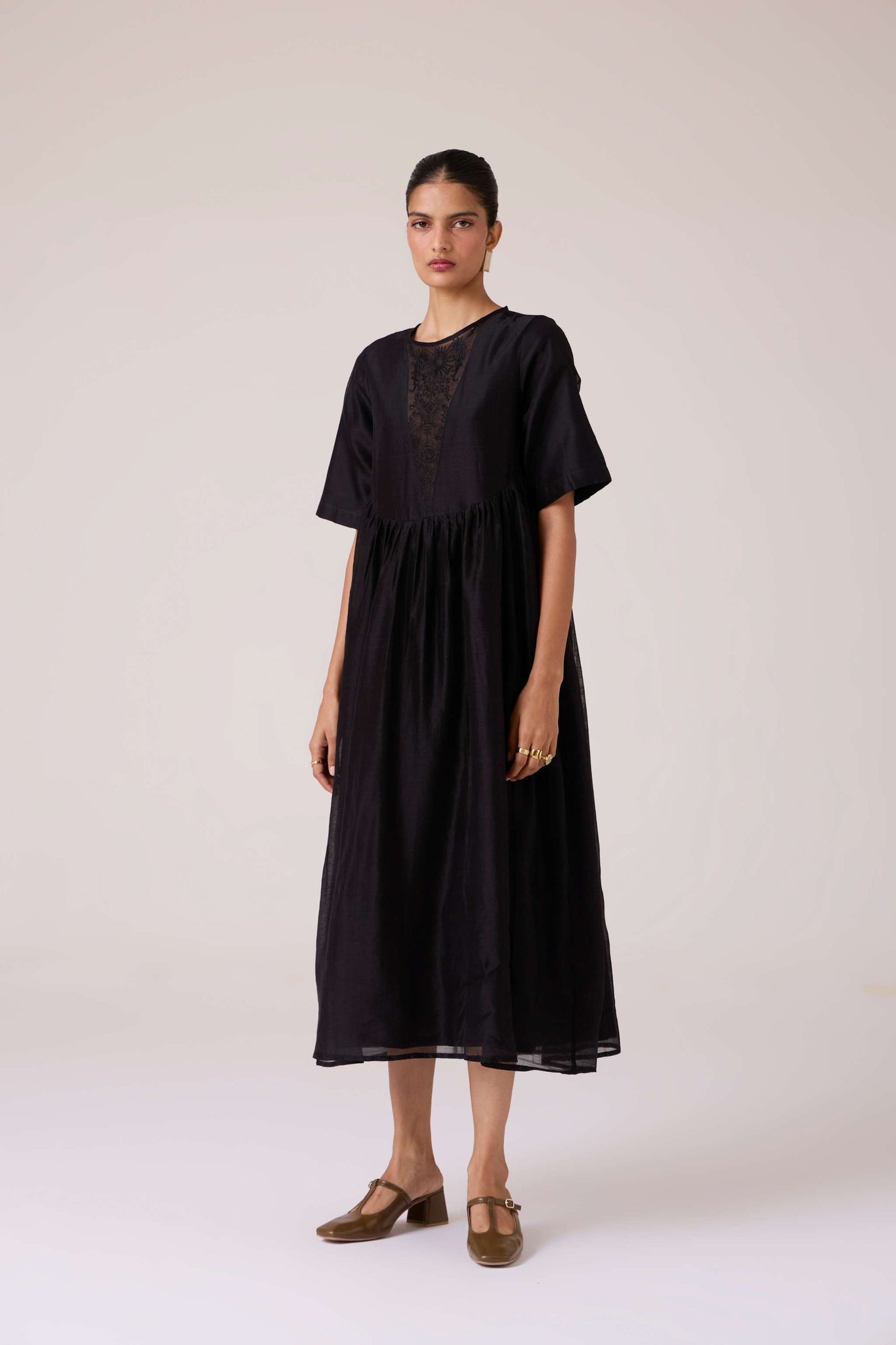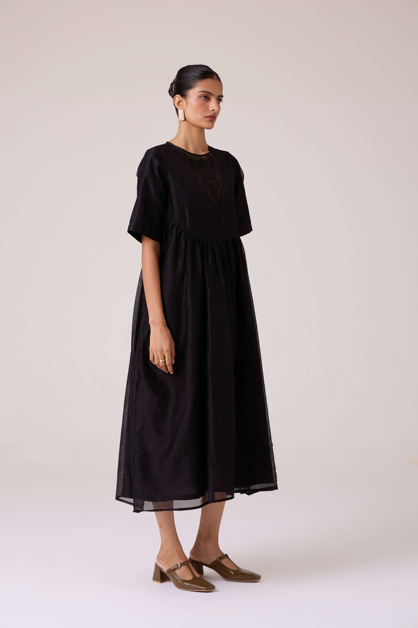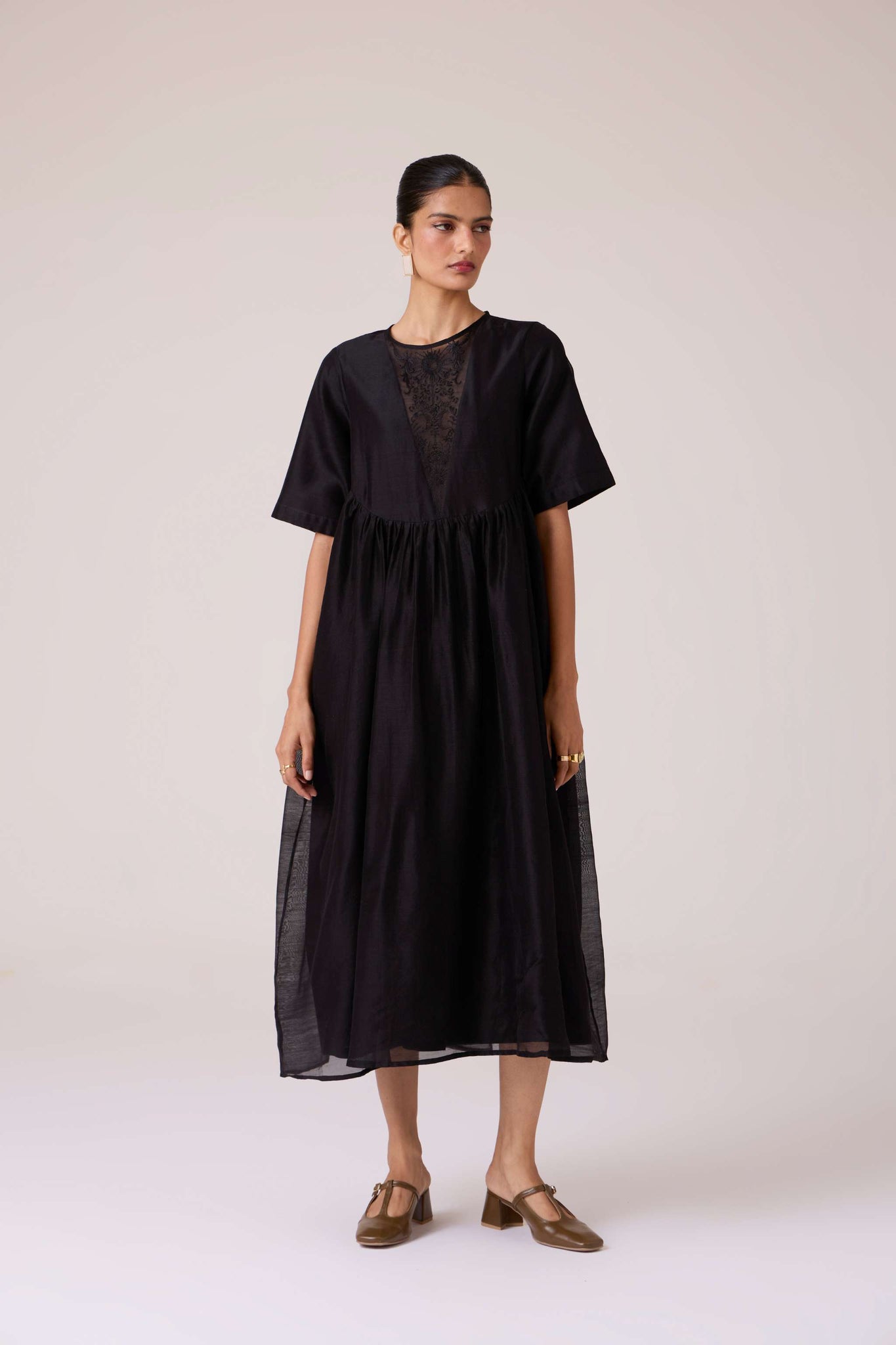 A composition of curve and flare. The embroidered neckline lends delicacy, the sweeping cut restores grandeur.