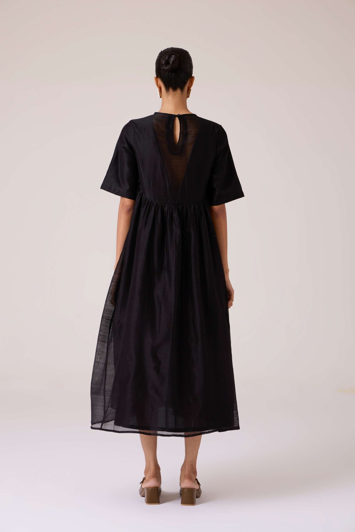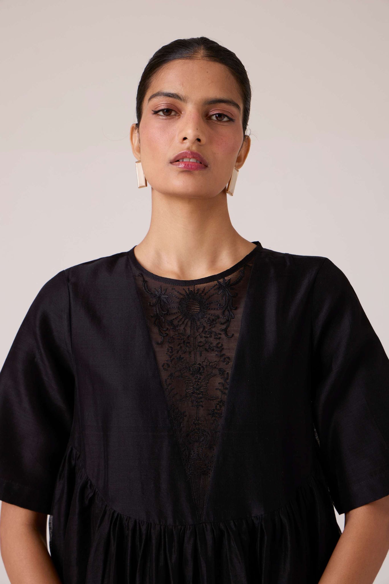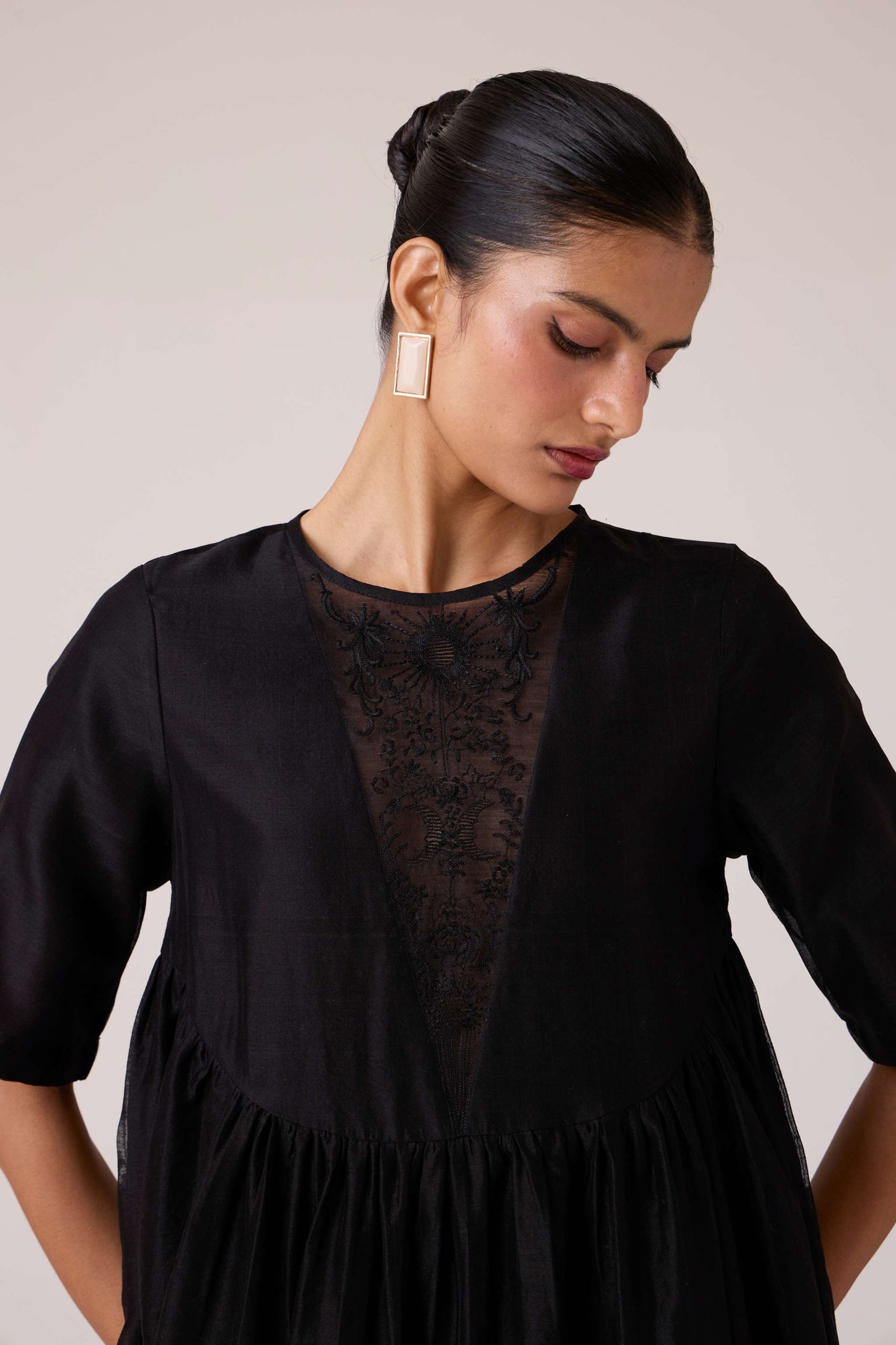 A composition of curve and flare. The embroidered neckline lends delicacy, the sweeping cut restores grandeur.
