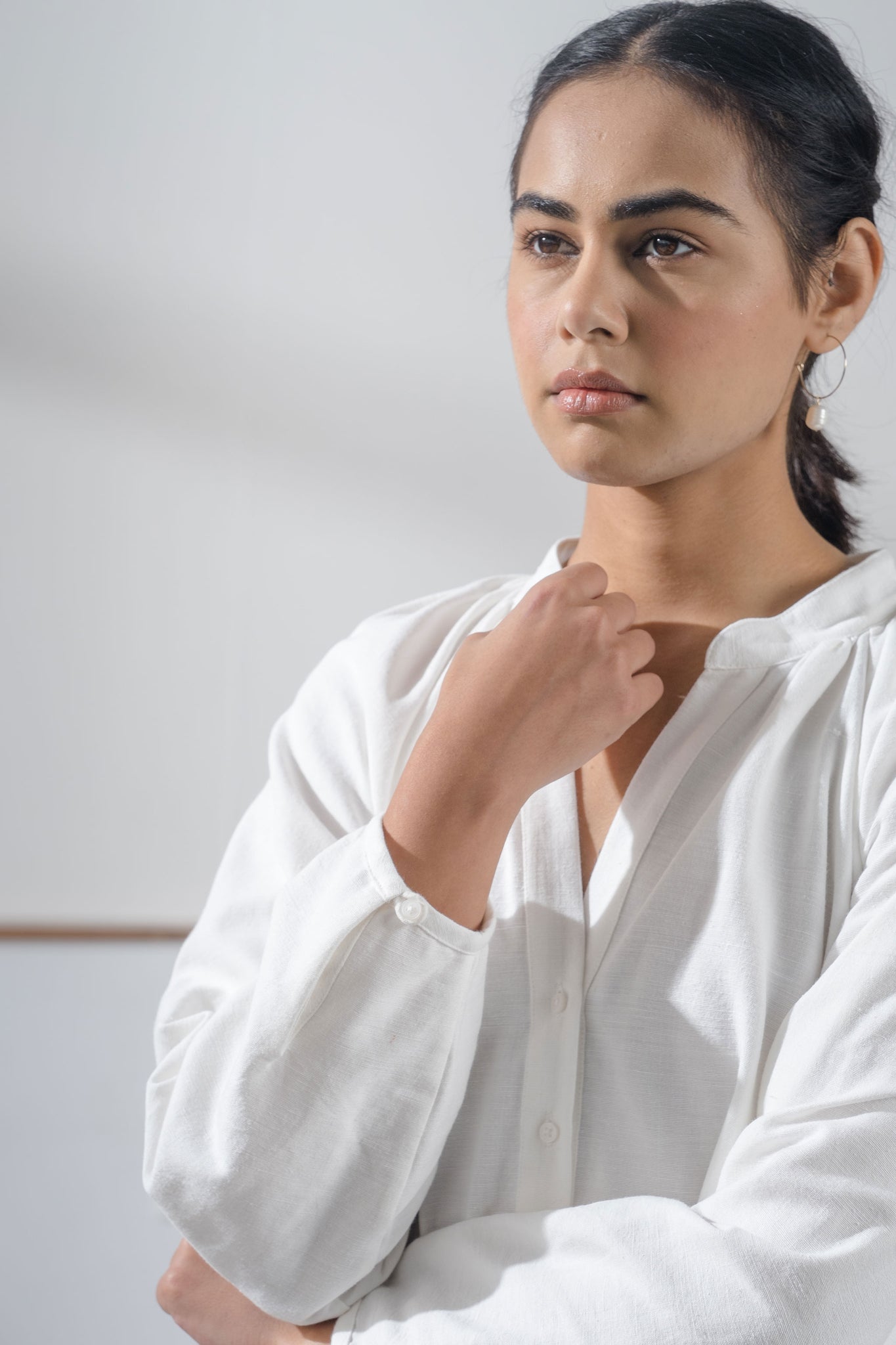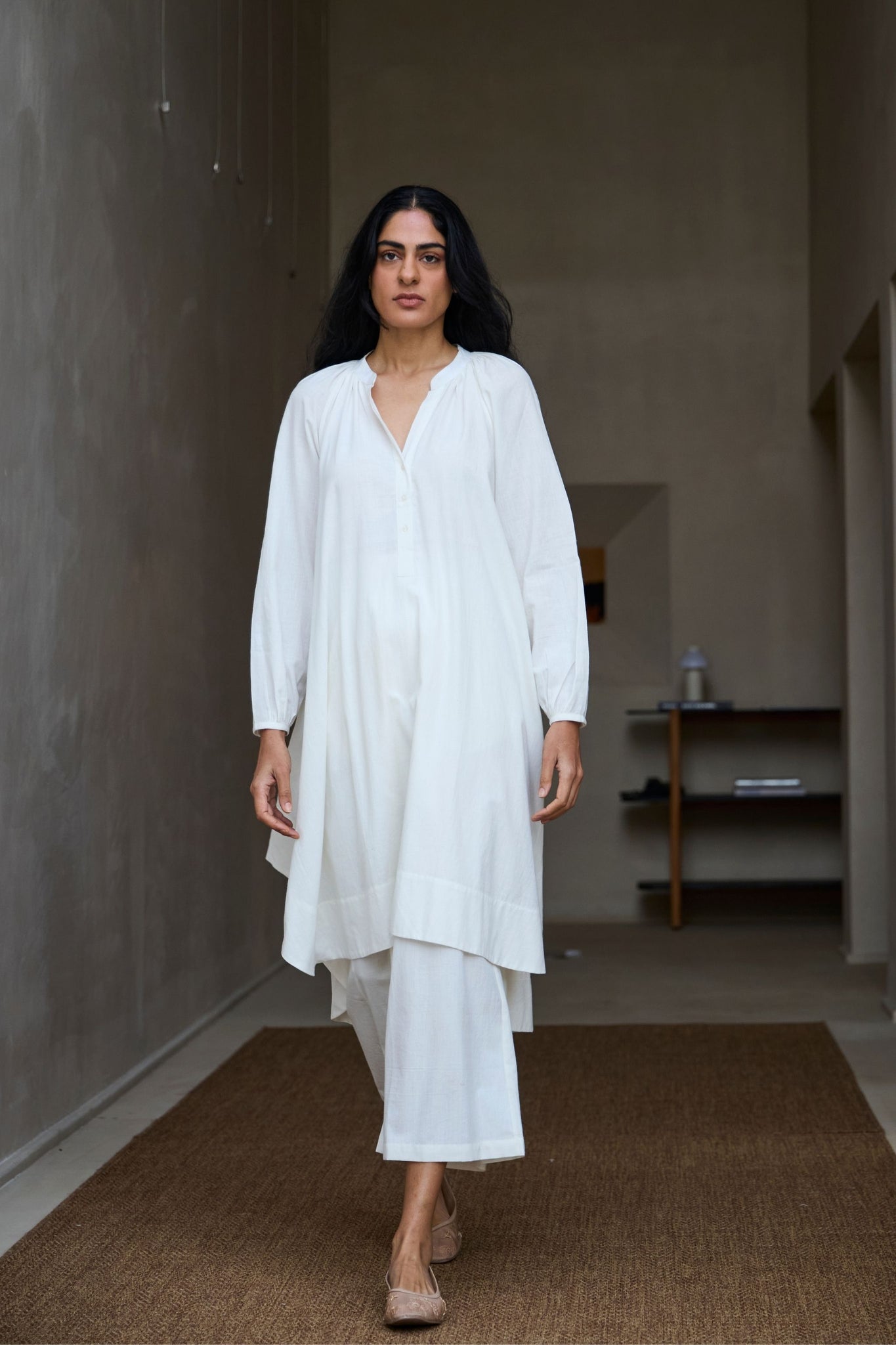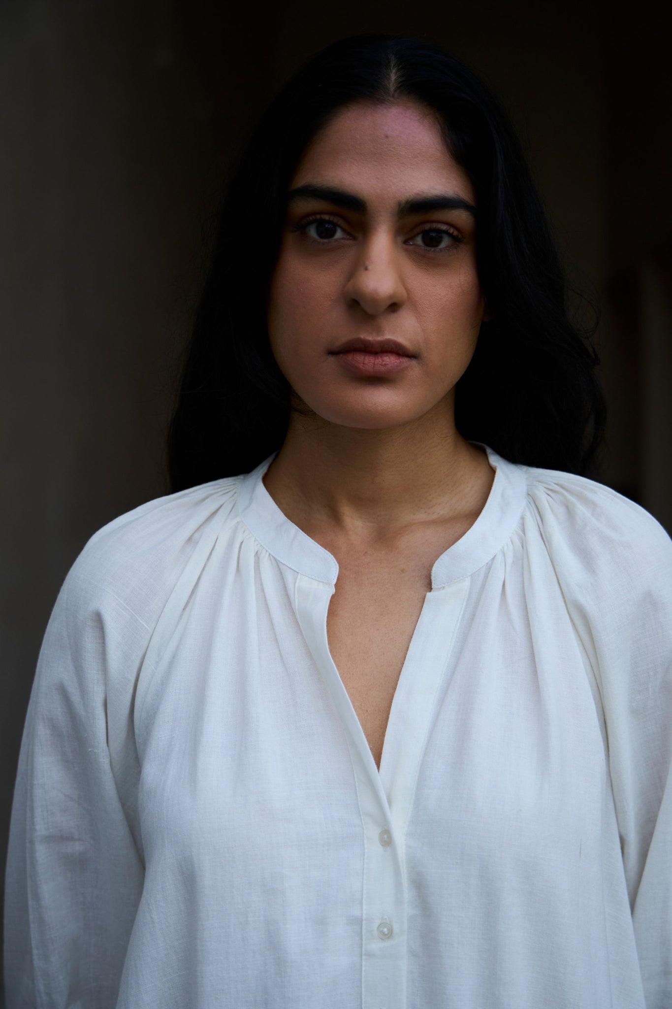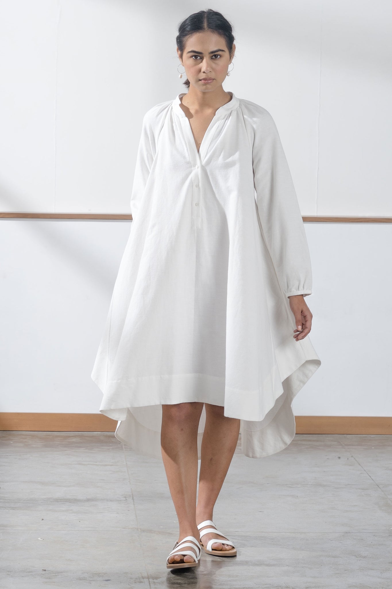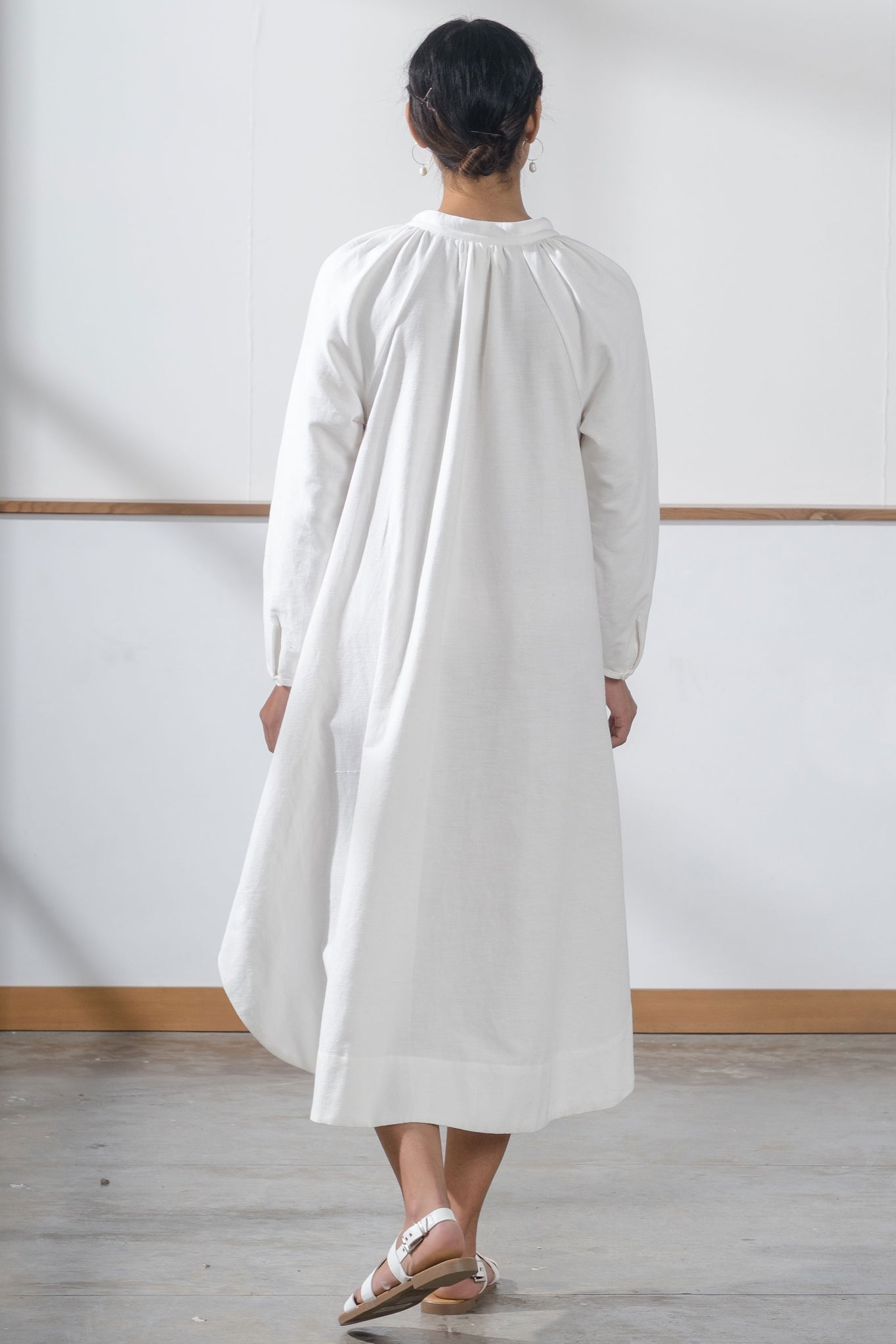A-line dress in artisanal khadi. Bounteous flare. Flat-band collar with three button placket. Delicate gathers around the collar and cuff. Bold tail hem. In-seam pockets.