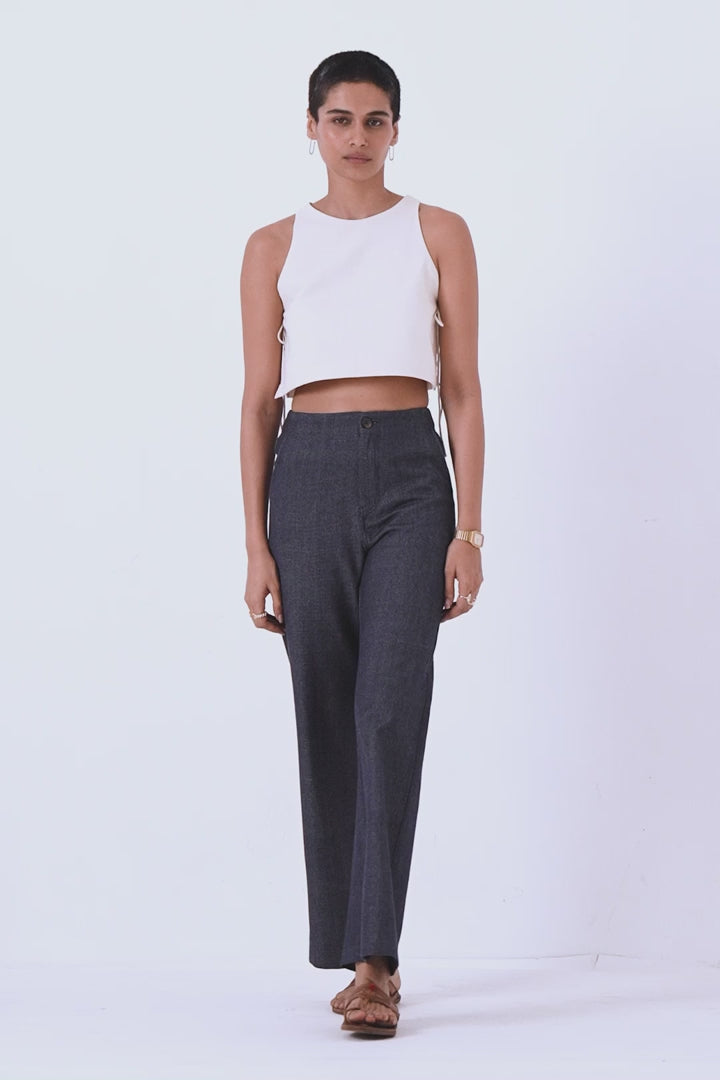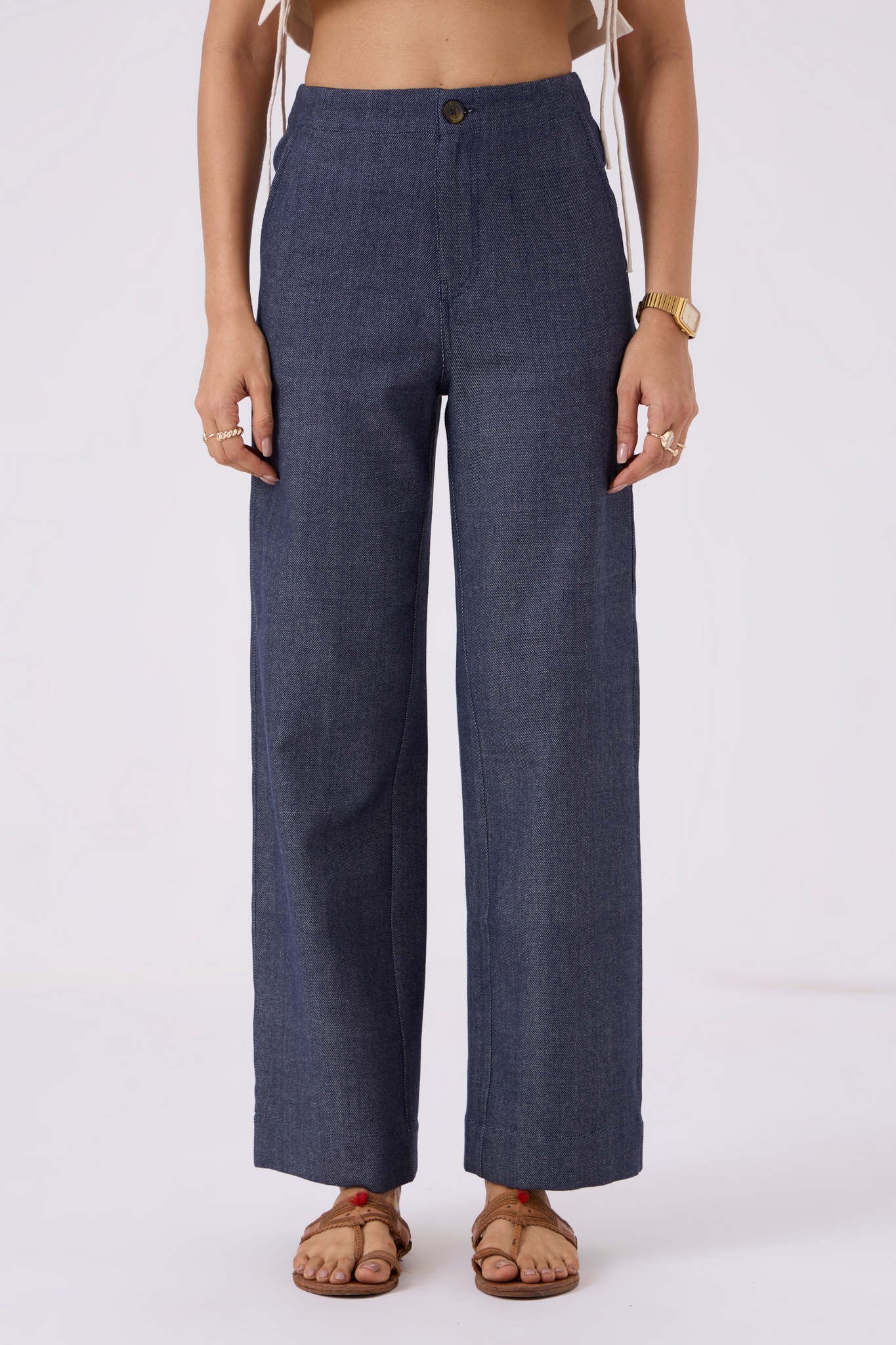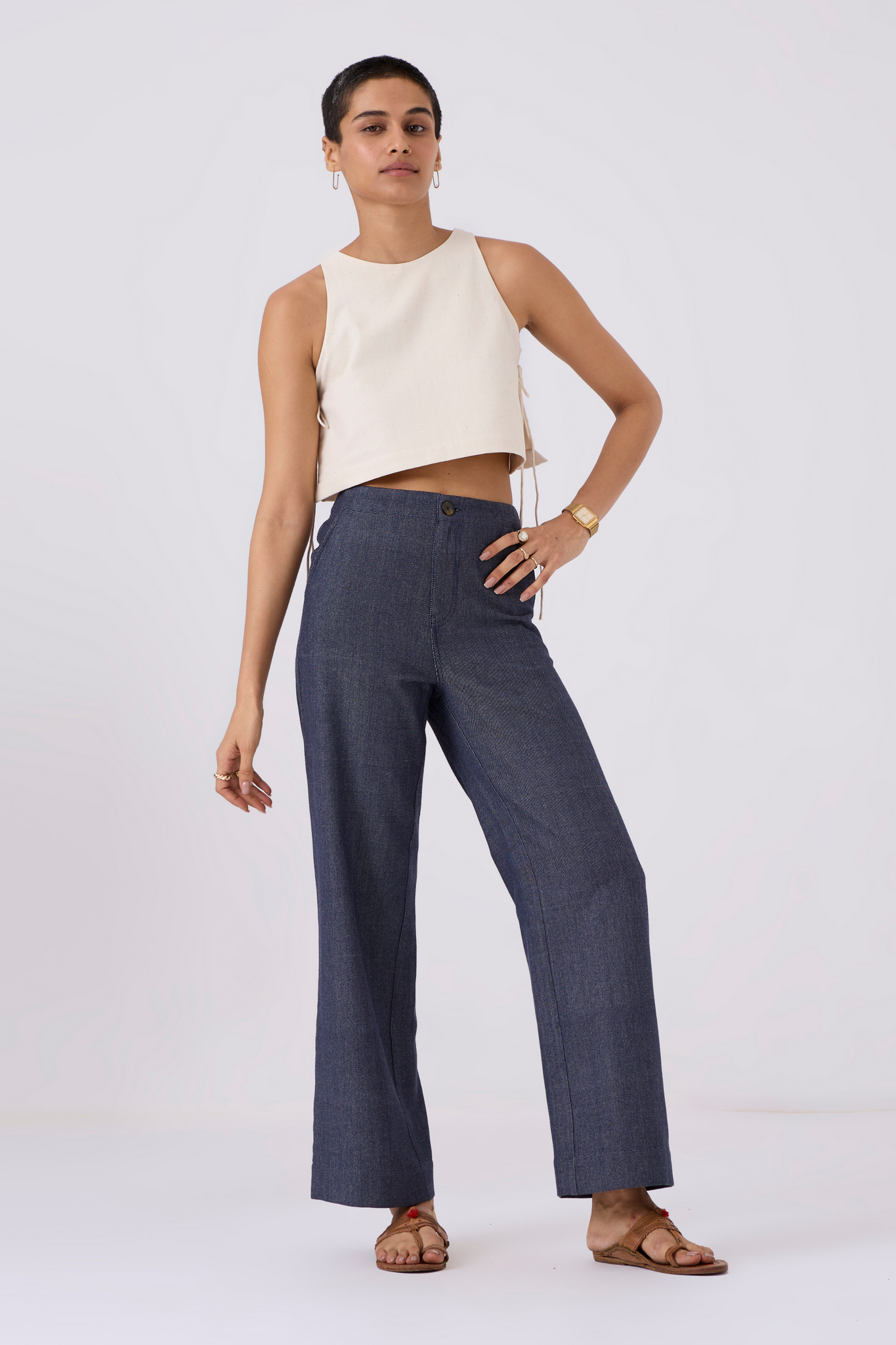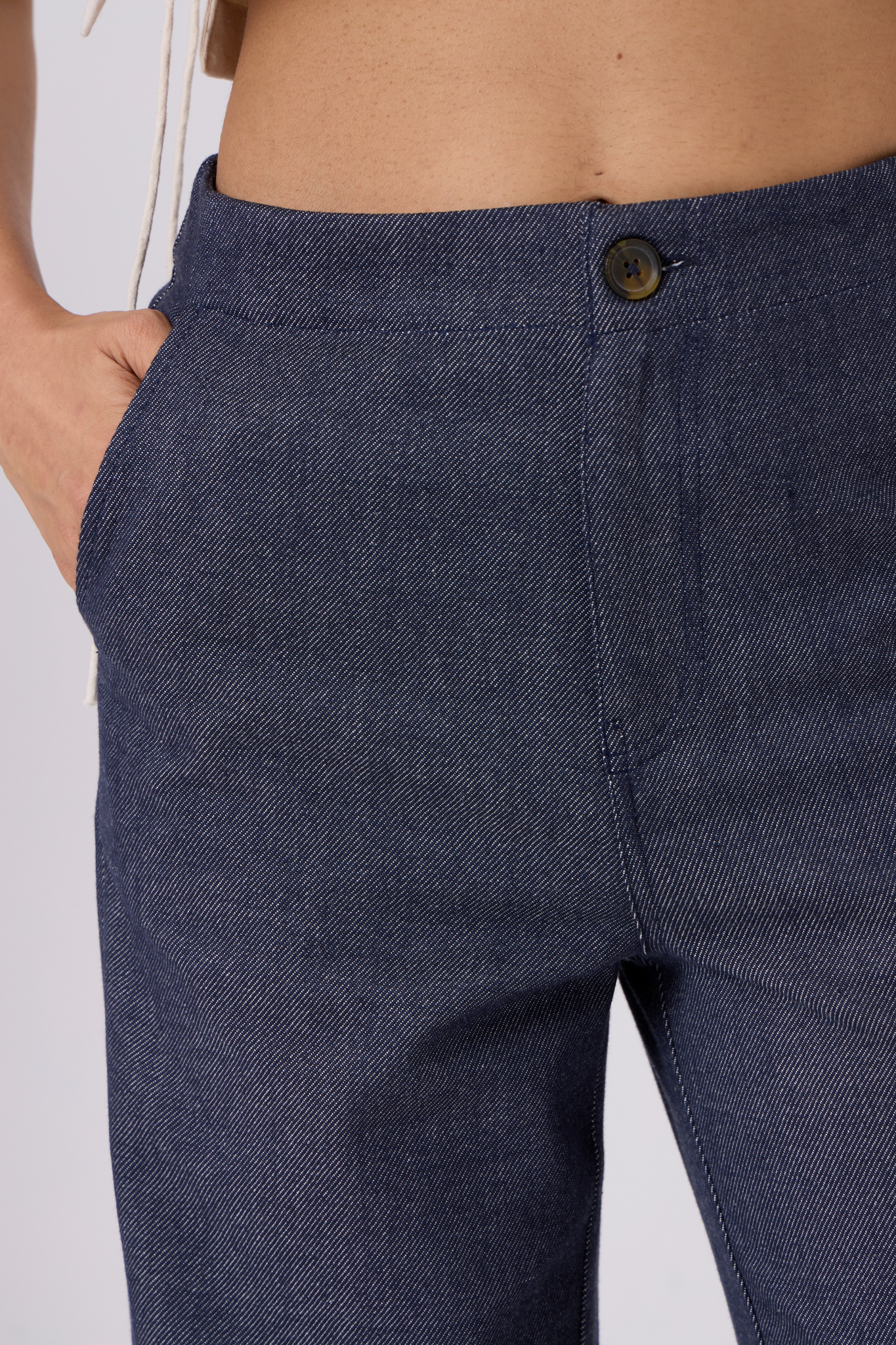 A straight leg mid rise pants with front fly button fastening and cross pockets