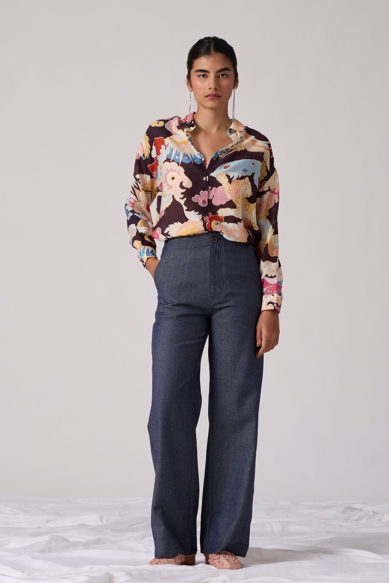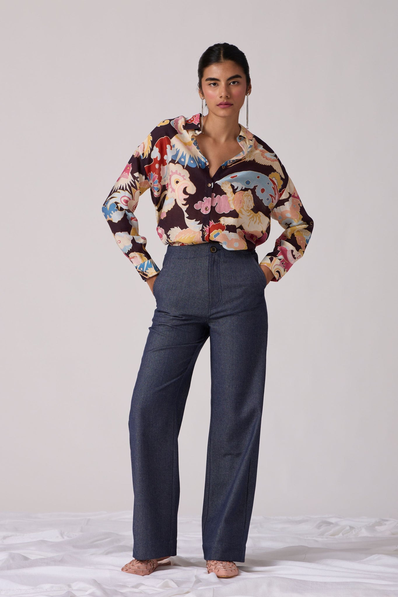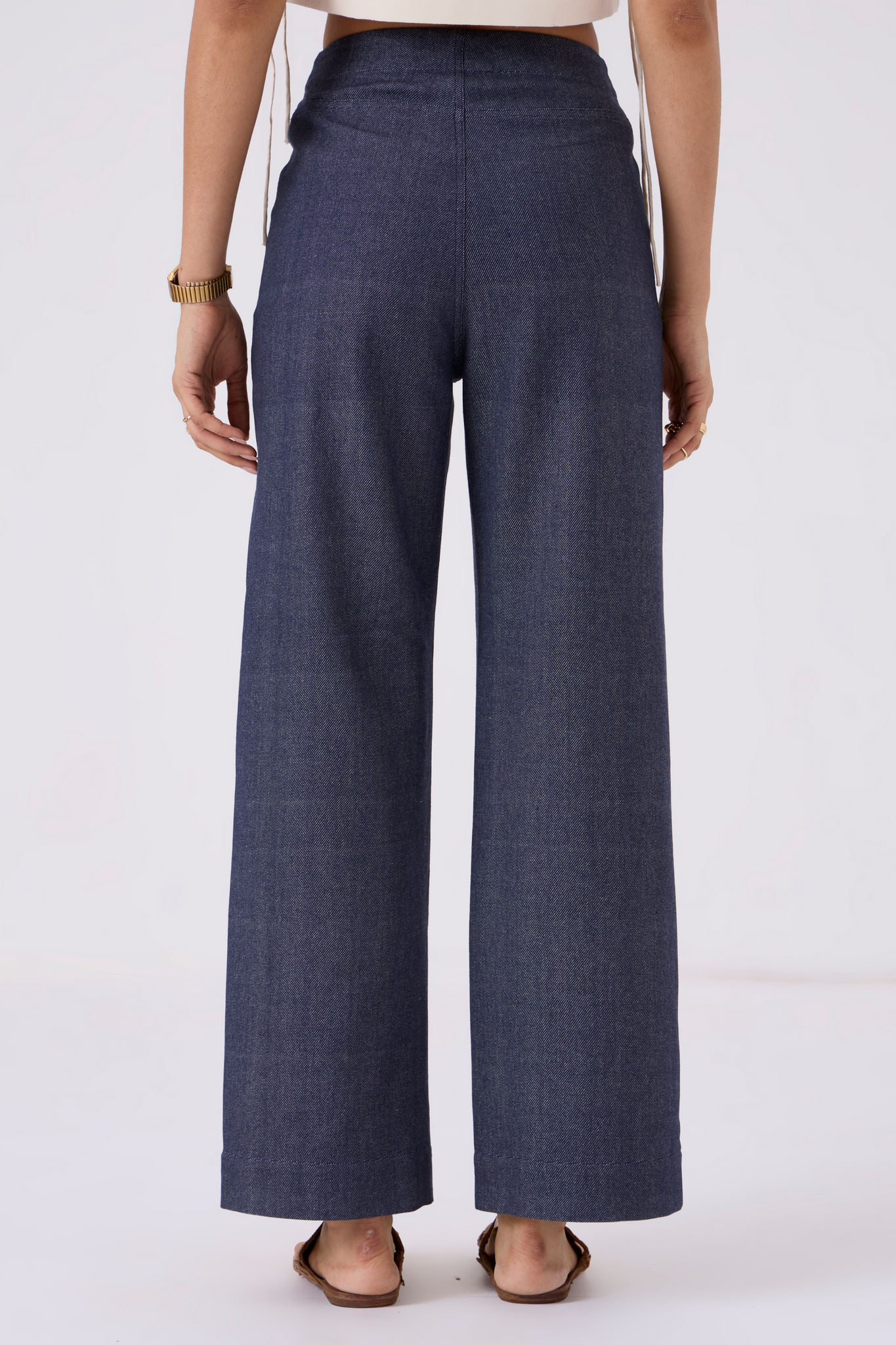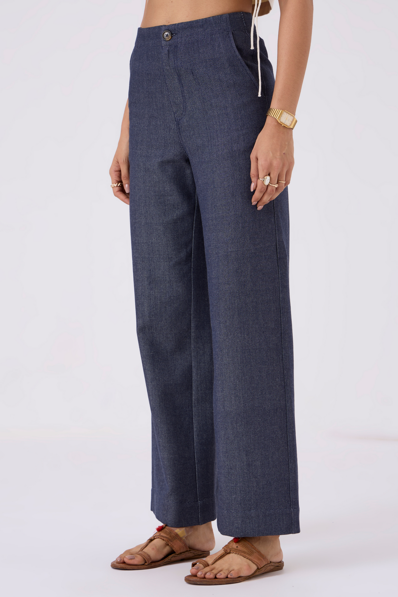 A straight leg mid rise pants with front fly button fastening and cross pockets