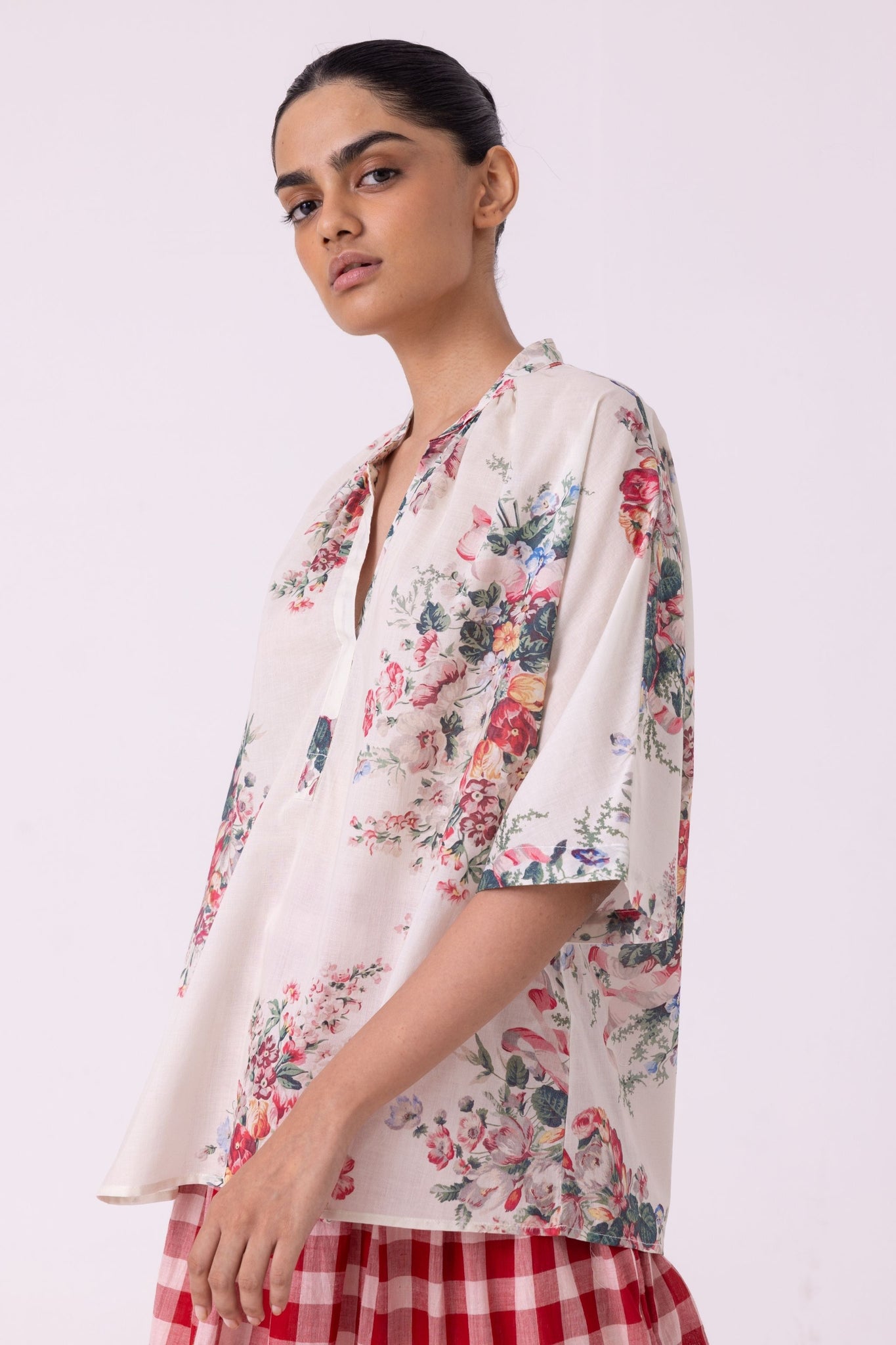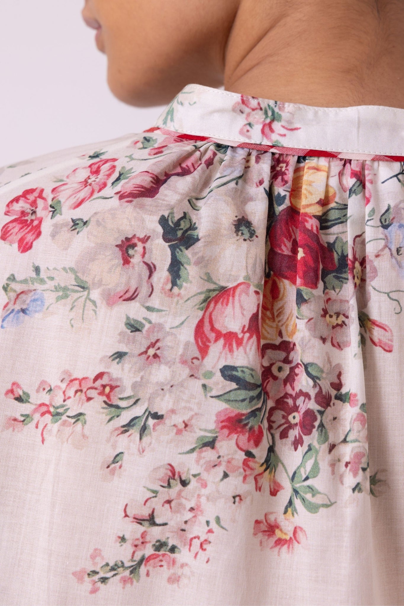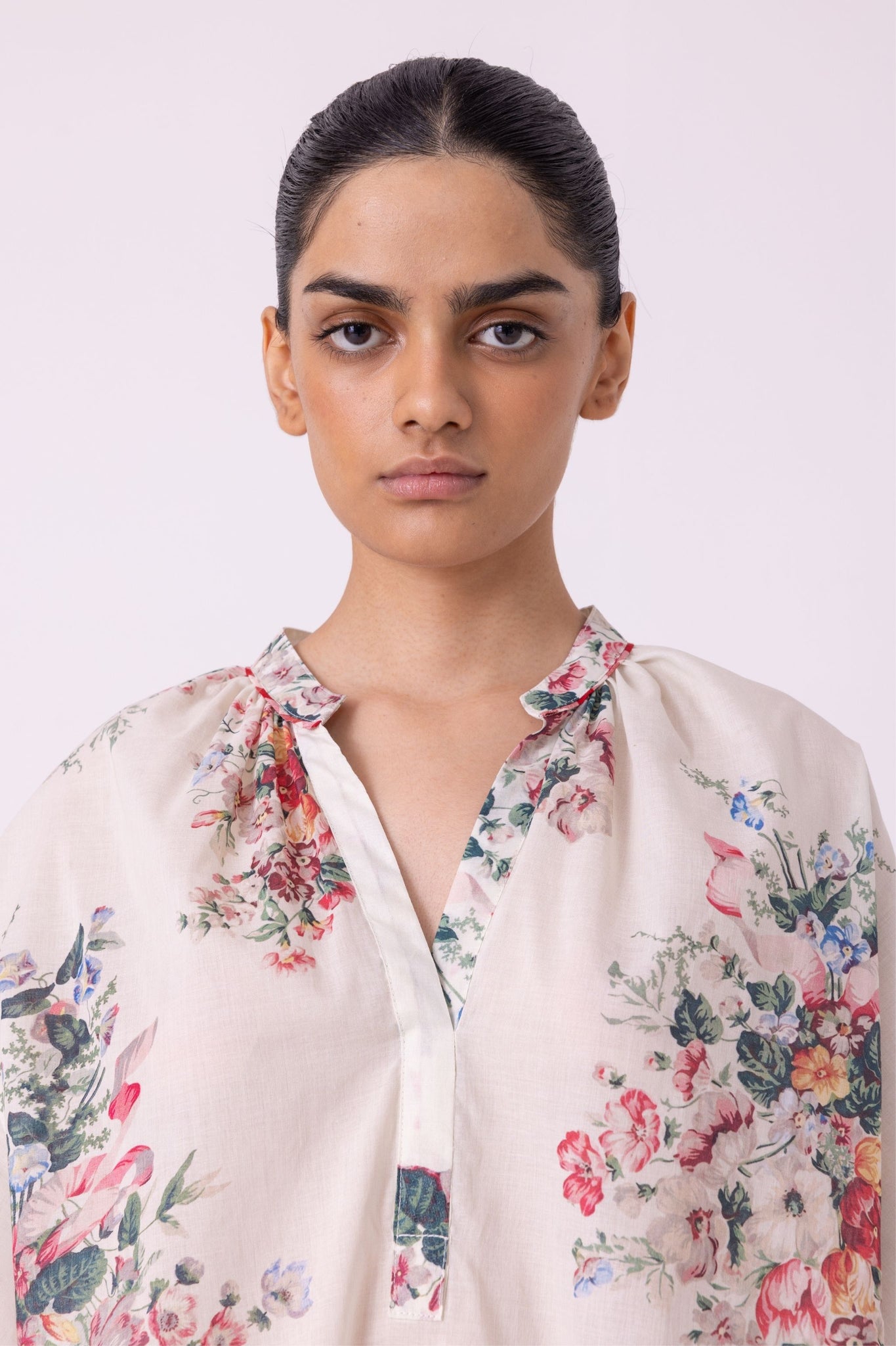 Gathering at the neckline, piping at the band. Beautiful details in close conversation. Elbow length sleeves in organic cotton voile that moves the moment you do. One size, generously cut to suit Indian summers.