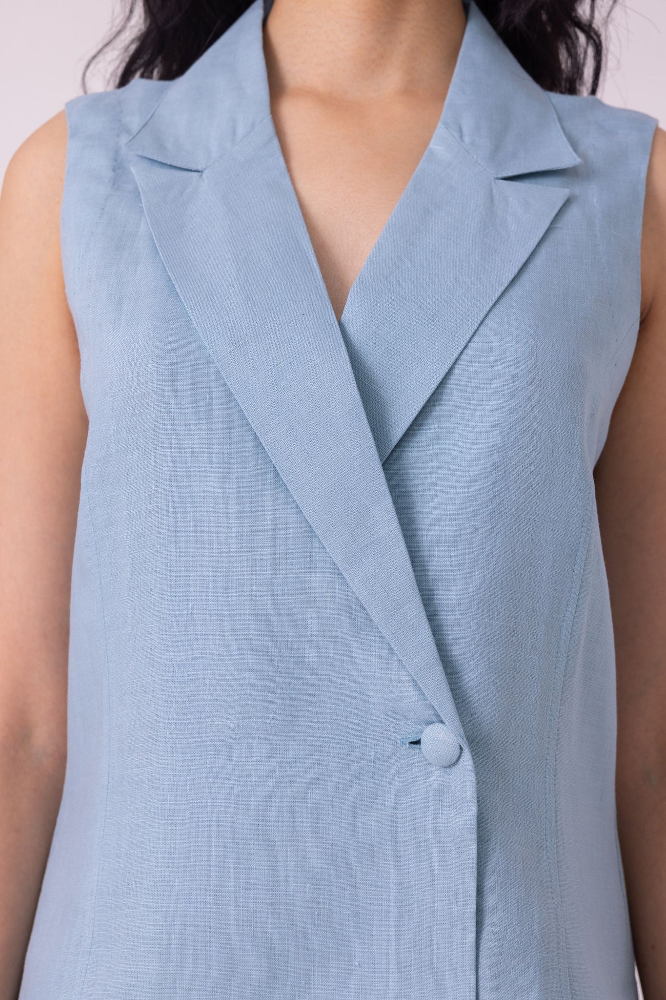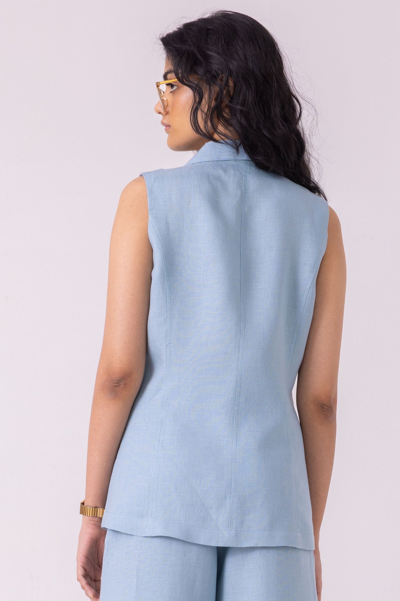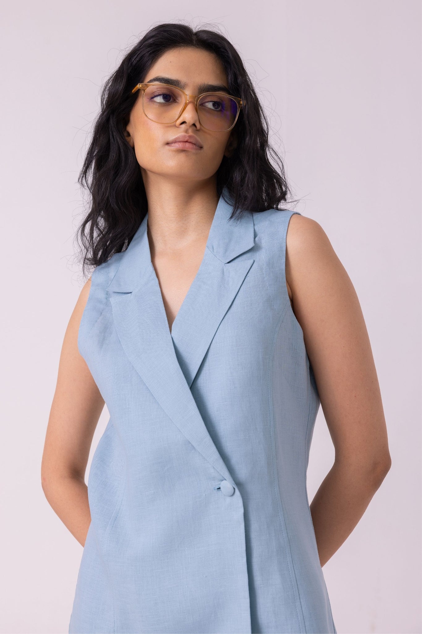 A shawl collar on a sleeveless cut is a contradiction that works - relaxed at the shoulder, considered at the neck. The panelling cinches without asking. Wear it over everything, including a sari.