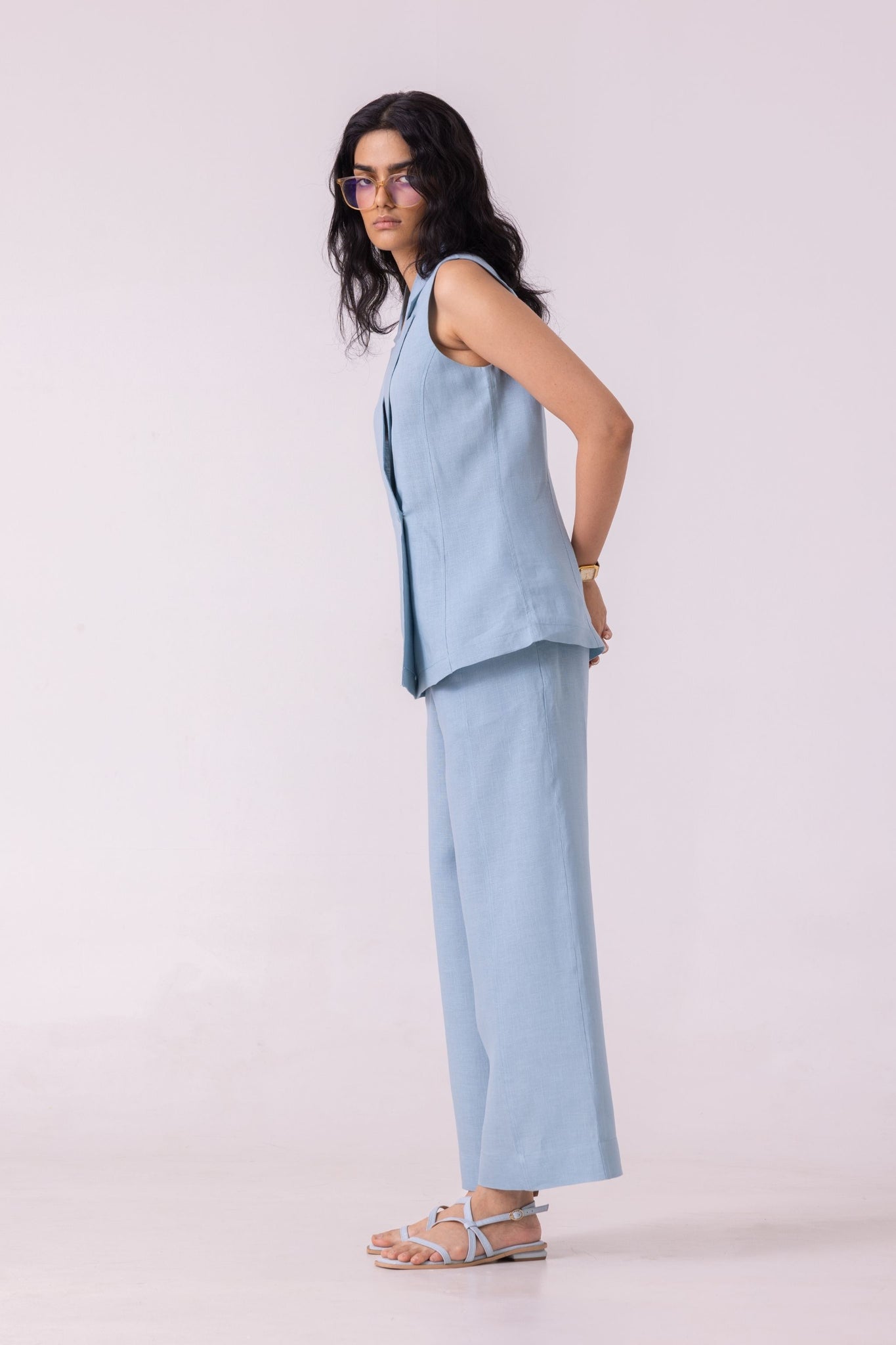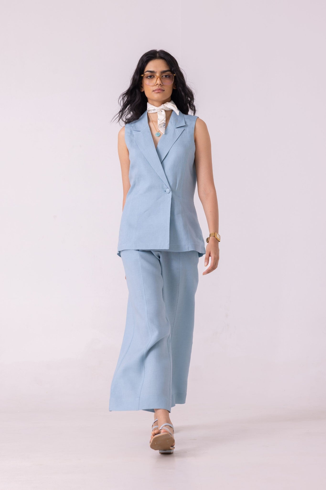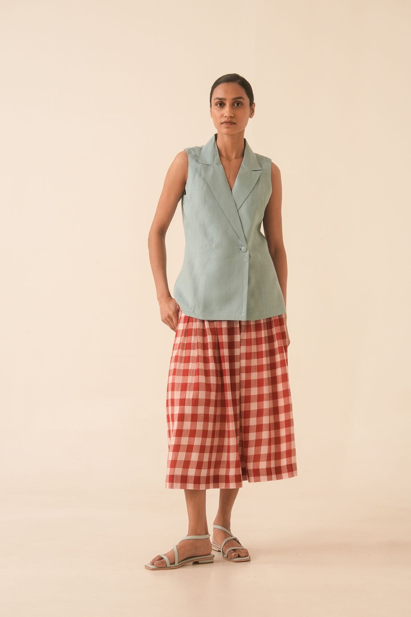 A shawl collar on a sleeveless cut is a contradiction that works - relaxed at the shoulder, considered at the neck. The panelling cinches without asking. Wear it over everything, including a sari.