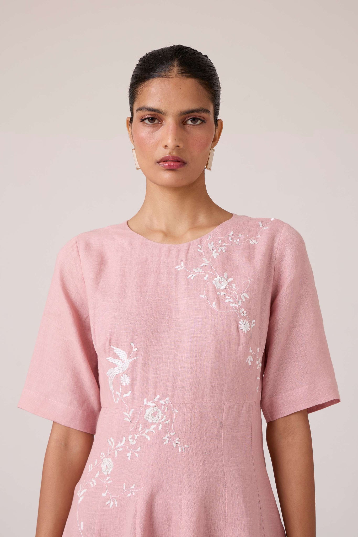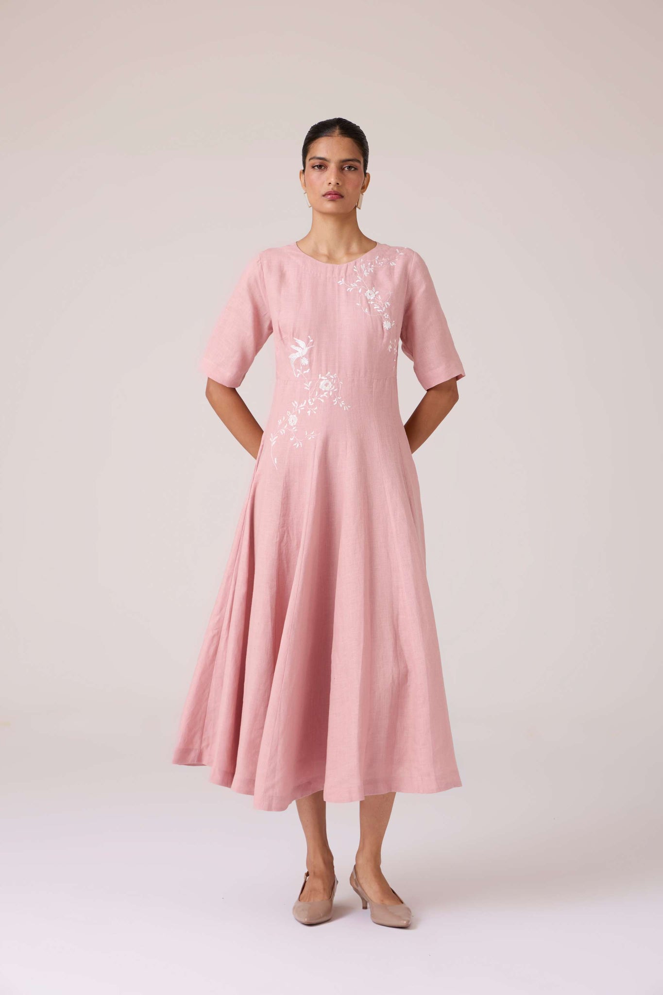 Embroidery lends quiet punctuation to structure. A close neckline, fitted waist, and balanced flare carry the dress with composed elegance.