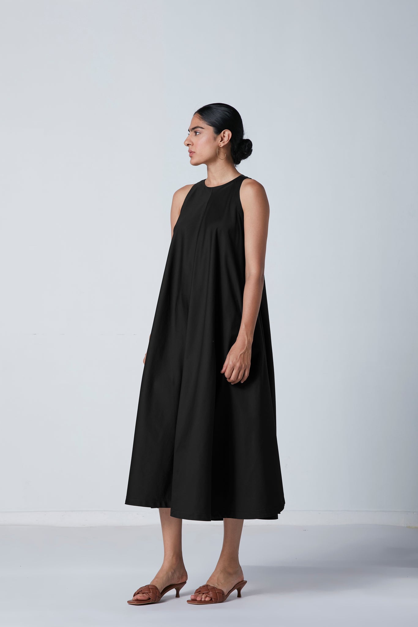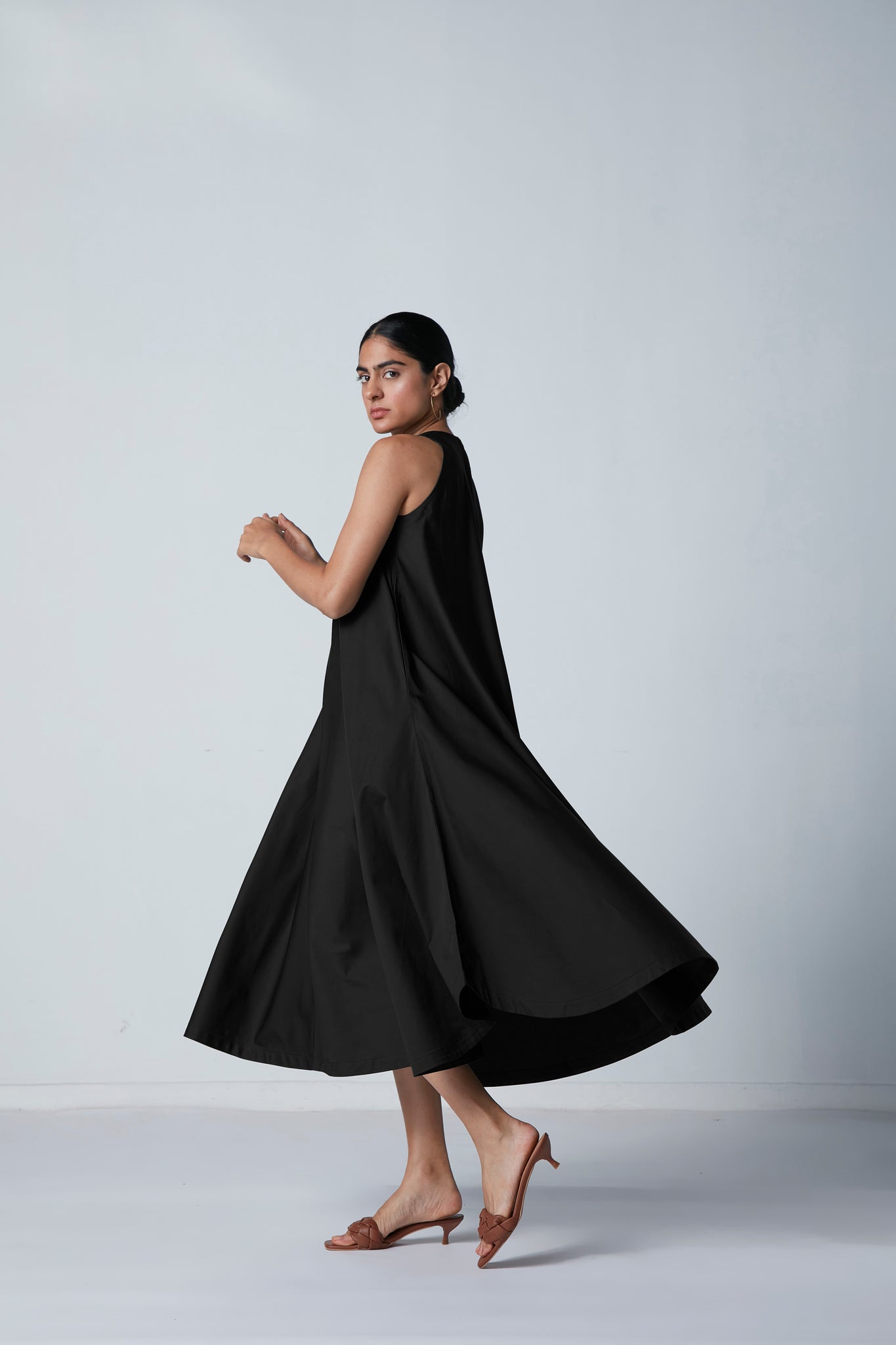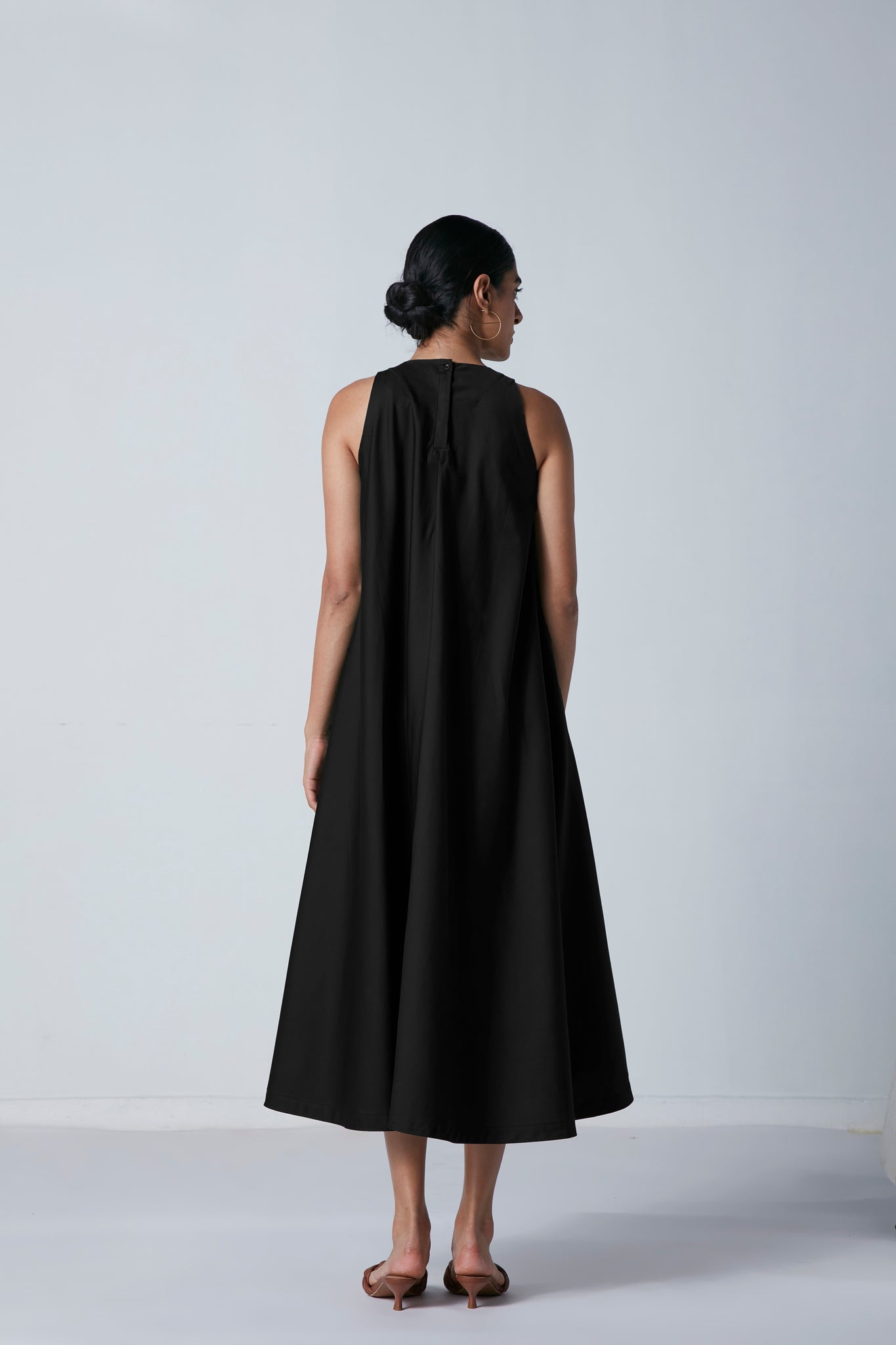 Midi dress with bounteous flare featuring a slight high low hem. Modern high neckline with cutaway shoulders. Pairs well with a belt too. Inseam pockets.