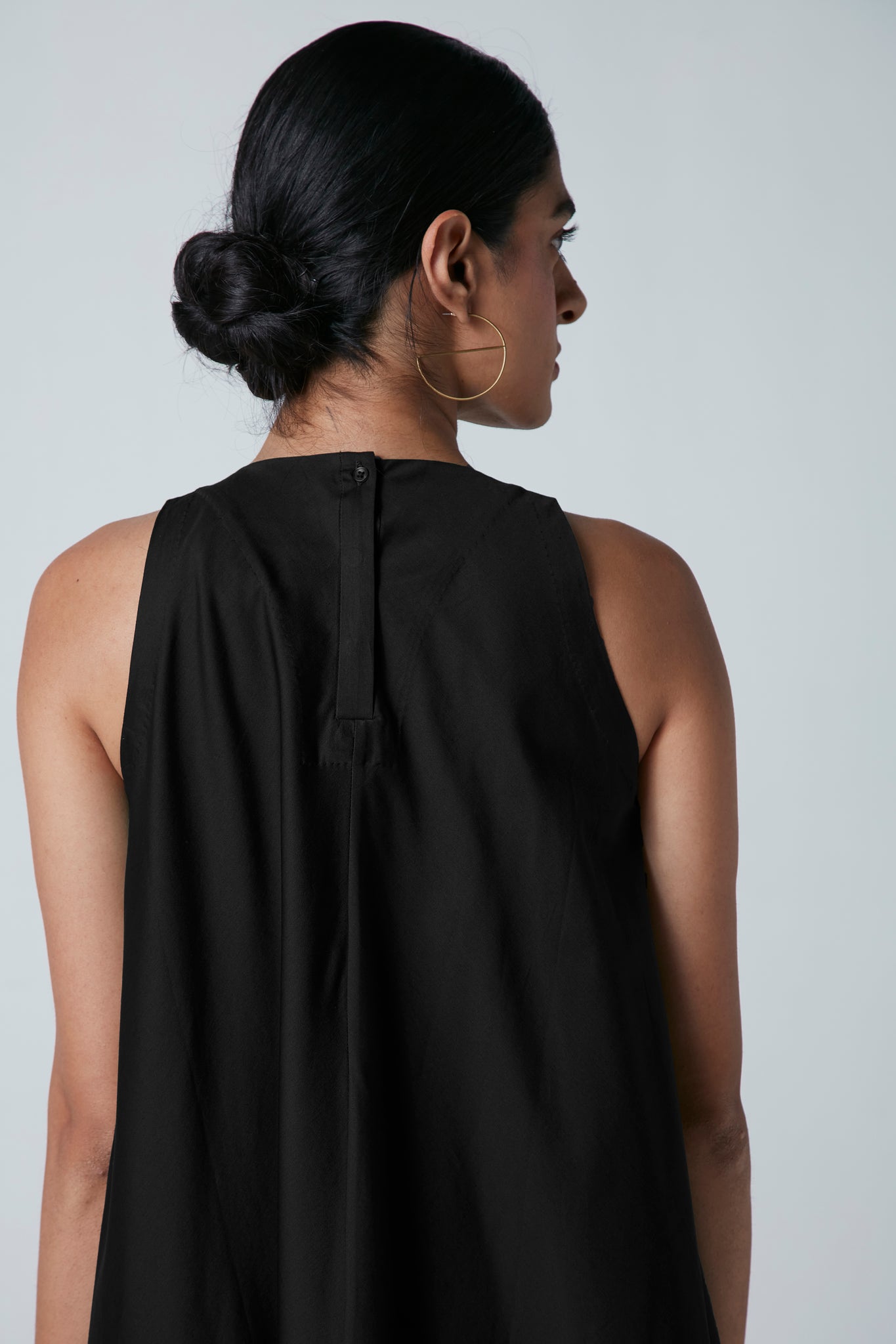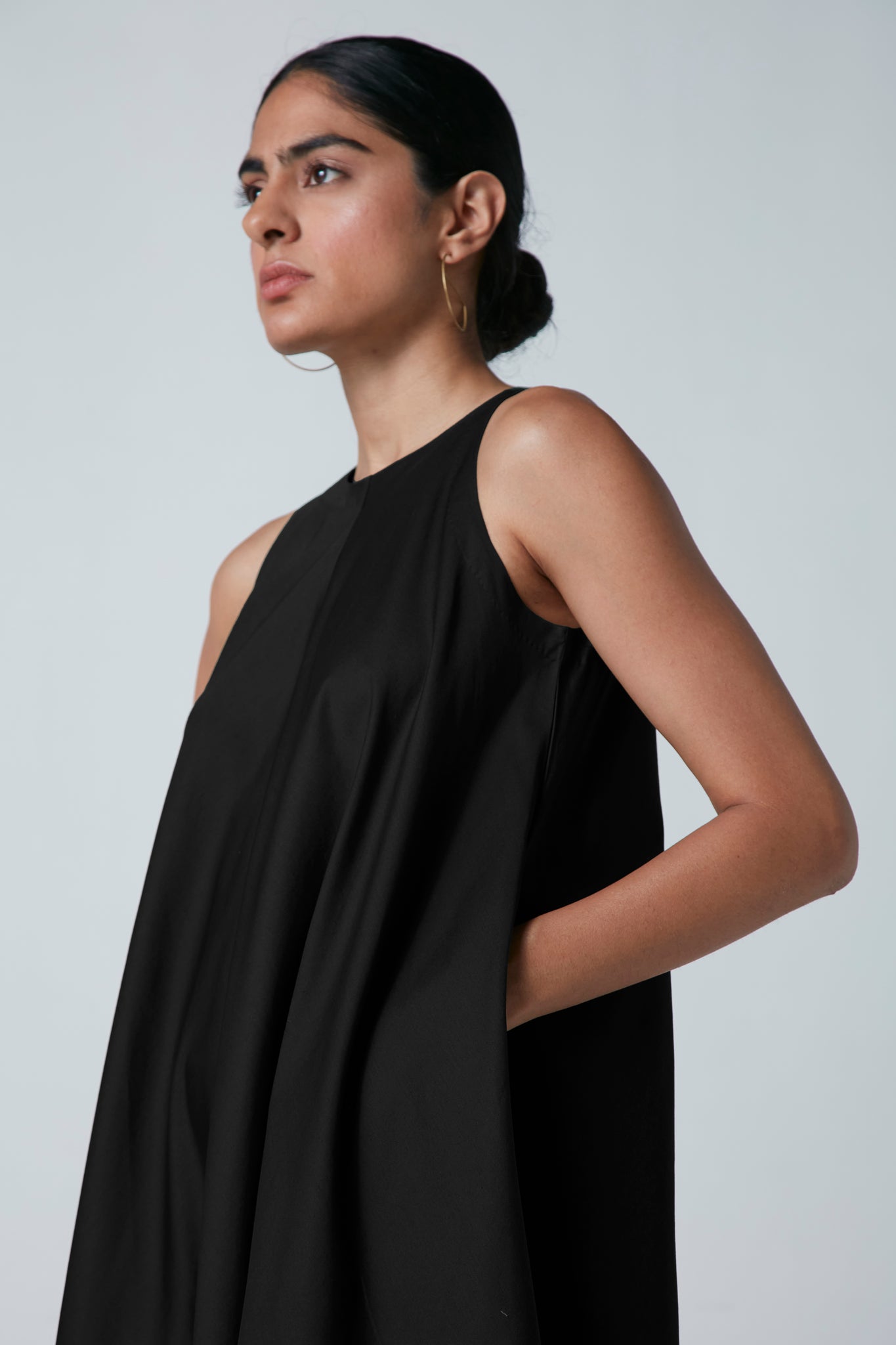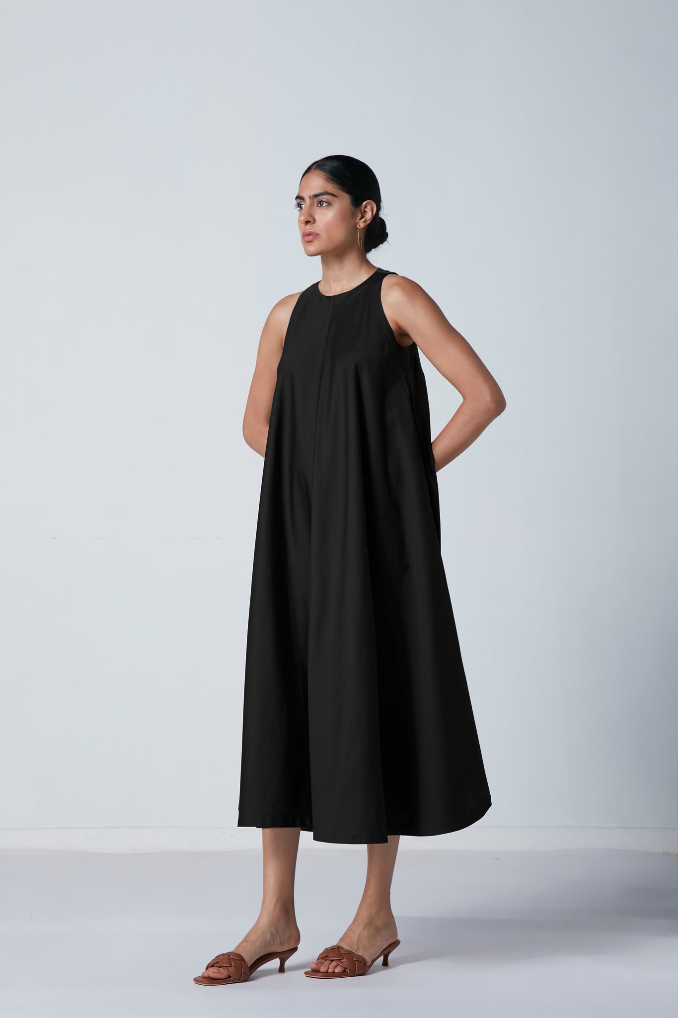 Midi dress with bounteous flare featuring a slight high low hem. Modern high neckline with cutaway shoulders. Pairs well with a belt too. Inseam pockets.