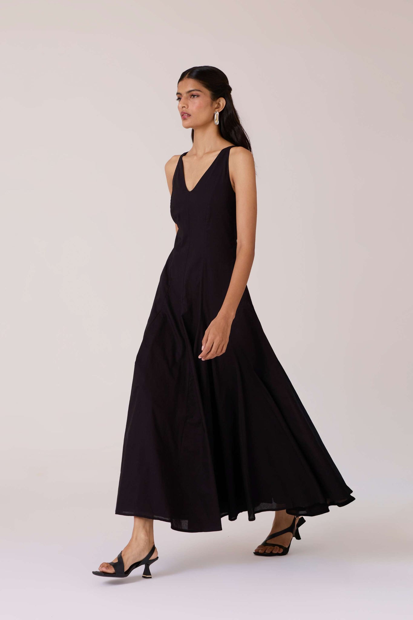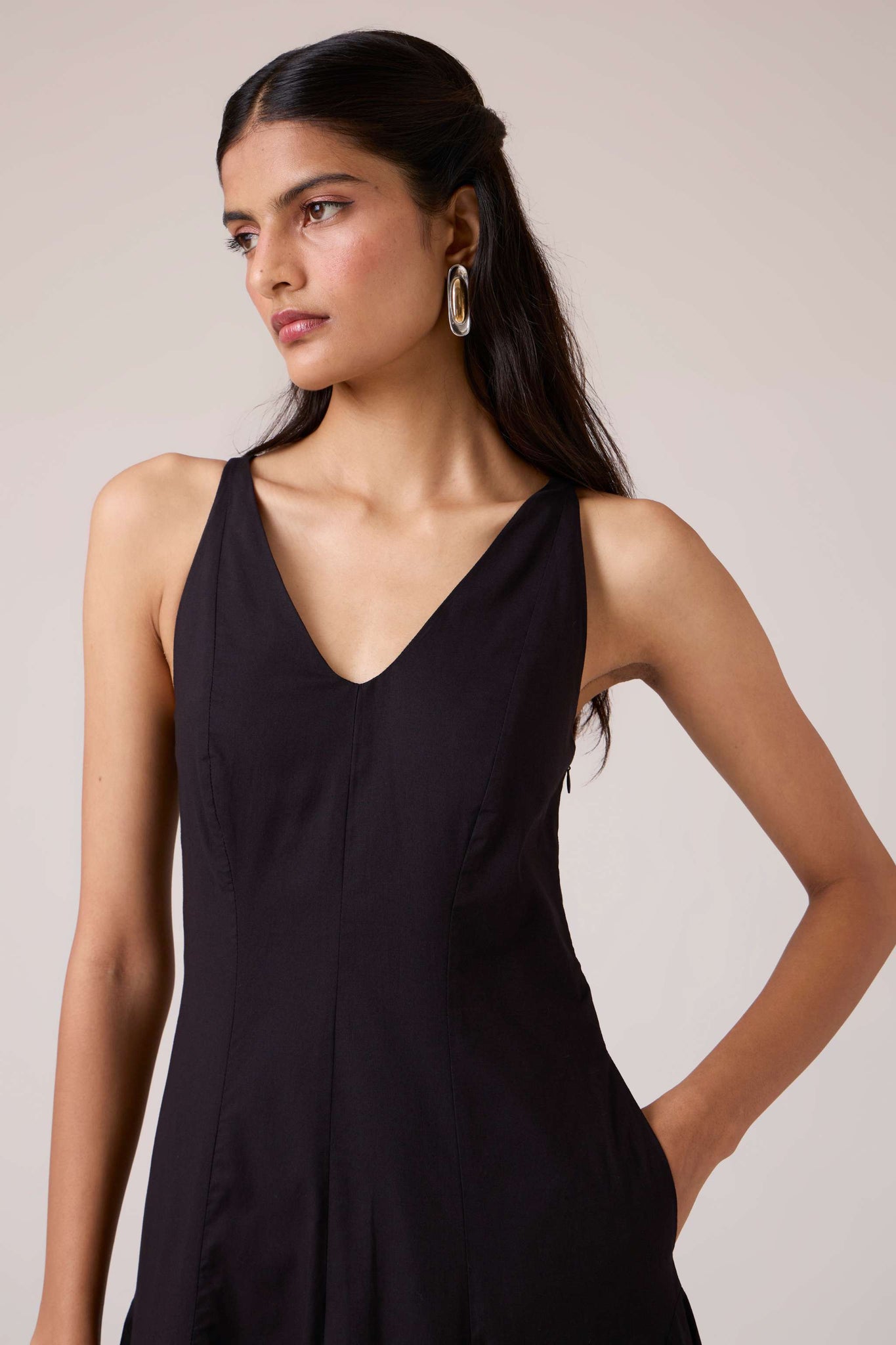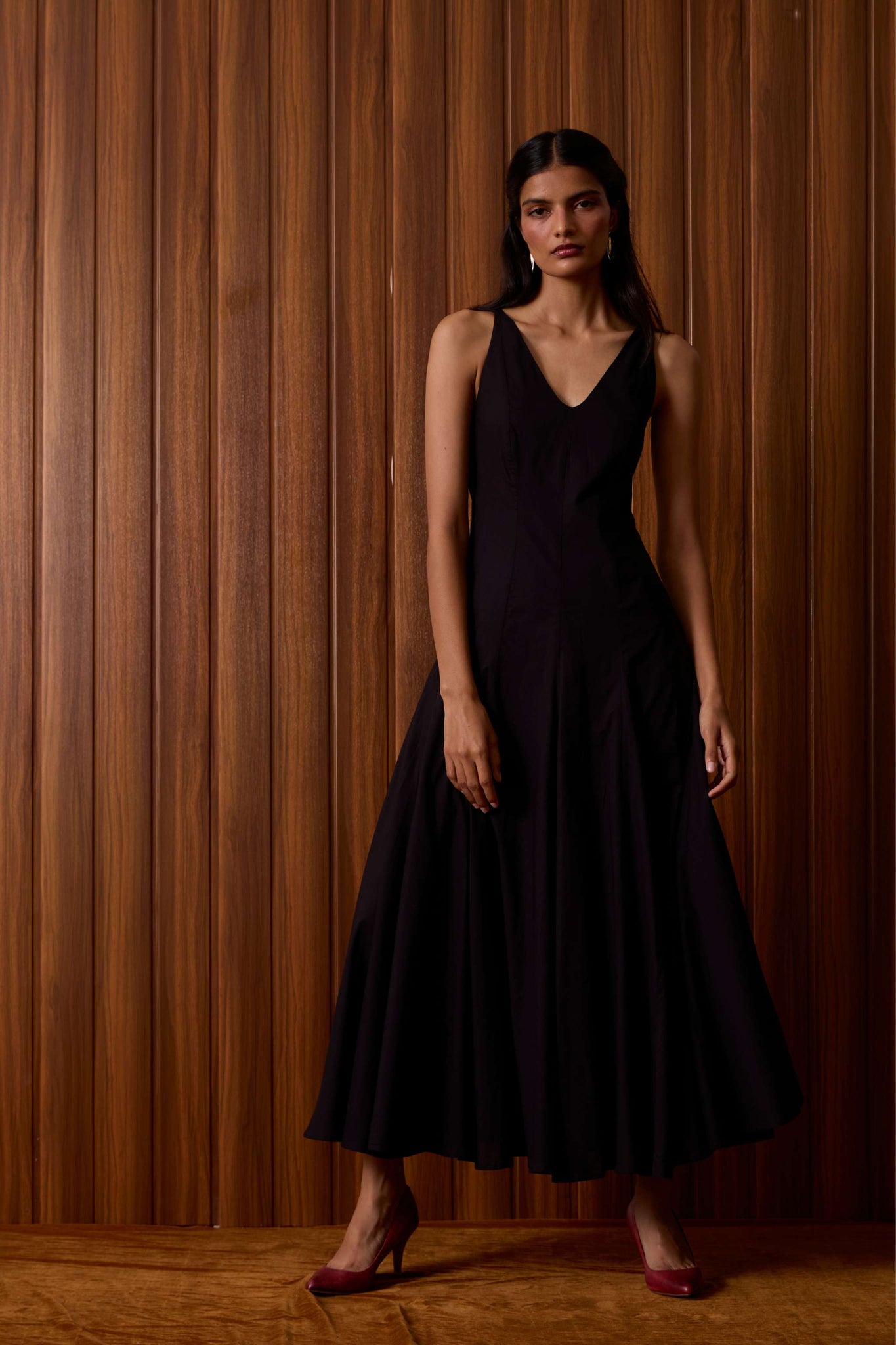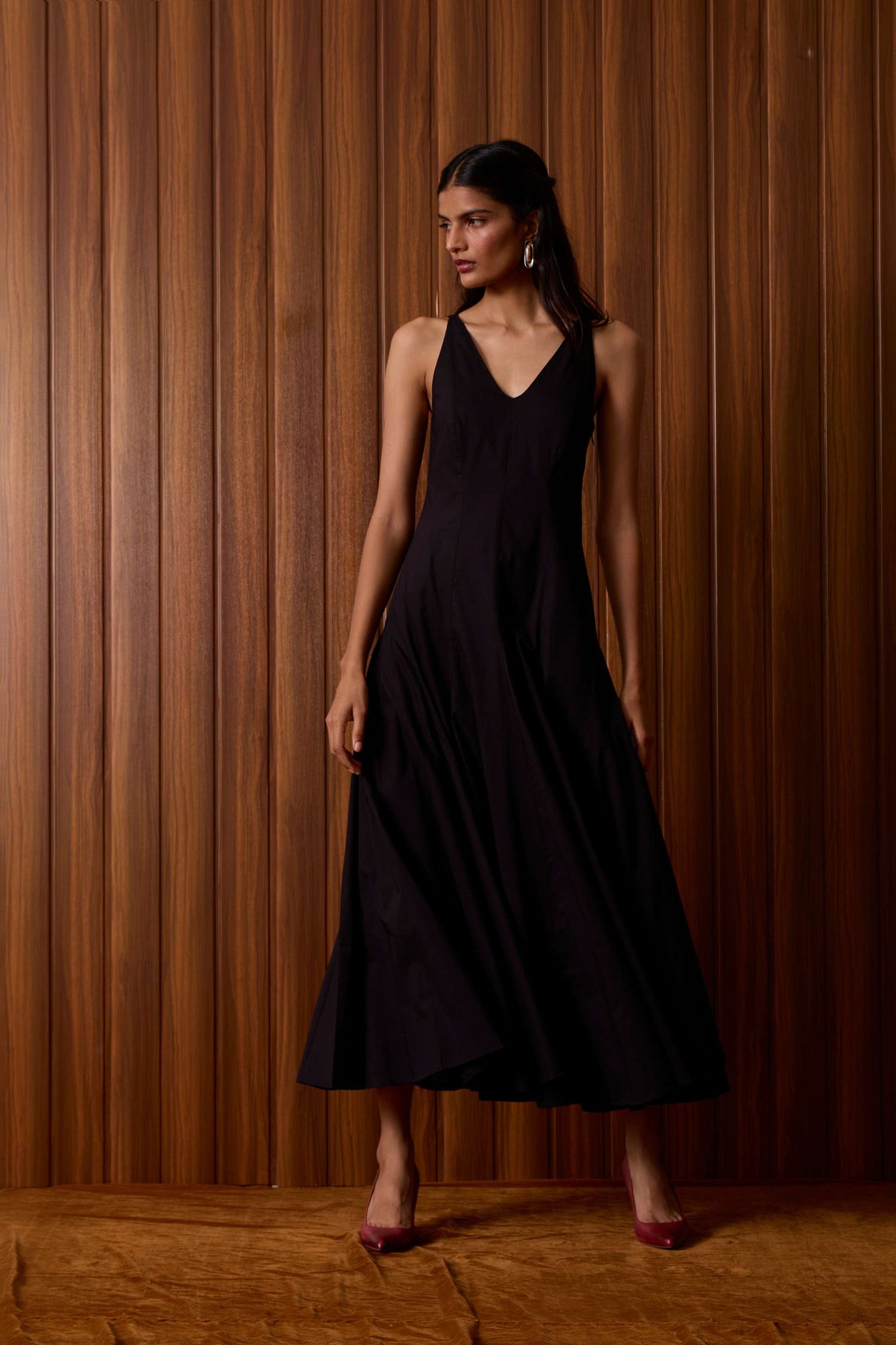 Clean planes, long lines. A V-neck dress pared back to structure, free of embellishment, steady in cut.