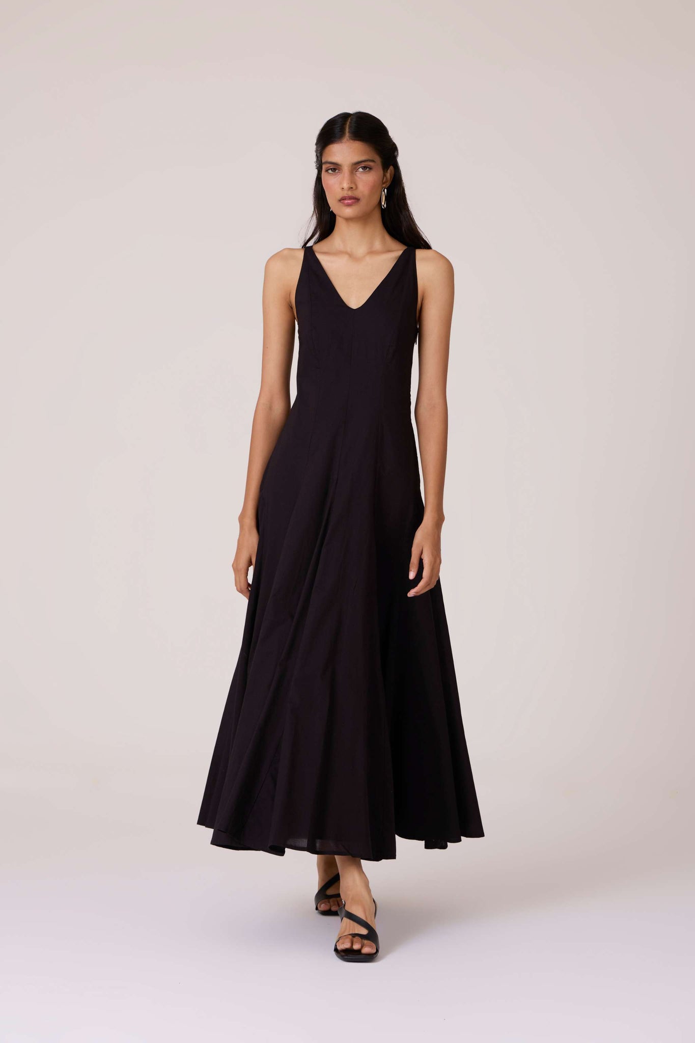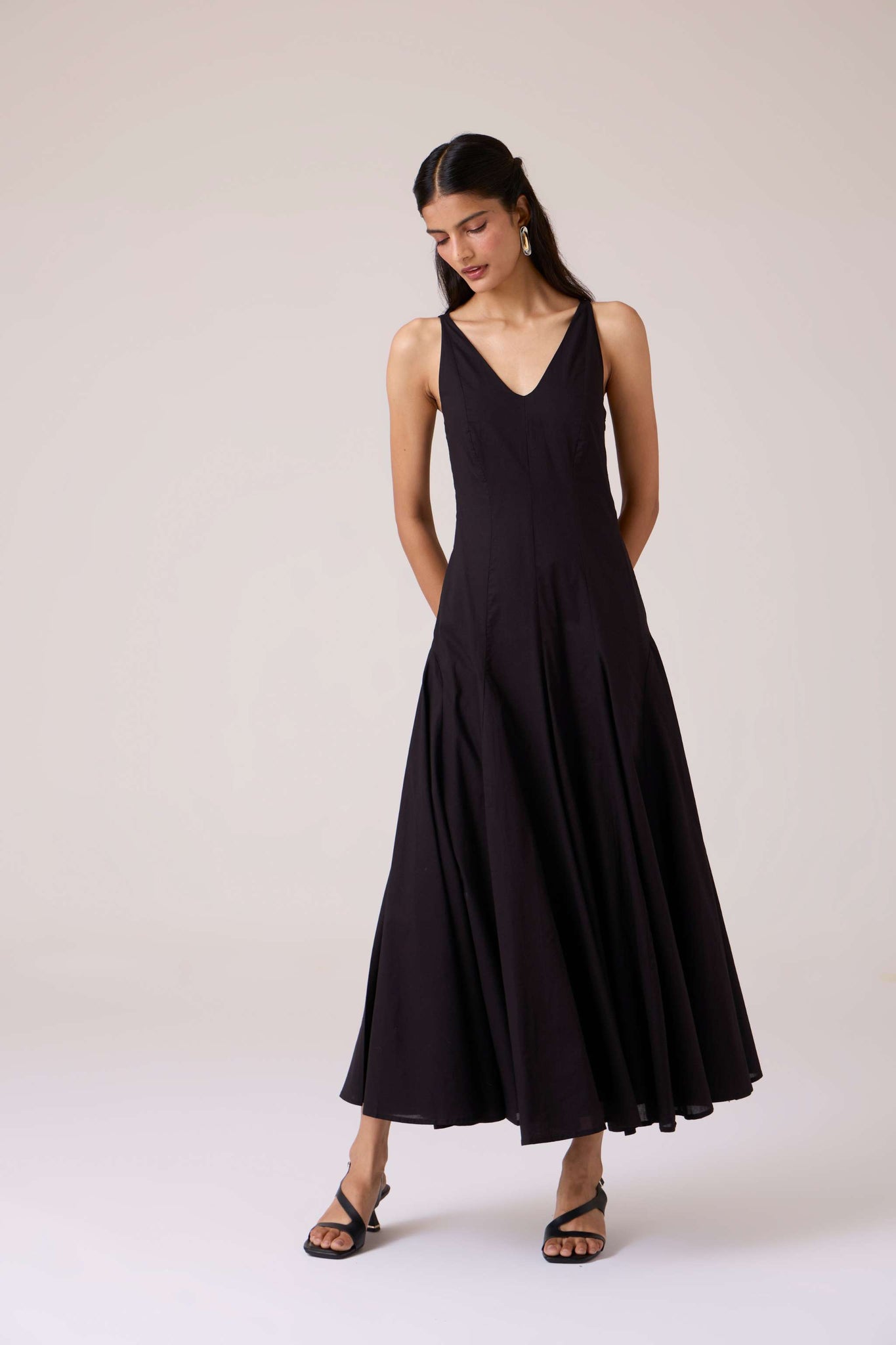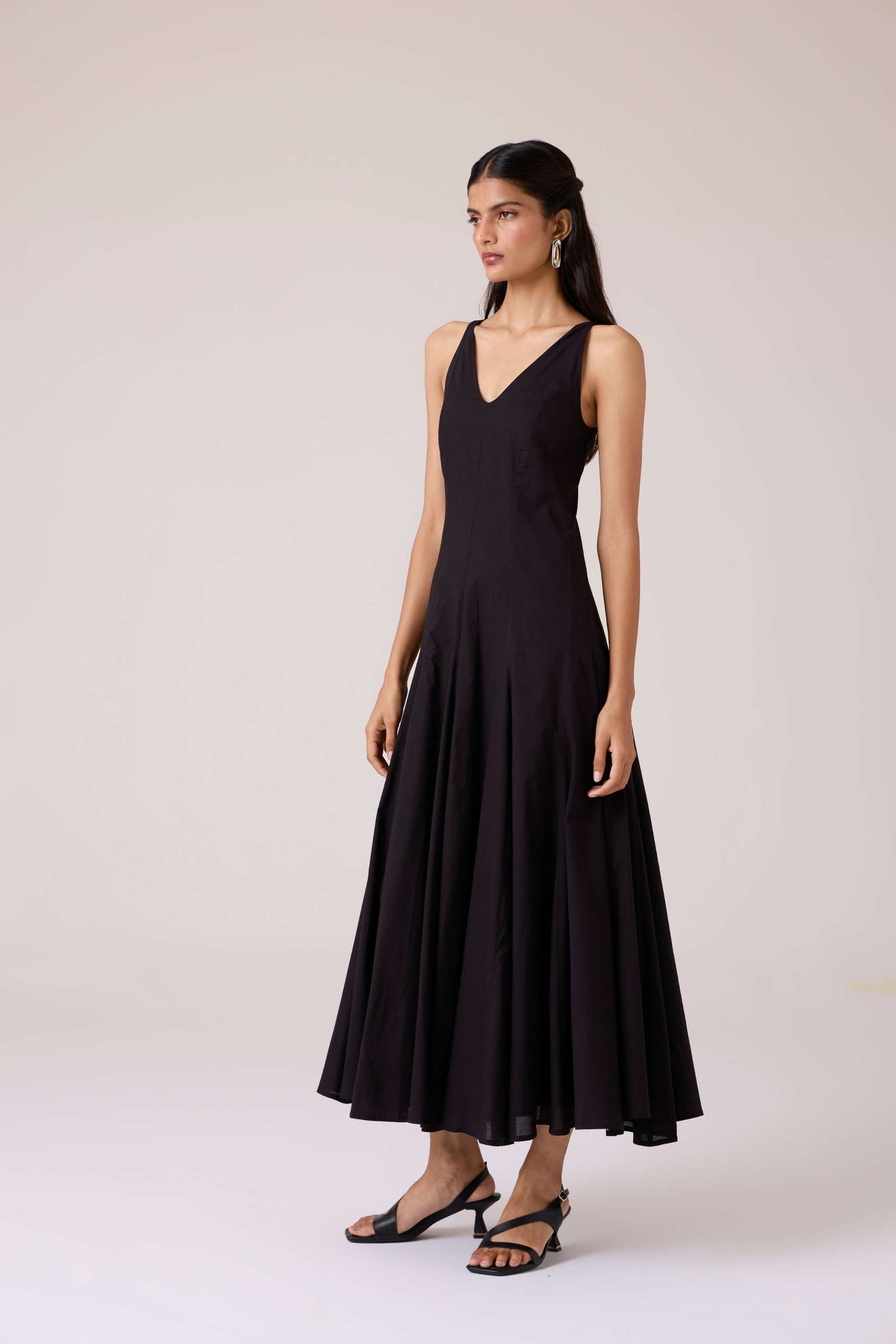 Clean planes, long lines. A V-neck dress pared back to structure, free of embellishment, steady in cut.