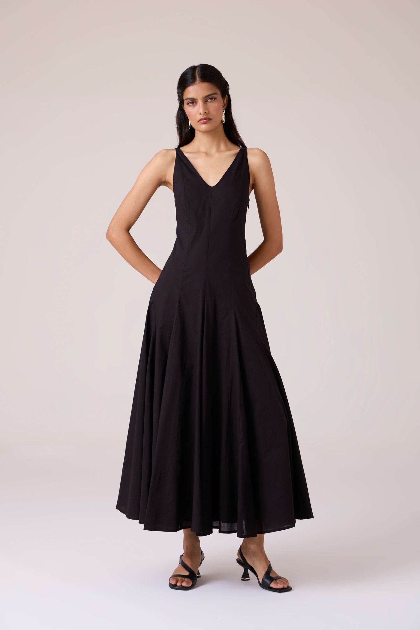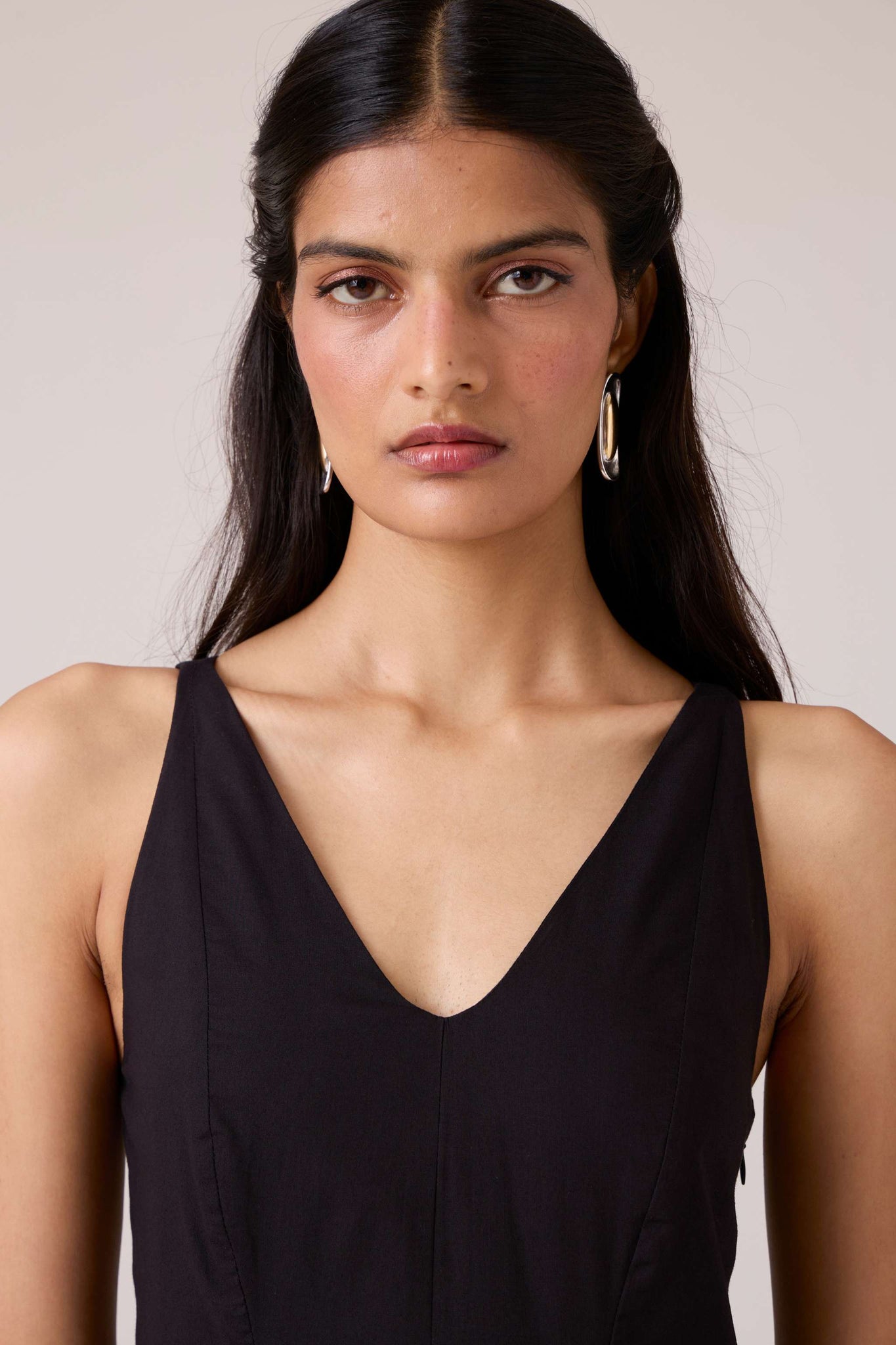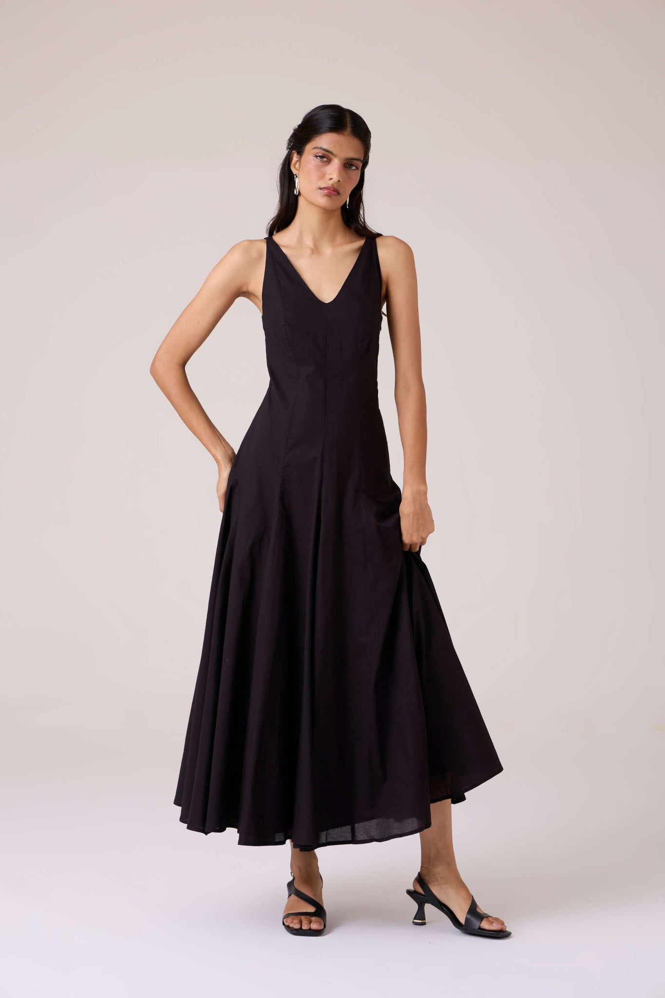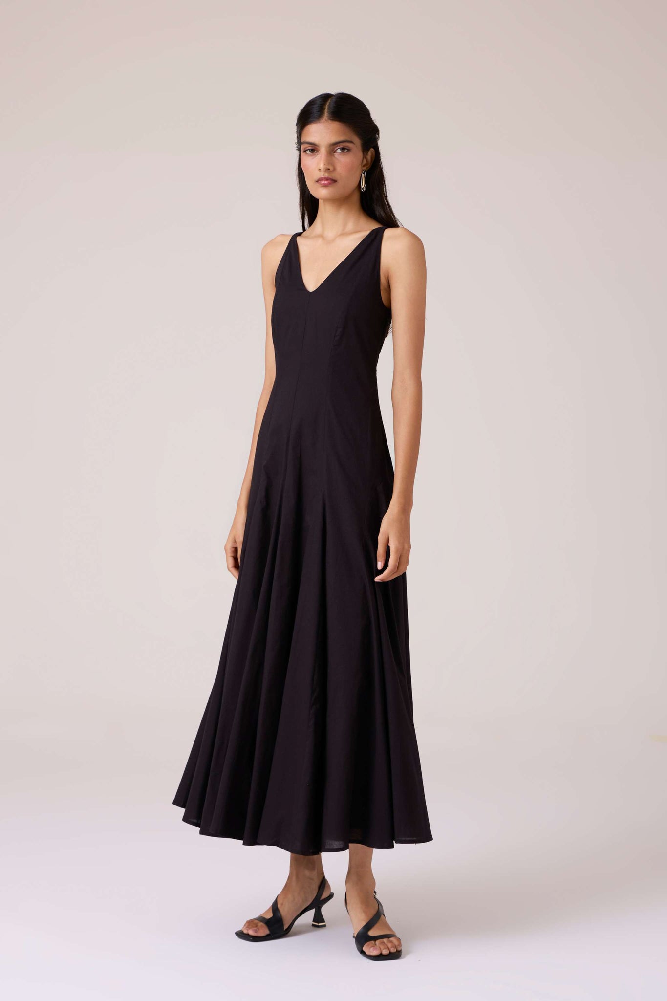 Clean planes, long lines. A V-neck dress pared back to structure, free of embellishment, steady in cut.