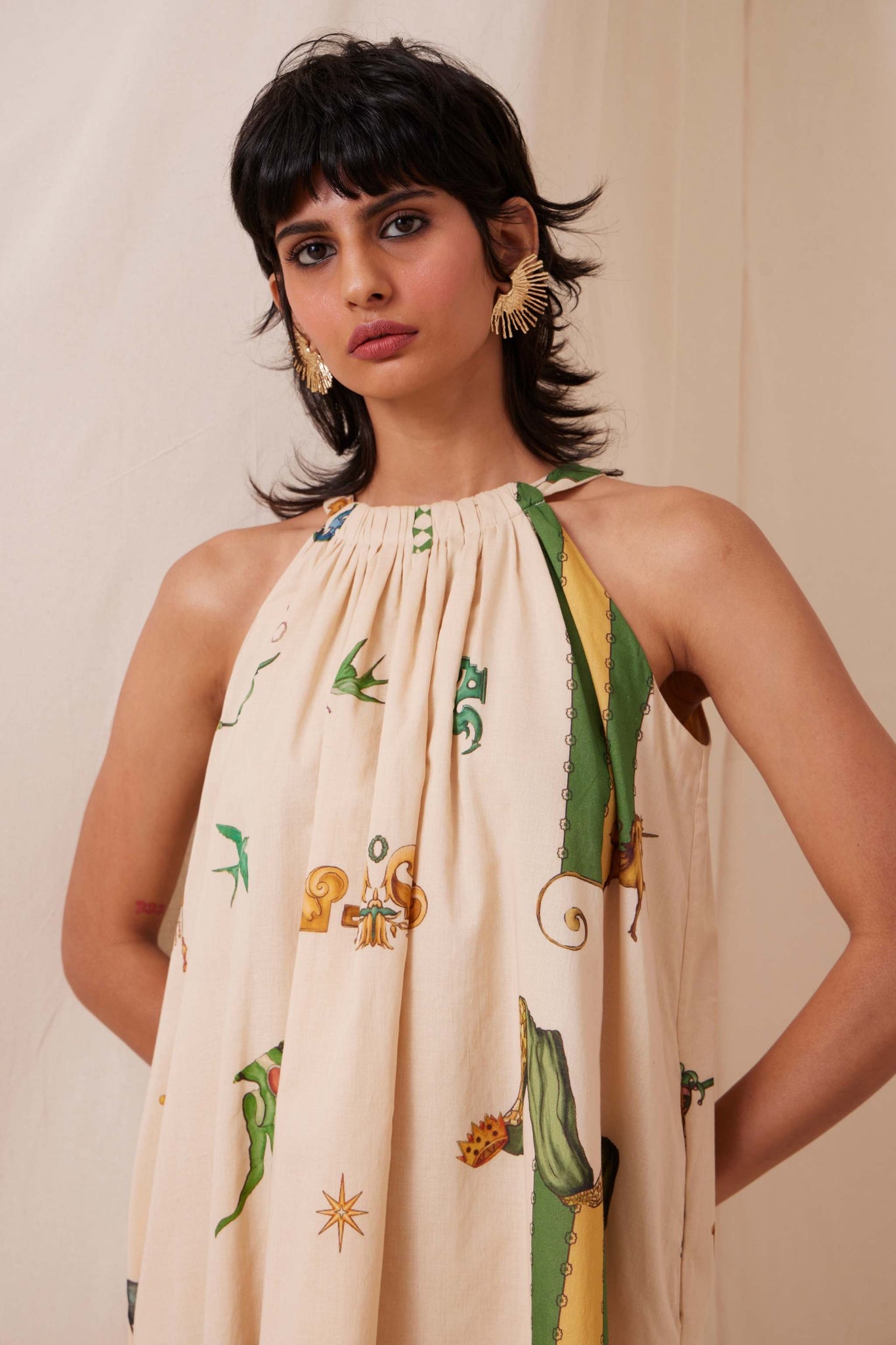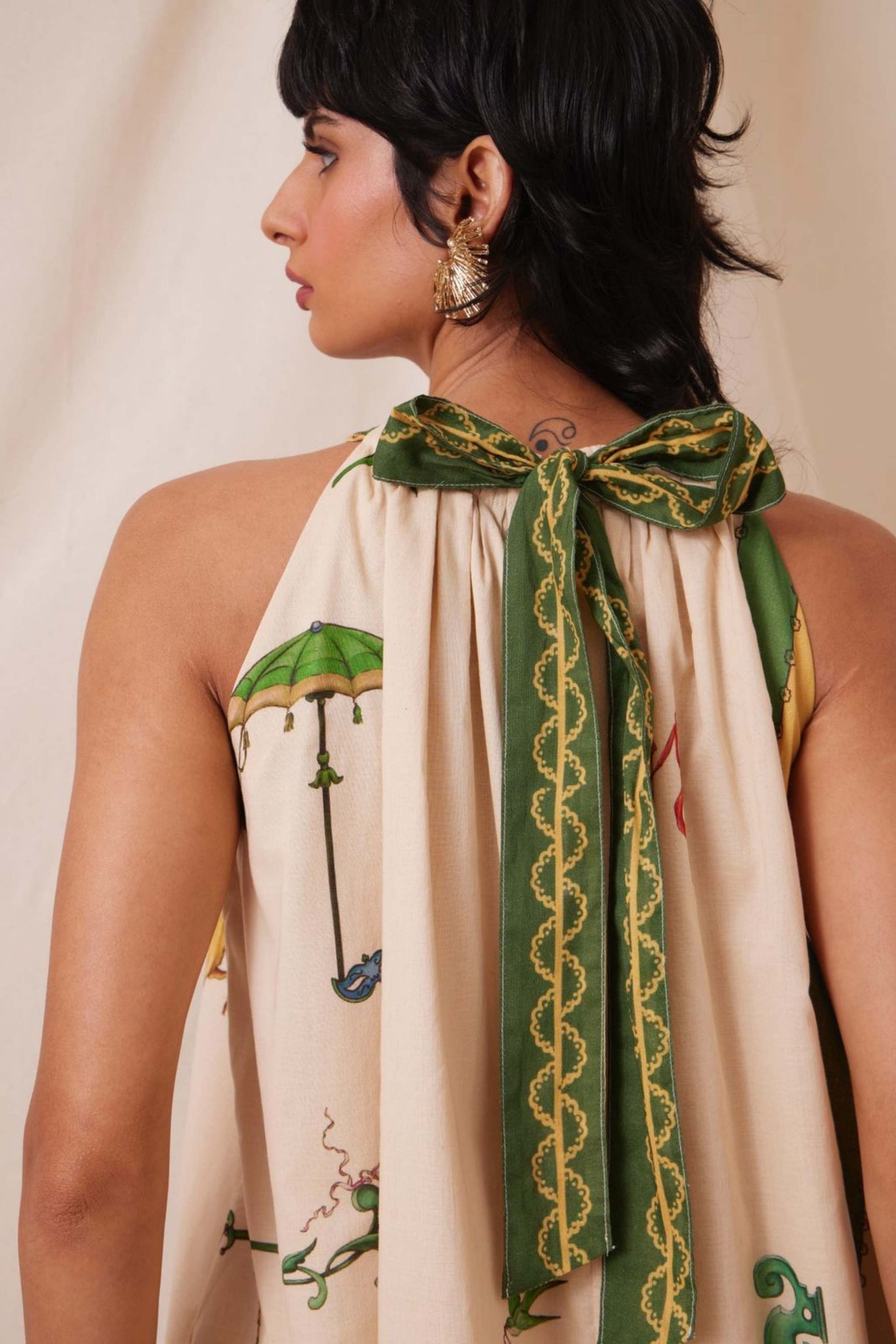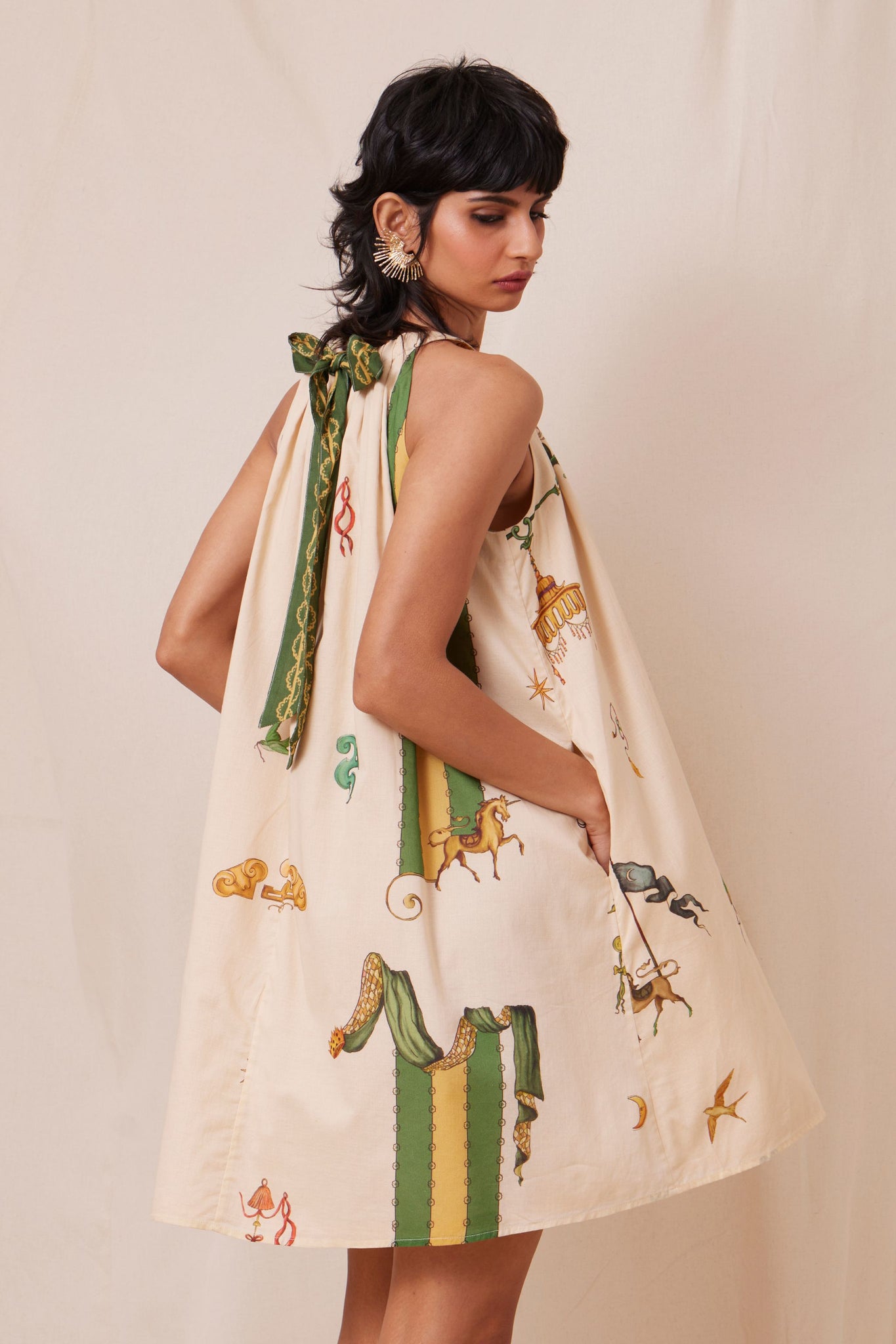 Signature print summer dress in soft cotton. Sun-kissed shoulders. Bow-tie at the back. Soft gathers at the neck for a billowy shape. Fully lined. In-seam pockets.