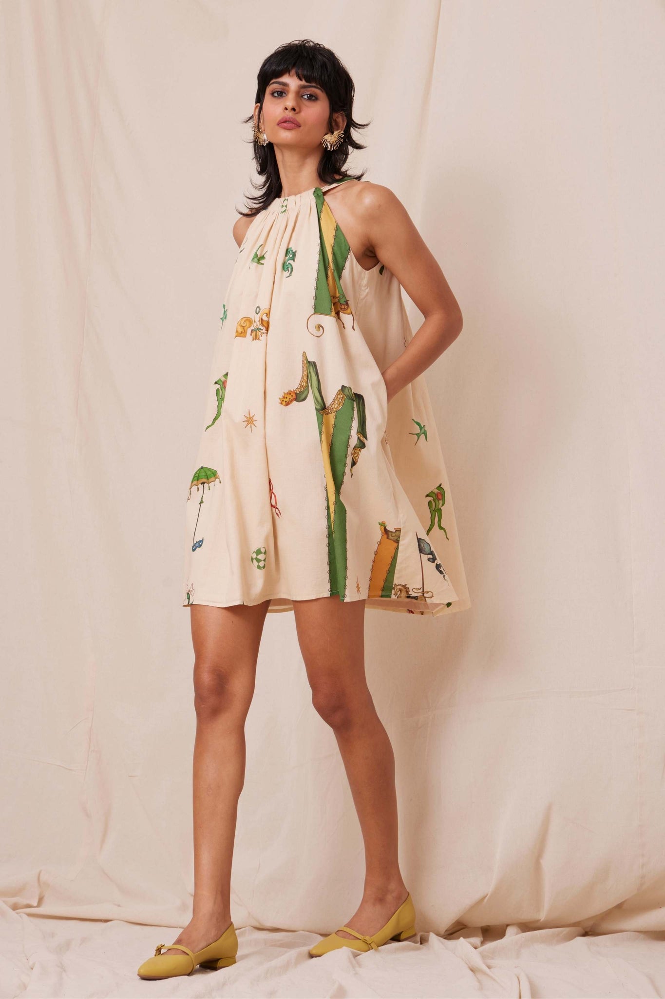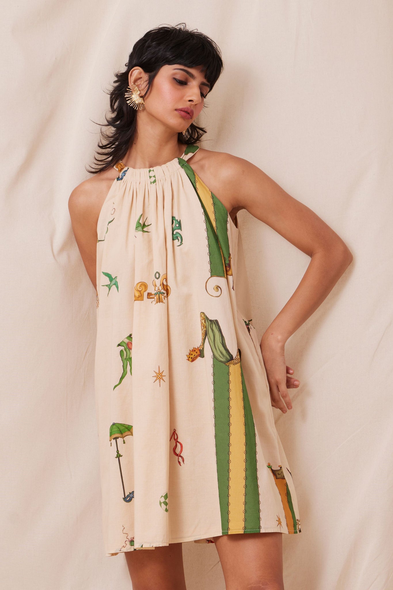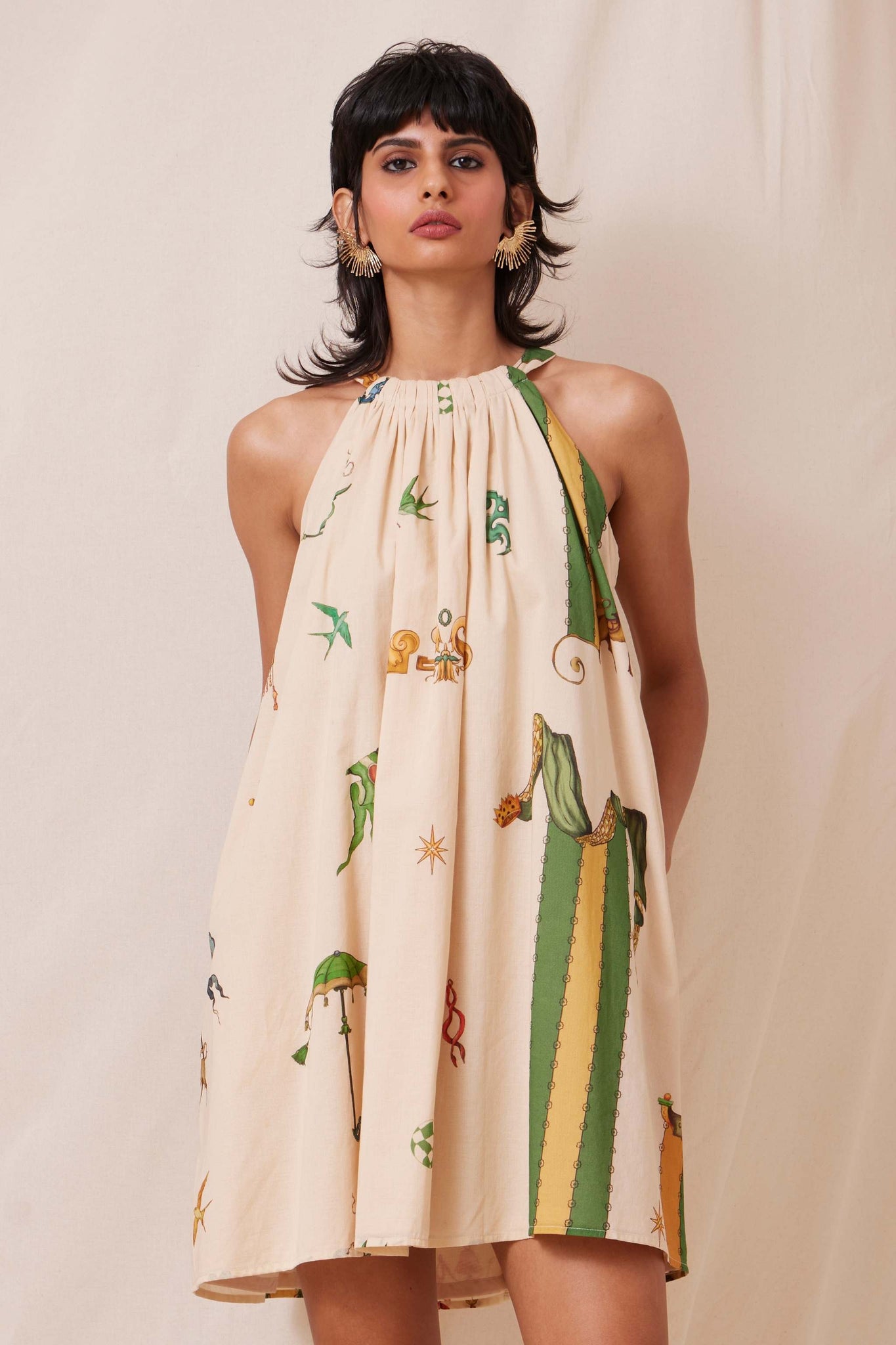 Signature print summer dress in soft cotton. Sun-kissed shoulders. Bow-tie at the back. Soft gathers at the neck for a billowy shape. Fully lined. In-seam pockets.