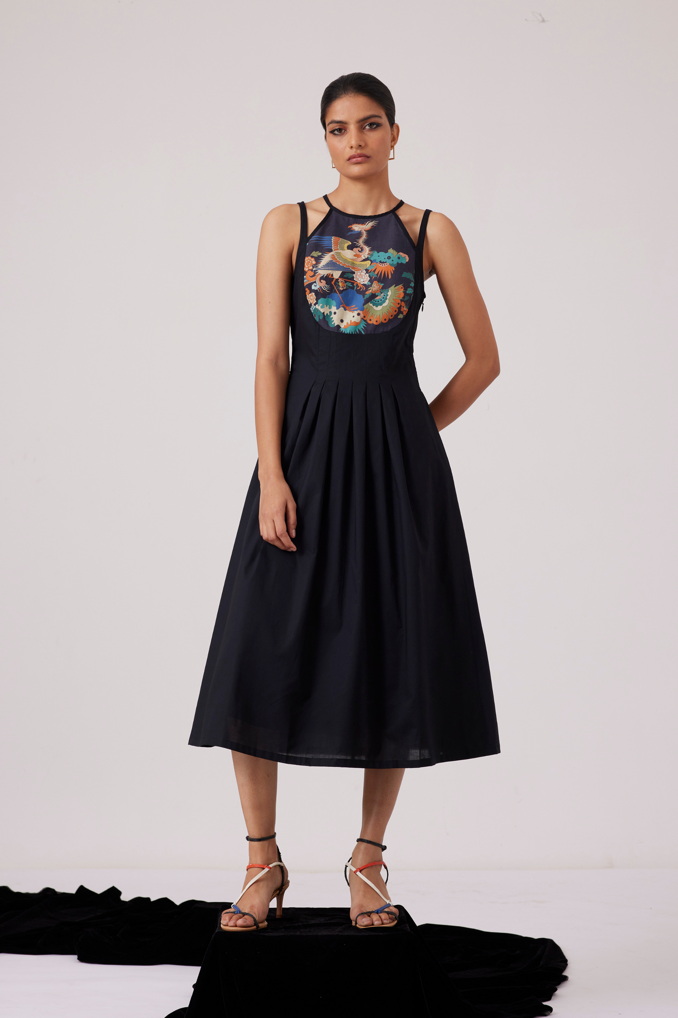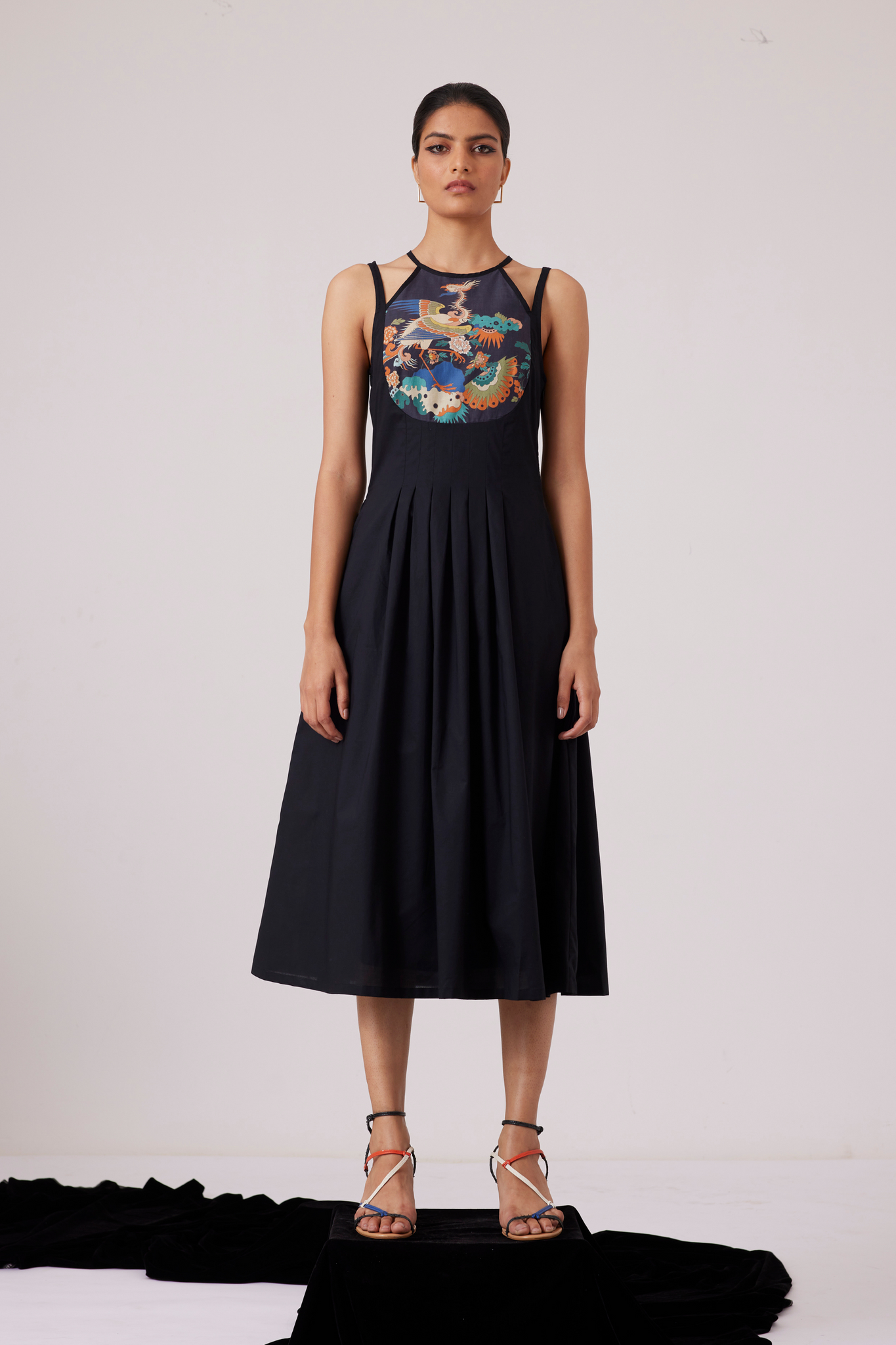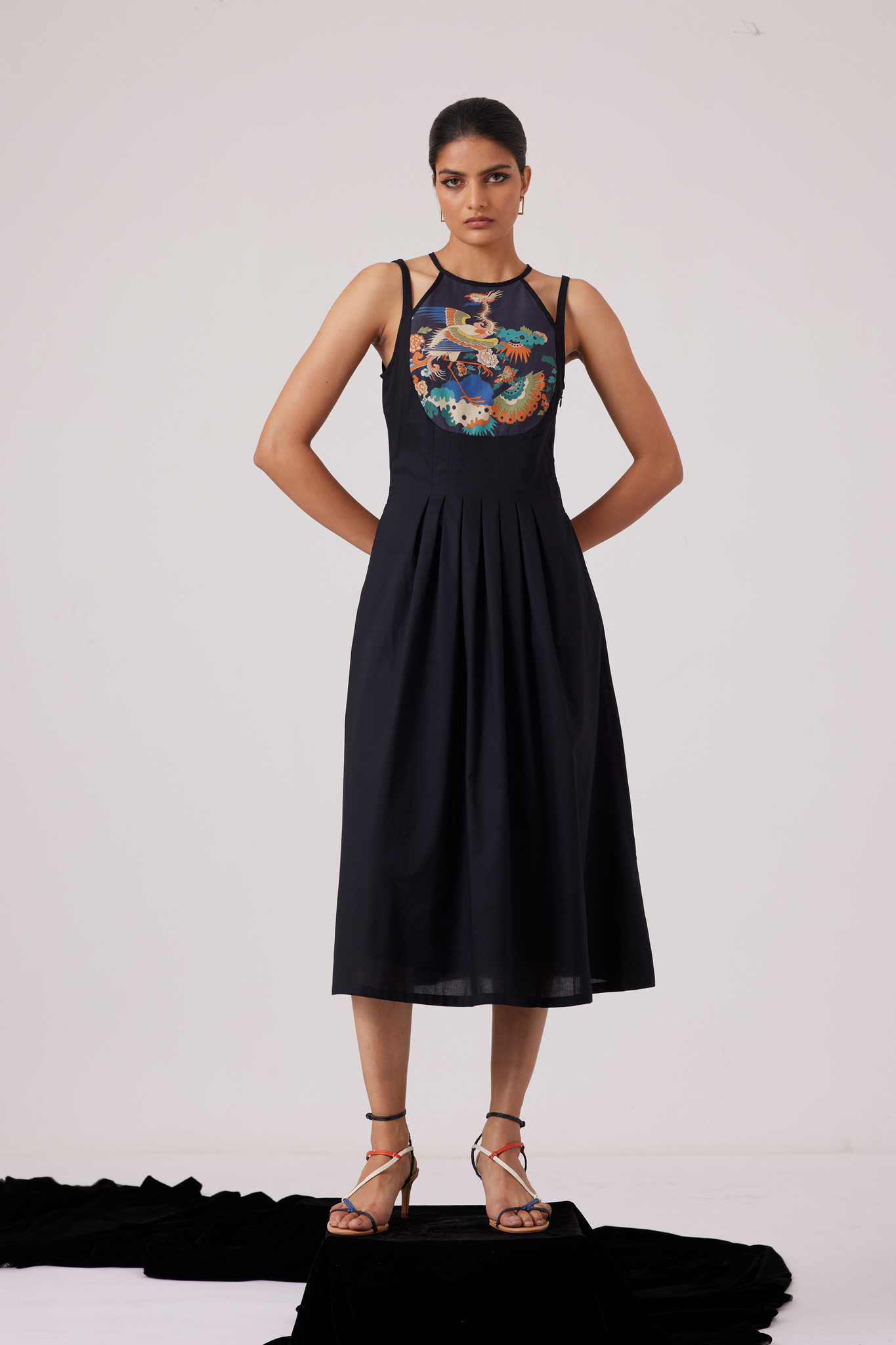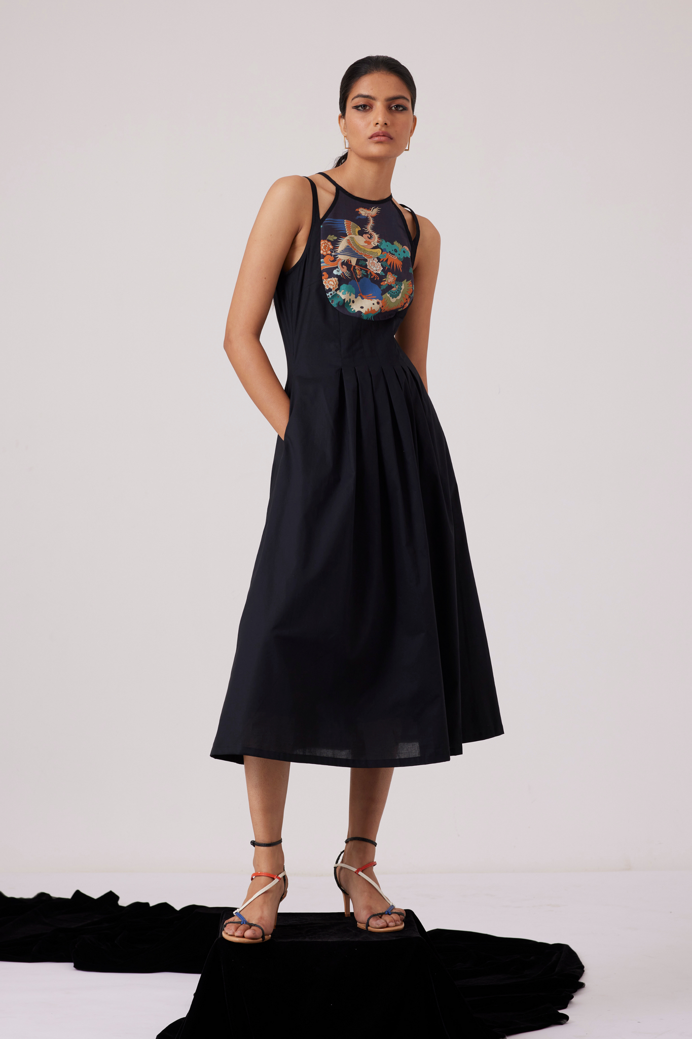 Midi-length dress with an unusual neckline makes for a polished look. Curved yoke line features our new signature print. Inverted pleats on the waistline and darts on the yoke ensure a flattering fit. In-seam pockets. Fully lined.