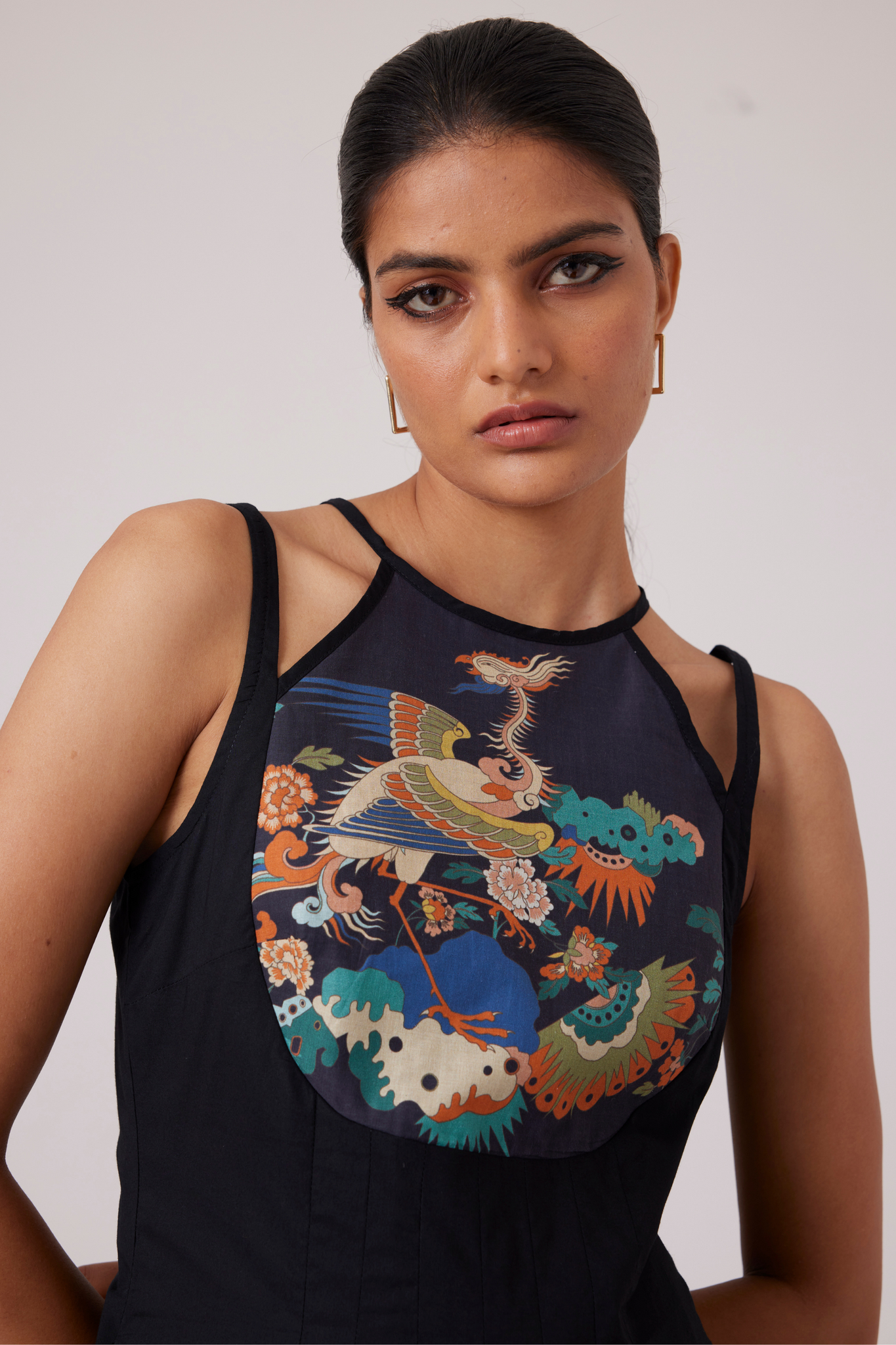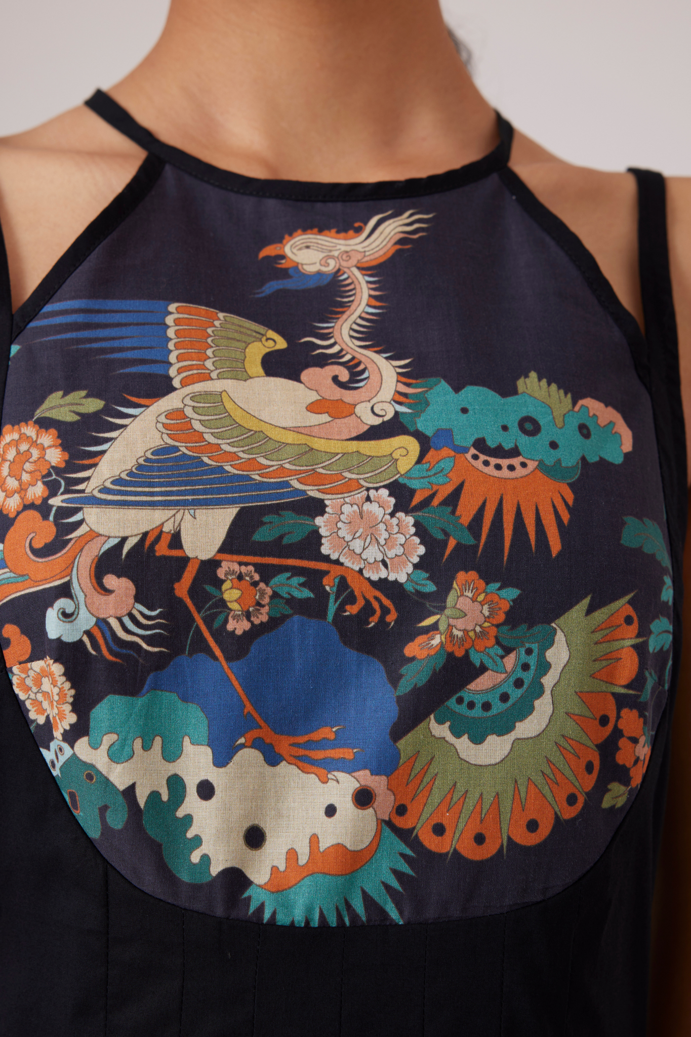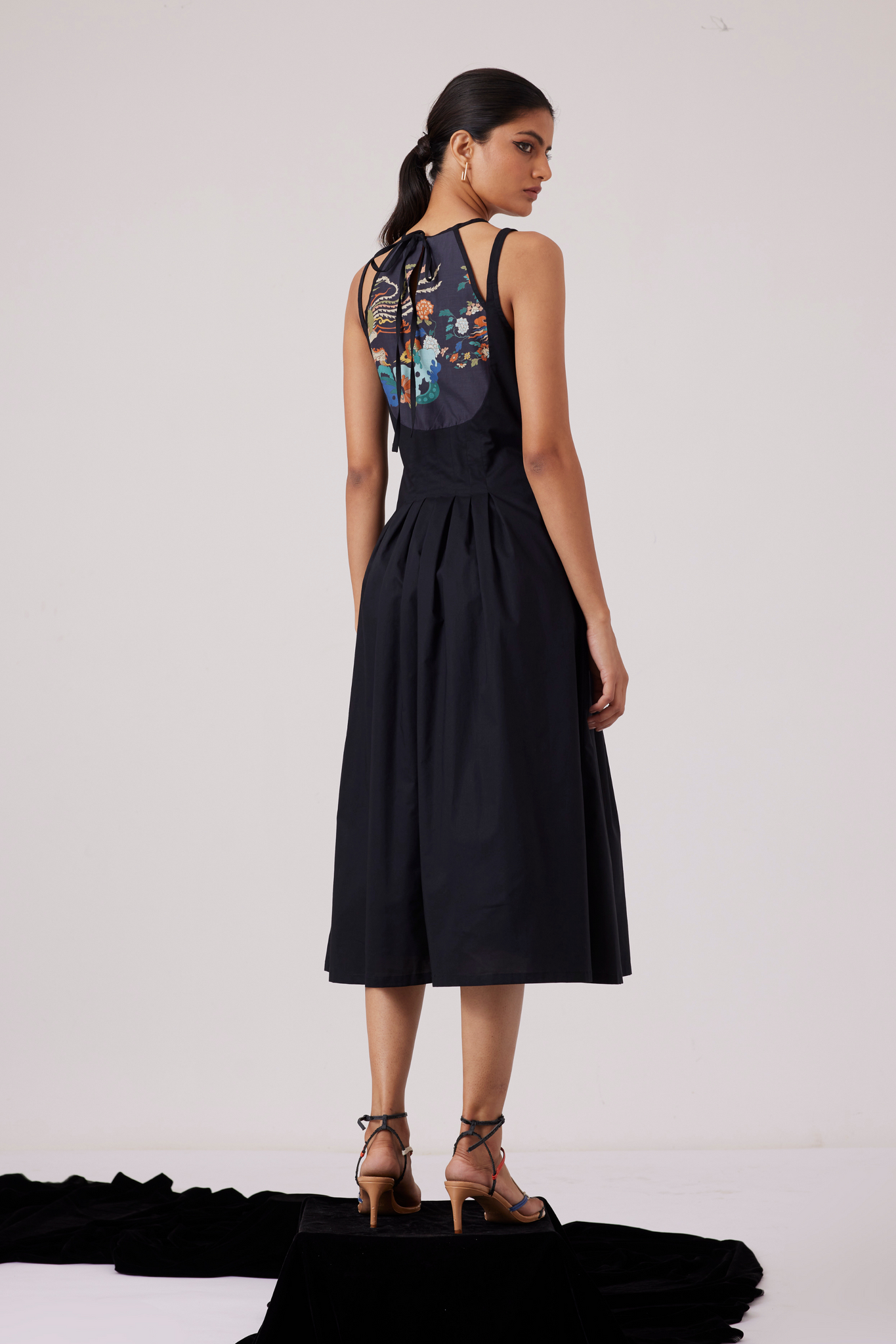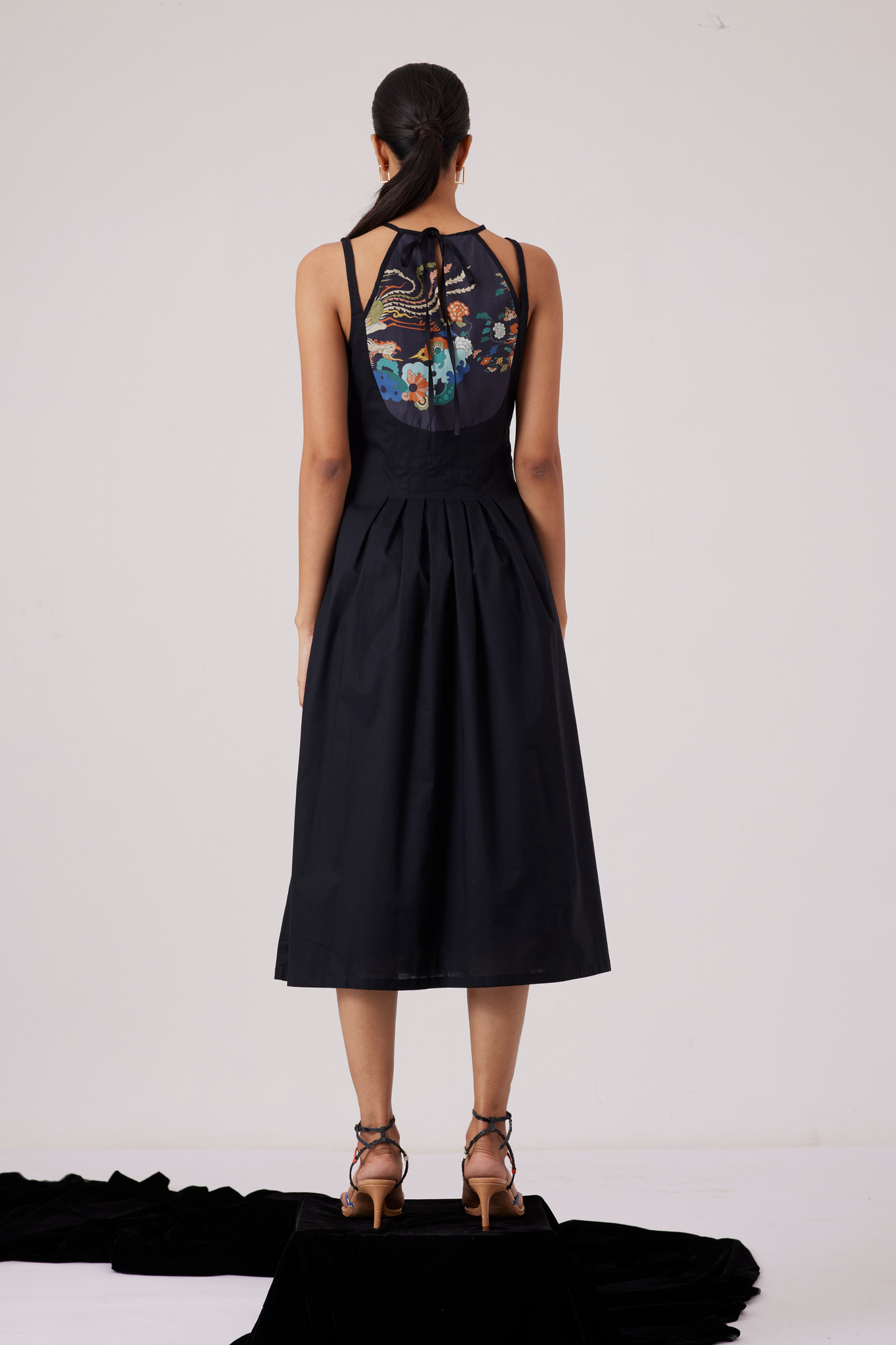 Midi-length dress with an unusual neckline makes for a polished look. Curved yoke line features our new signature print. Inverted pleats on the waistline and darts on the yoke ensure a flattering fit. In-seam pockets. Fully lined.