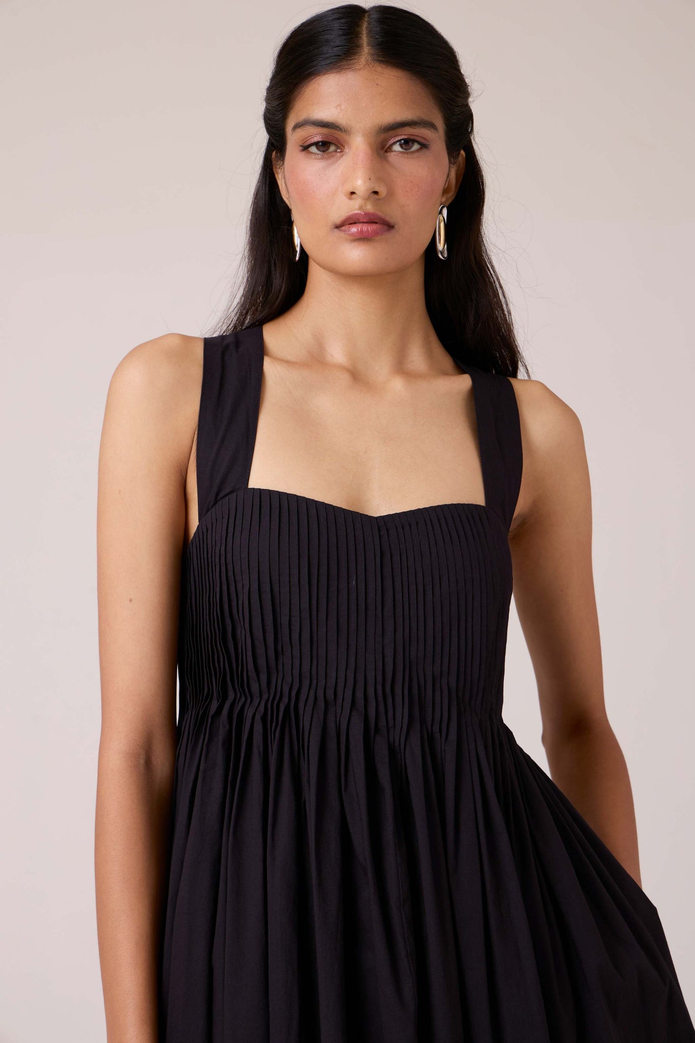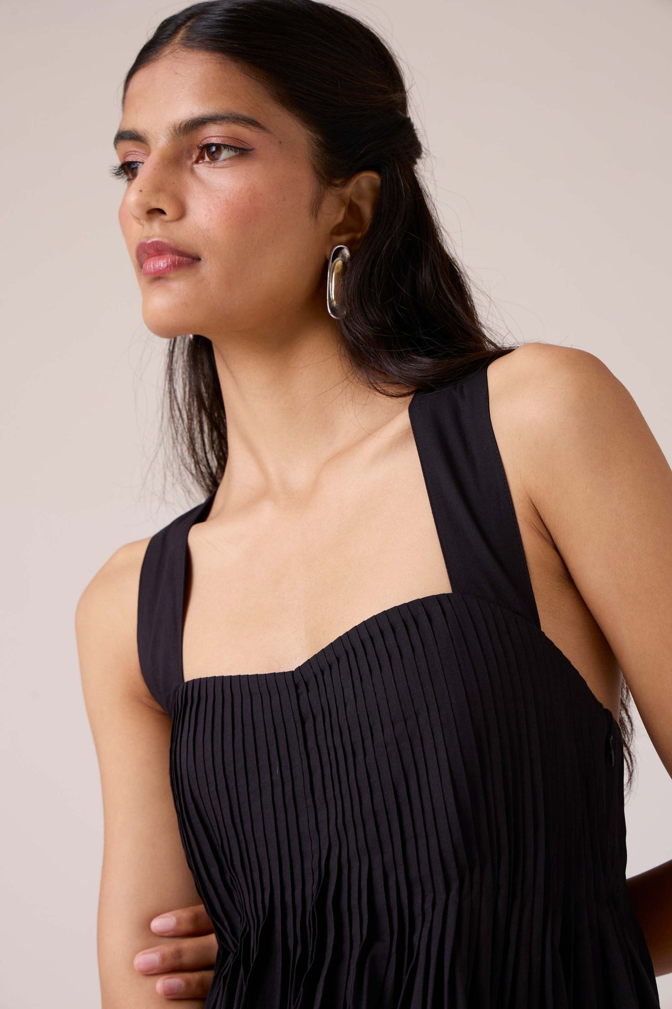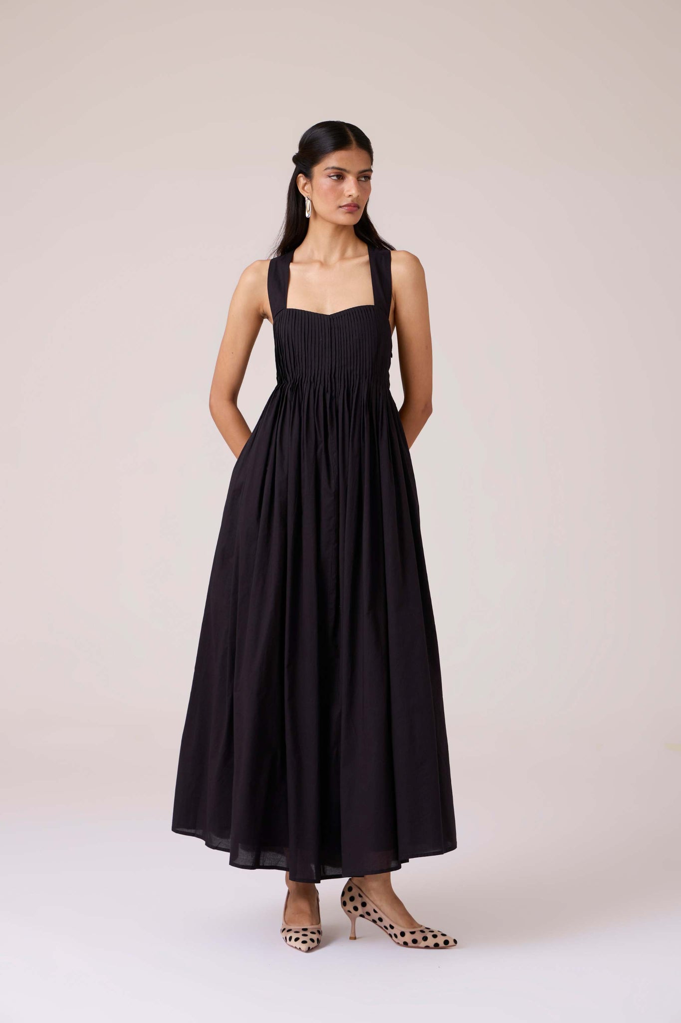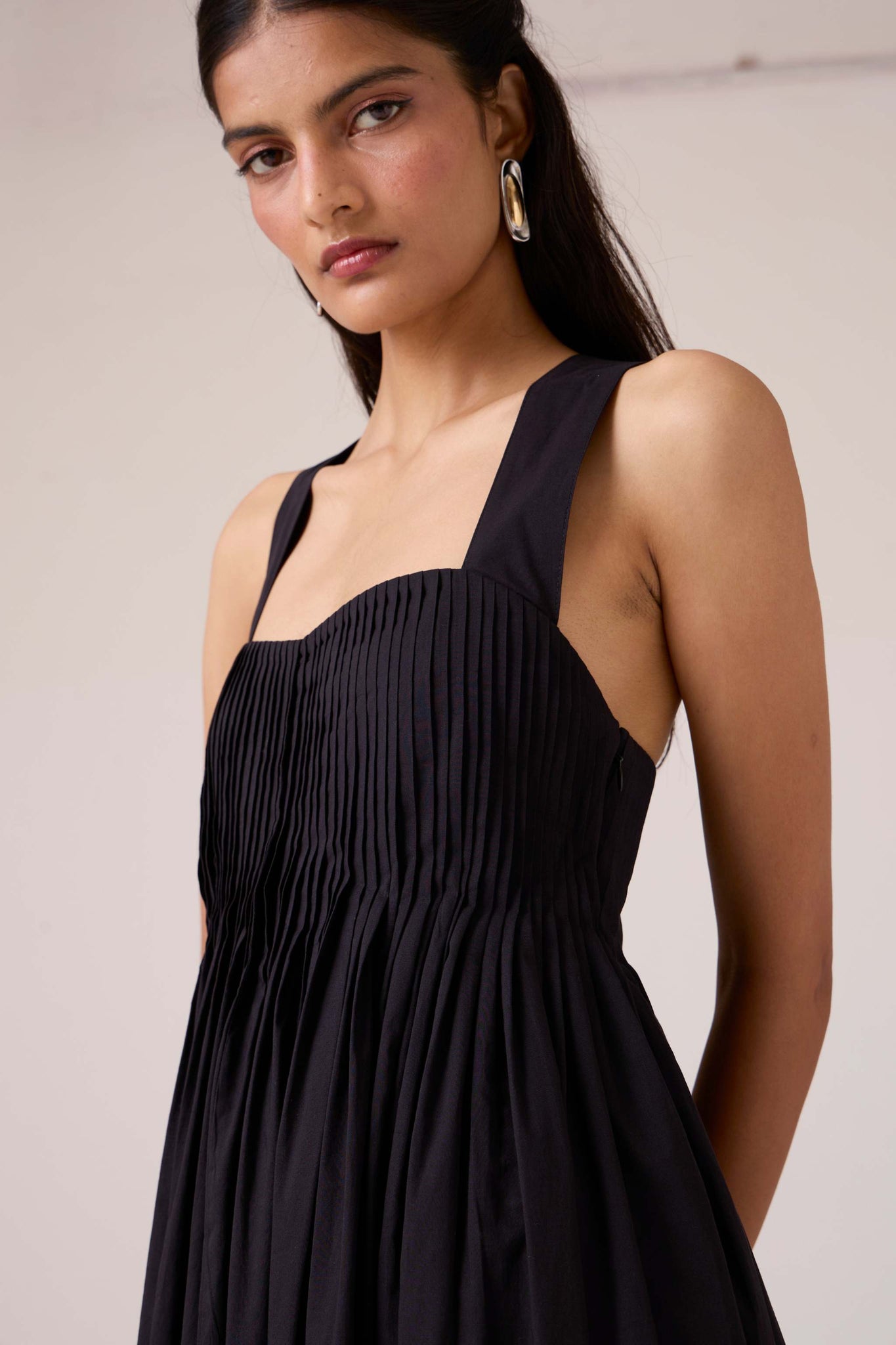 Pleats release into volume, guided from a sharp neckline. A dress that begins in order and dissolves into movement.