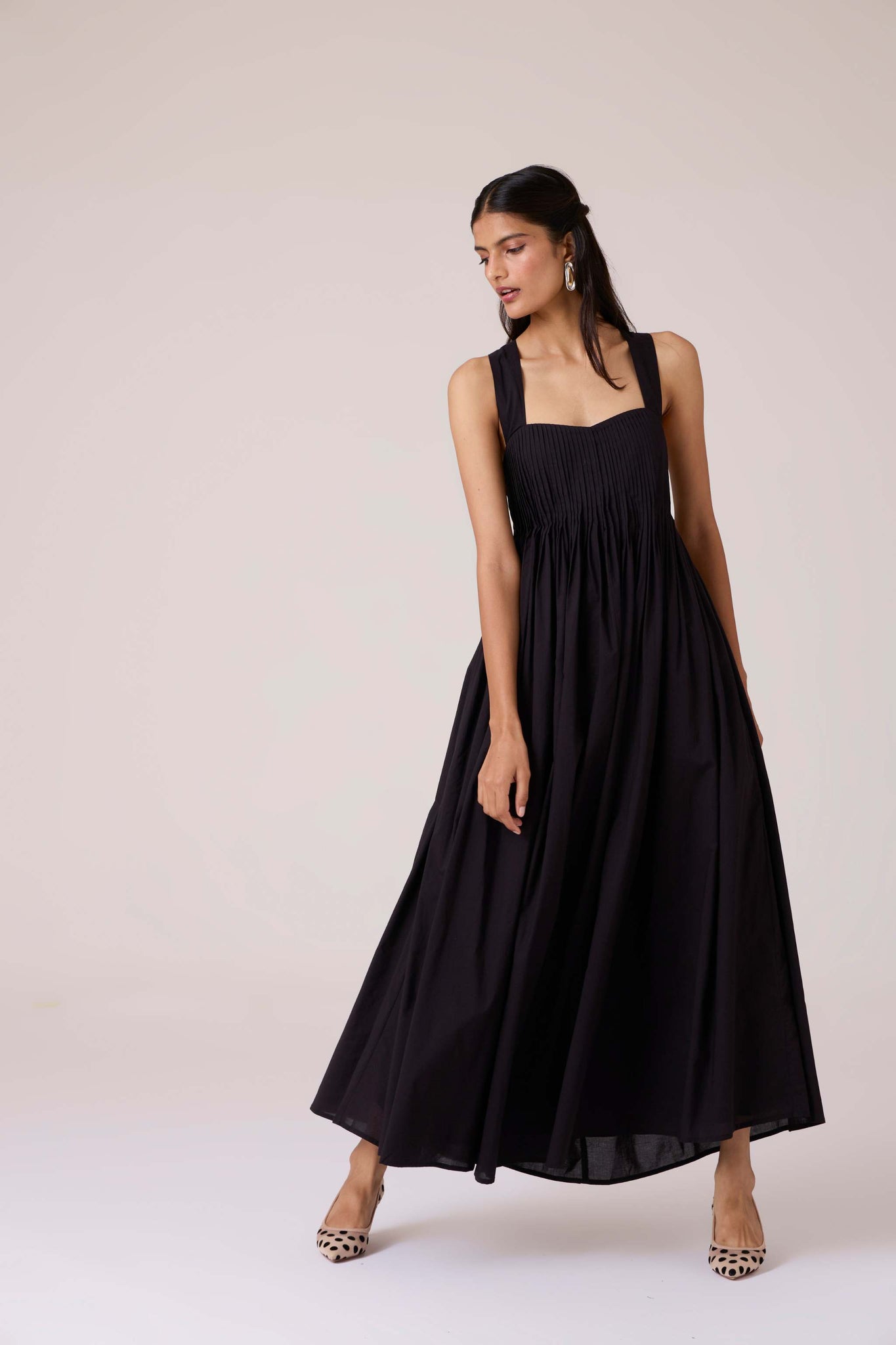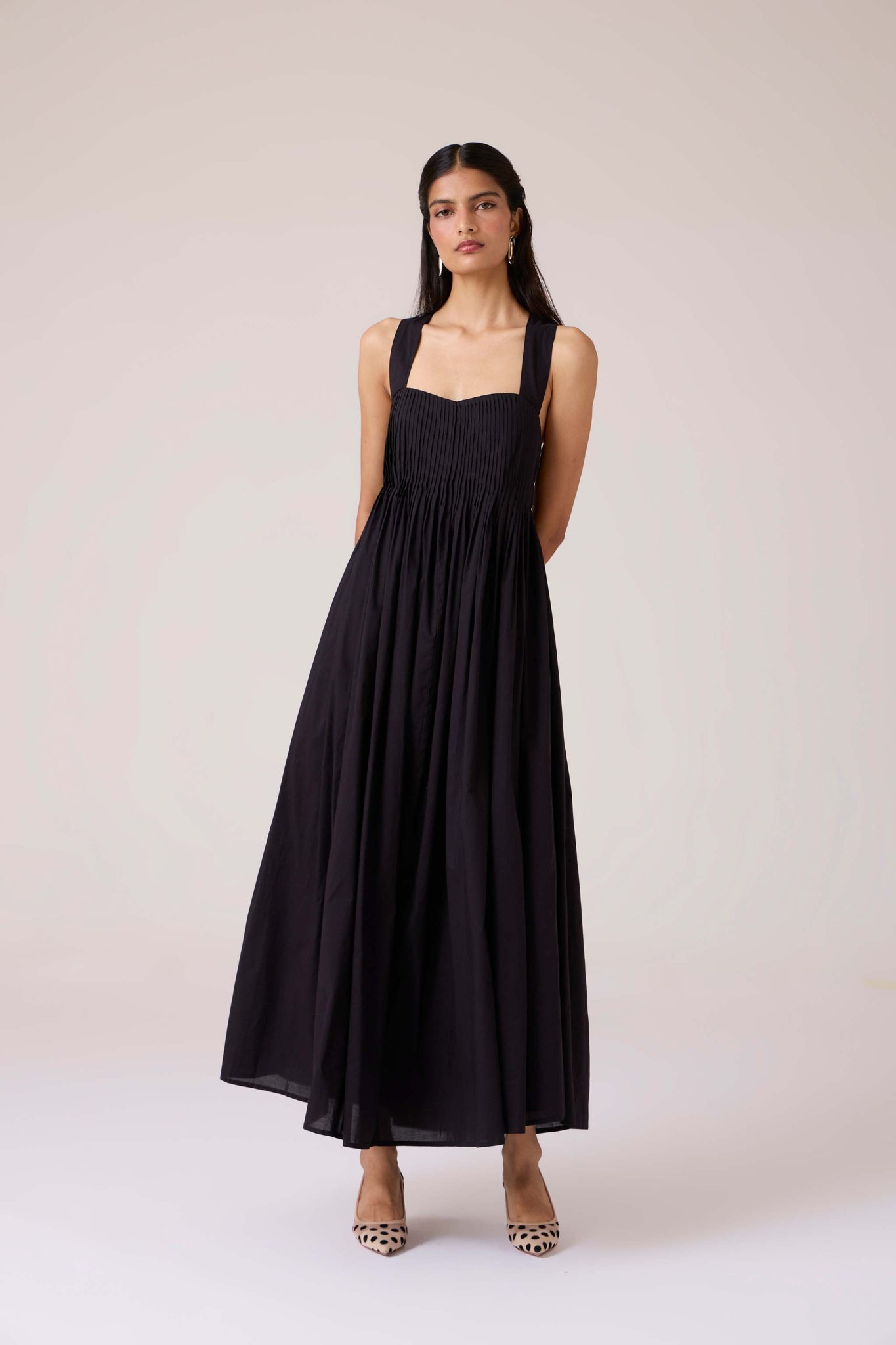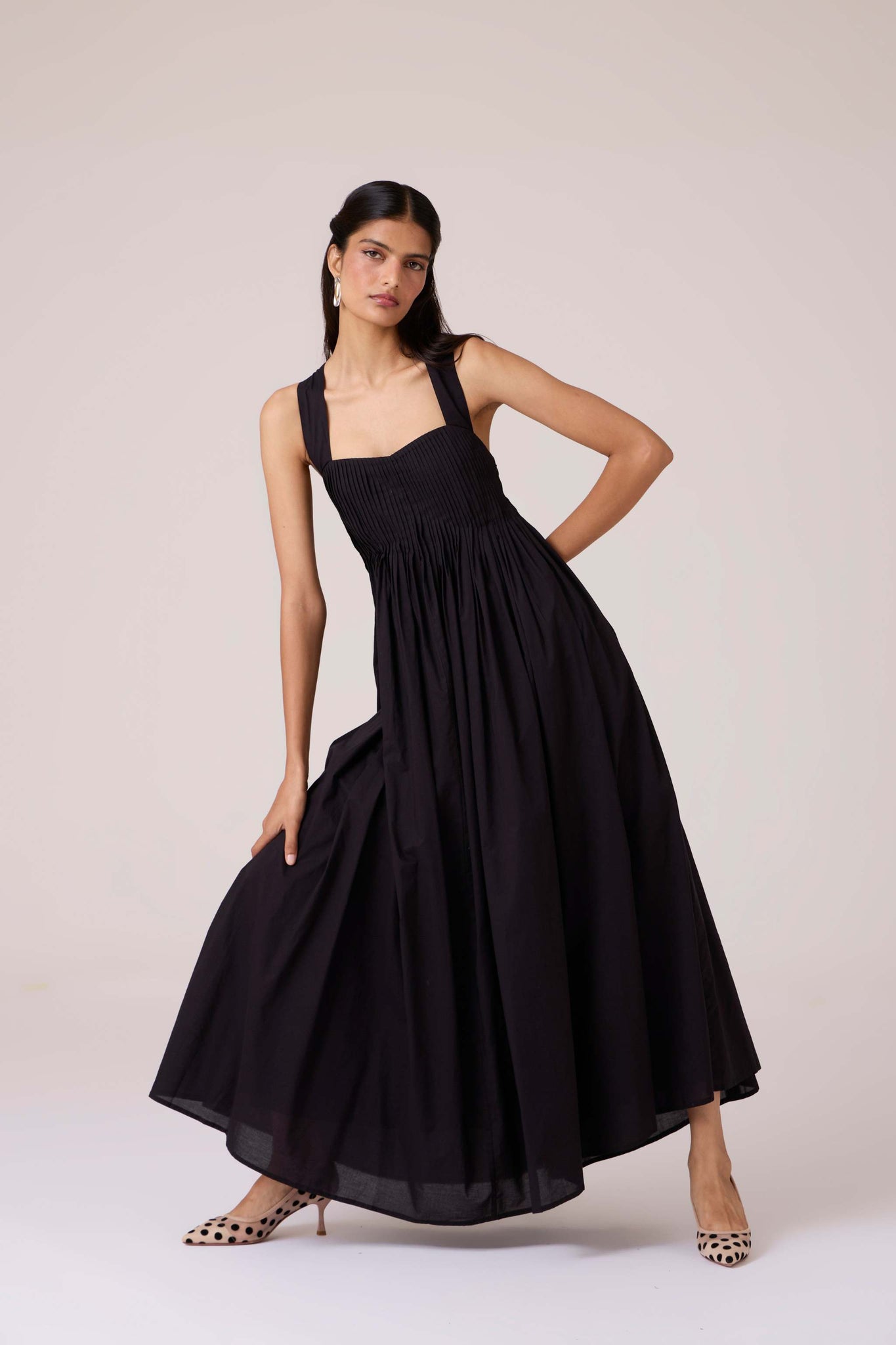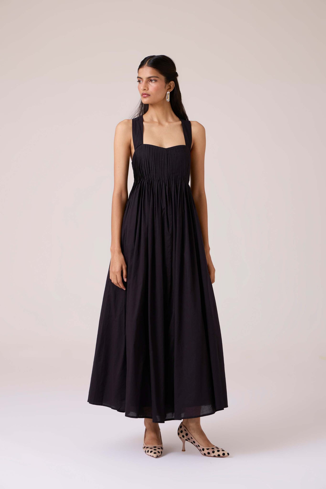 Pleats release into volume, guided from a sharp neckline. A dress that begins in order and dissolves into movement.