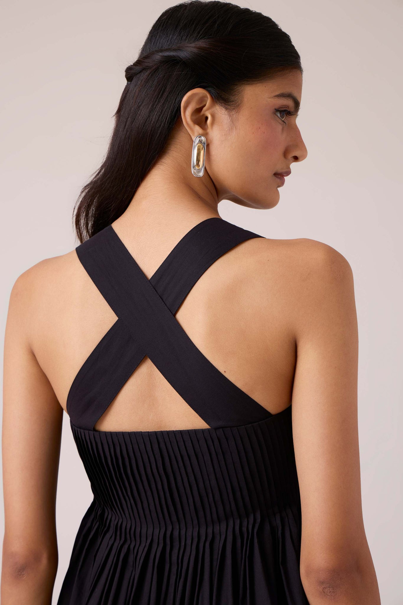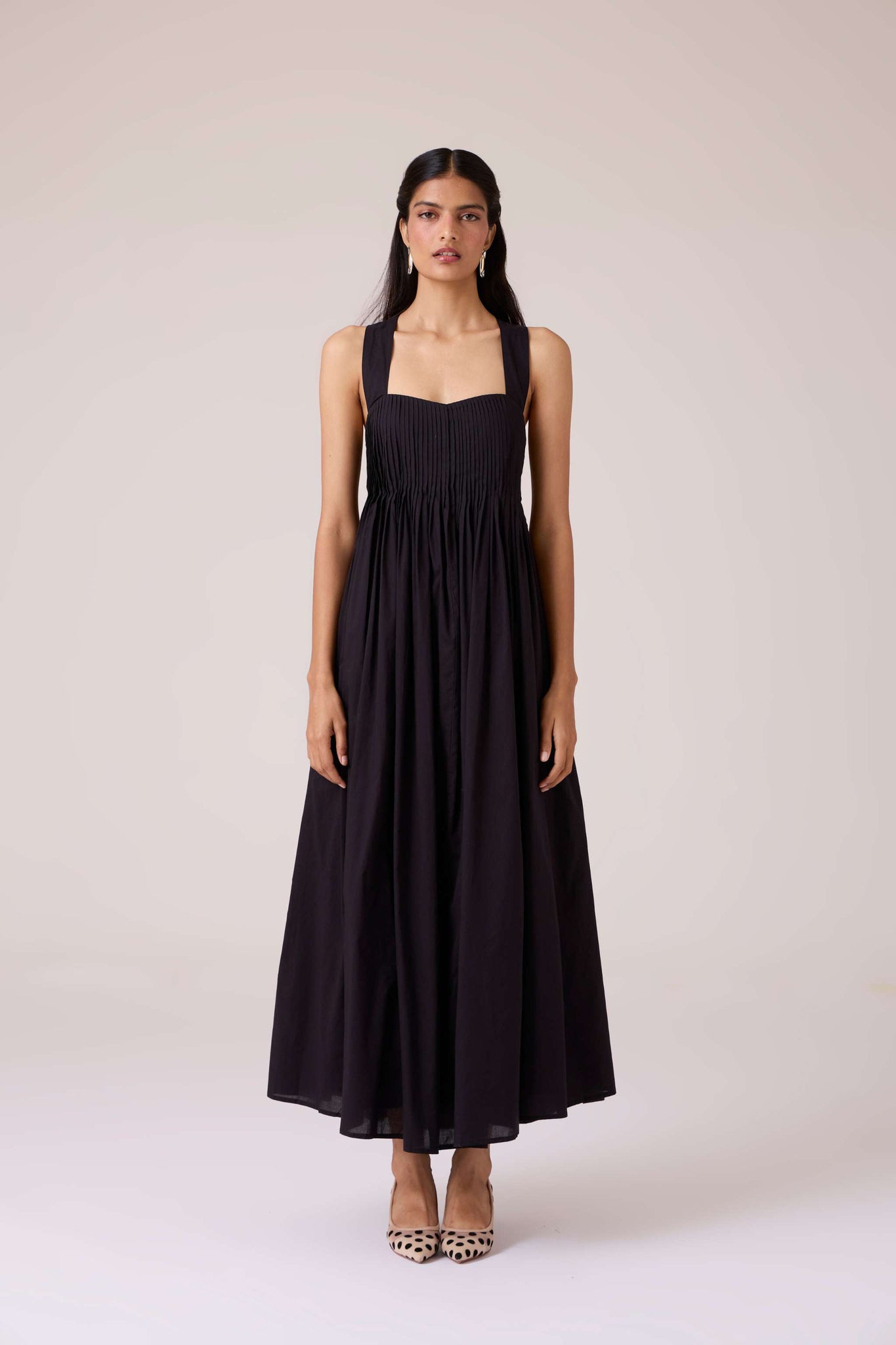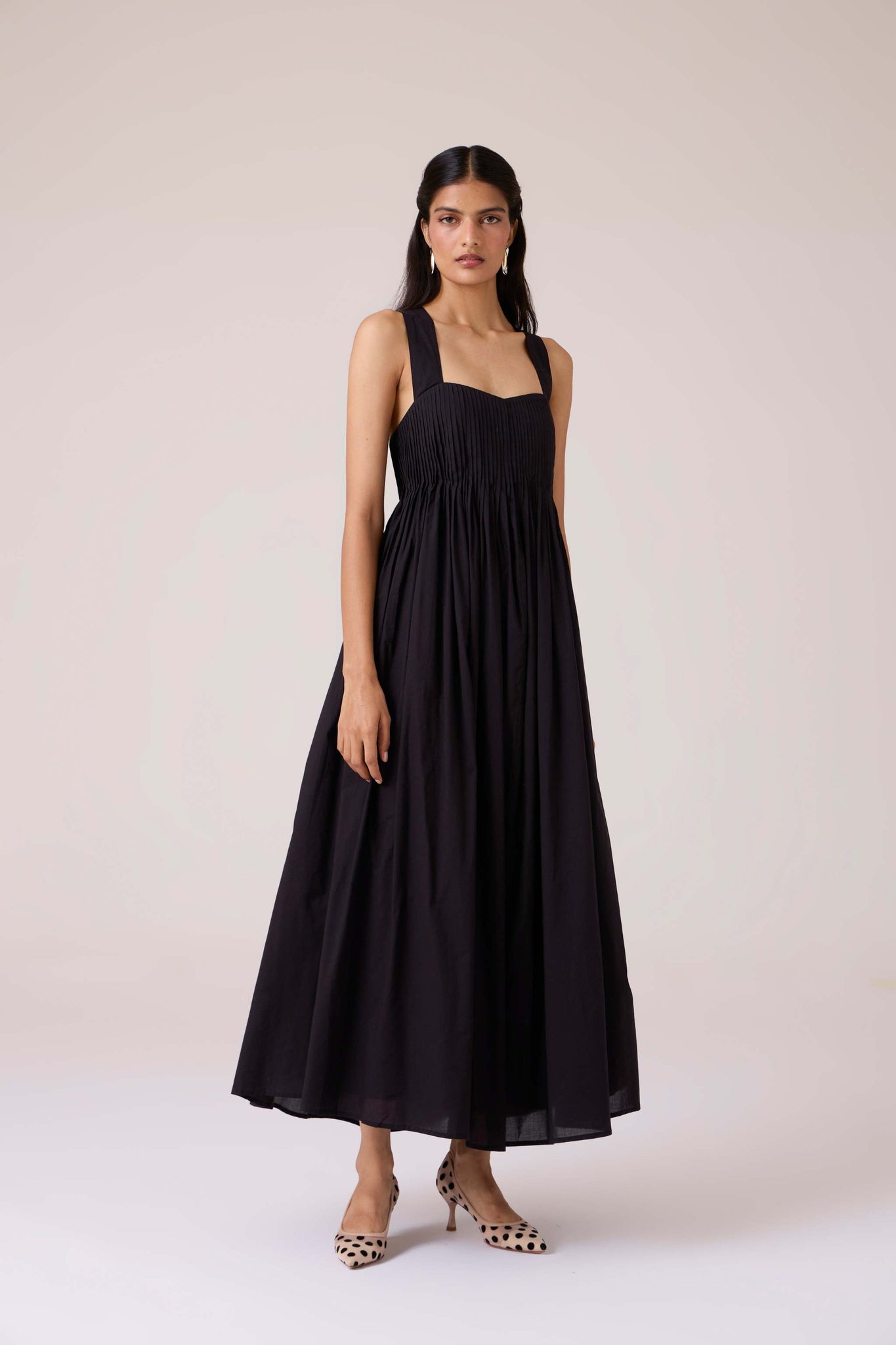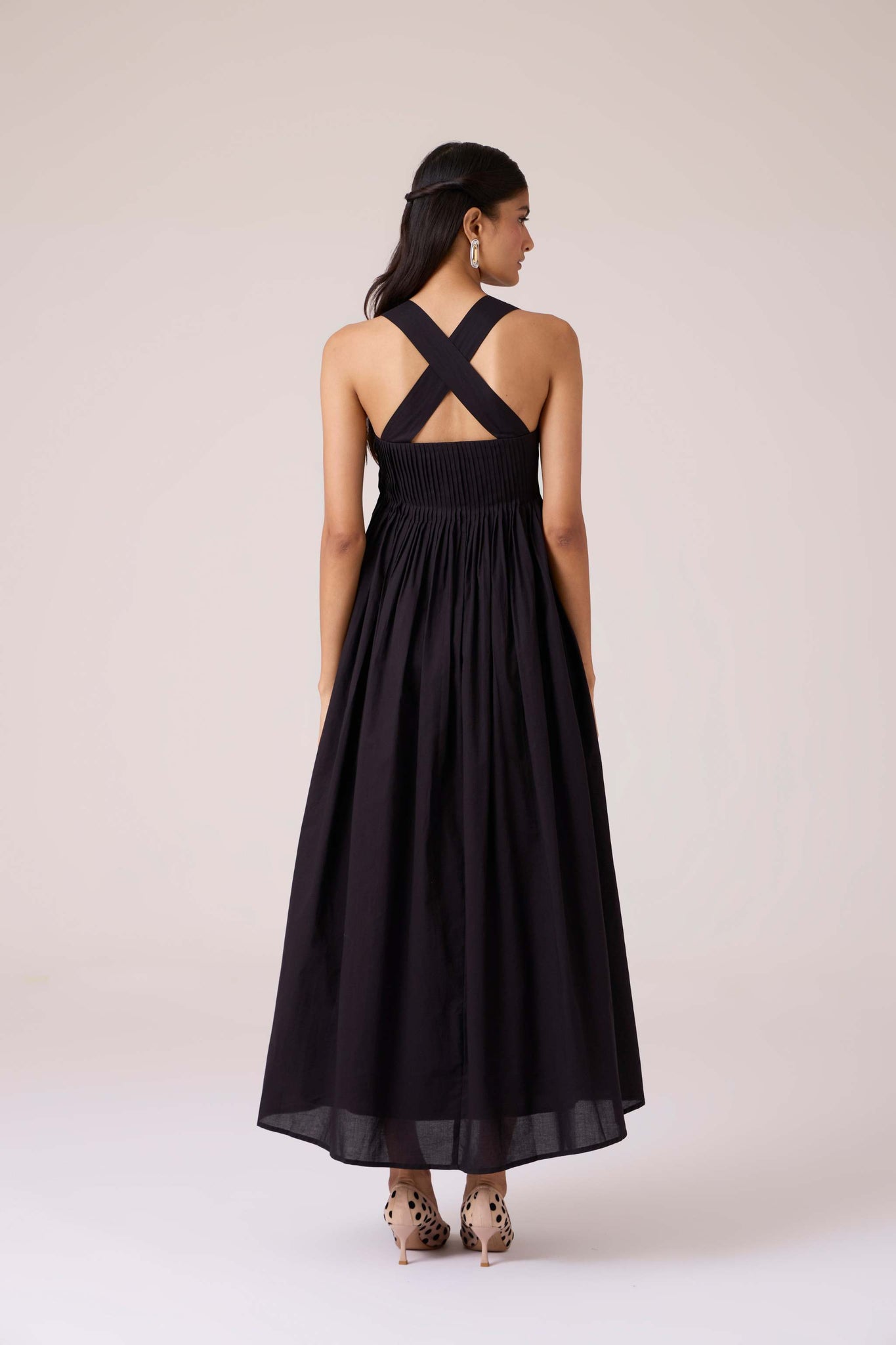 Pleats release into volume, guided from a sharp neckline. A dress that begins in order and dissolves into movement.