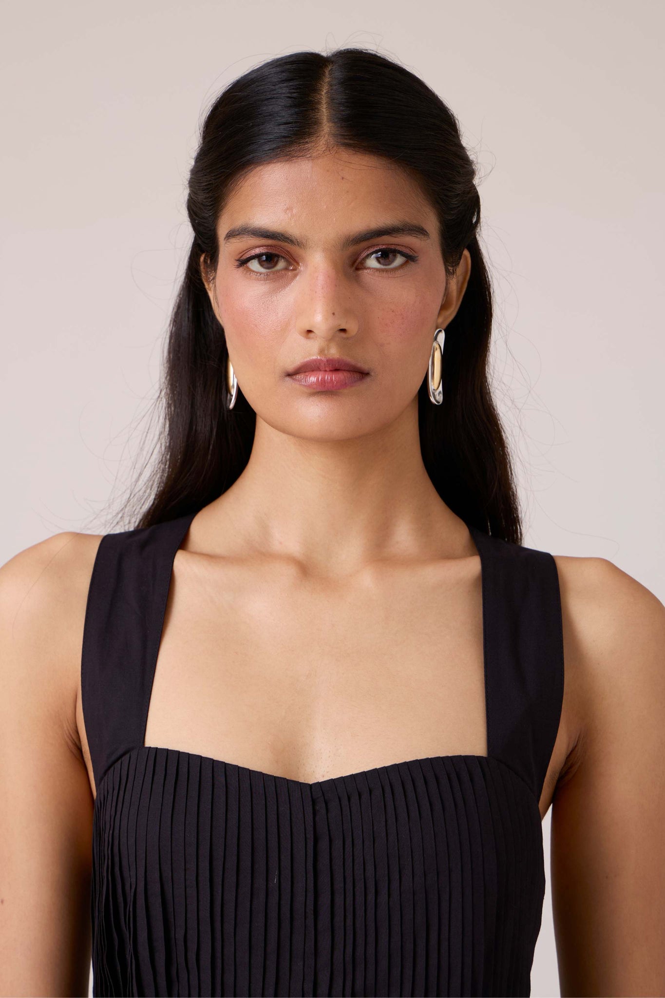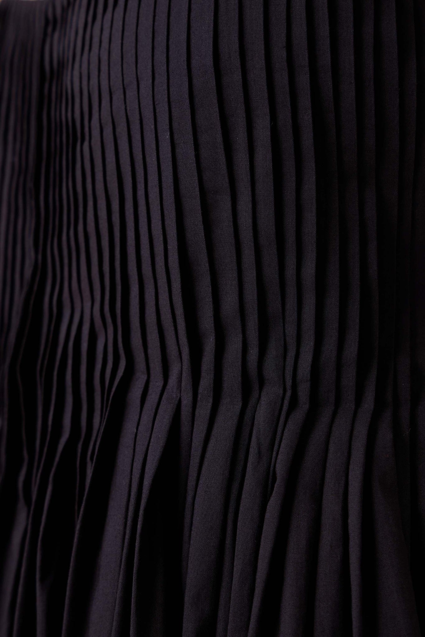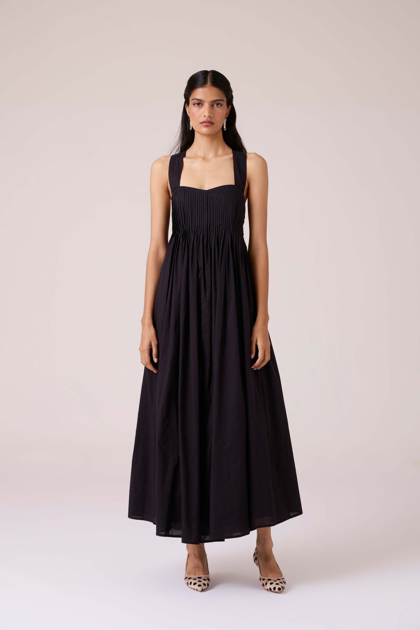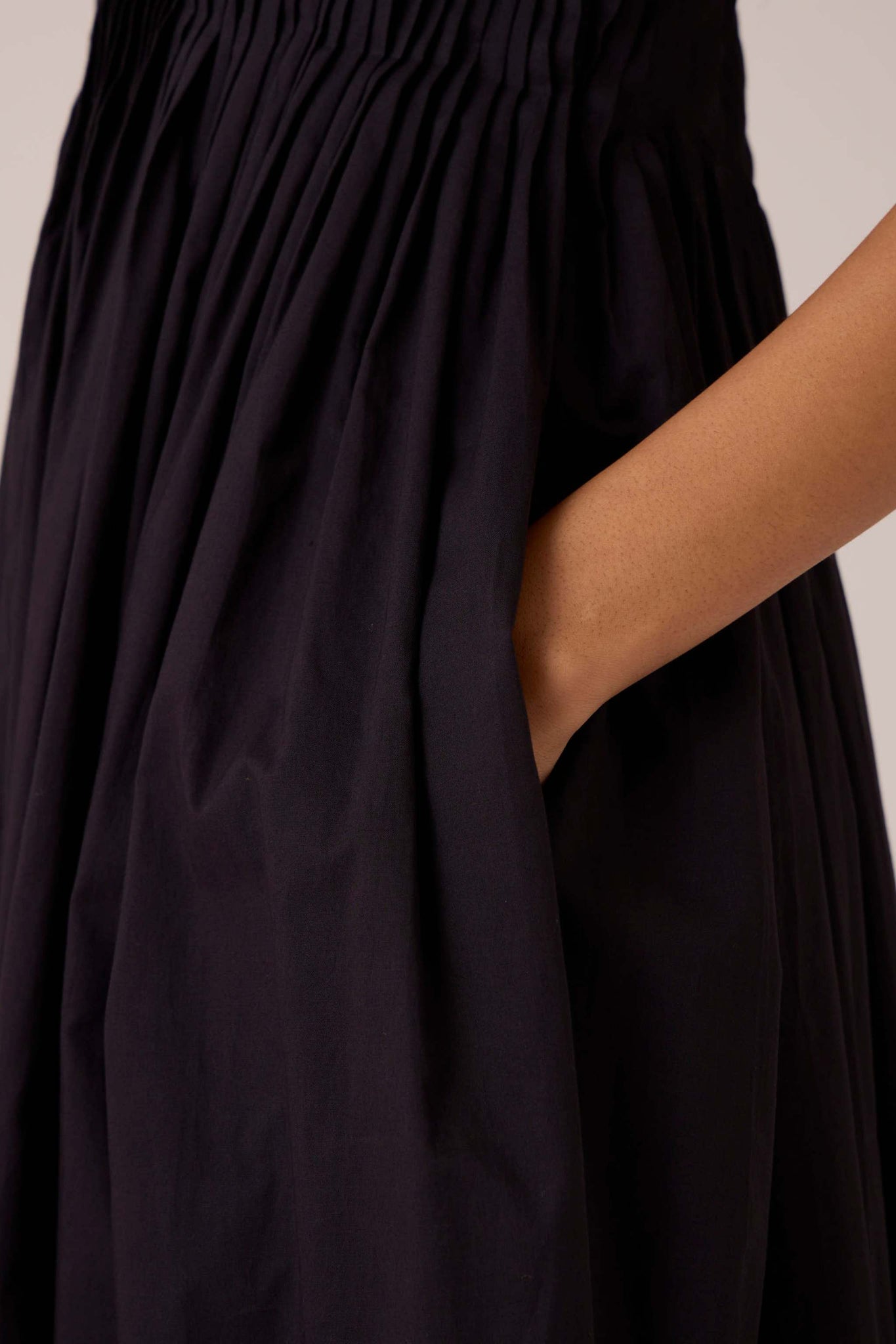 Pleats release into volume, guided from a sharp neckline. A dress that begins in order and dissolves into movement.